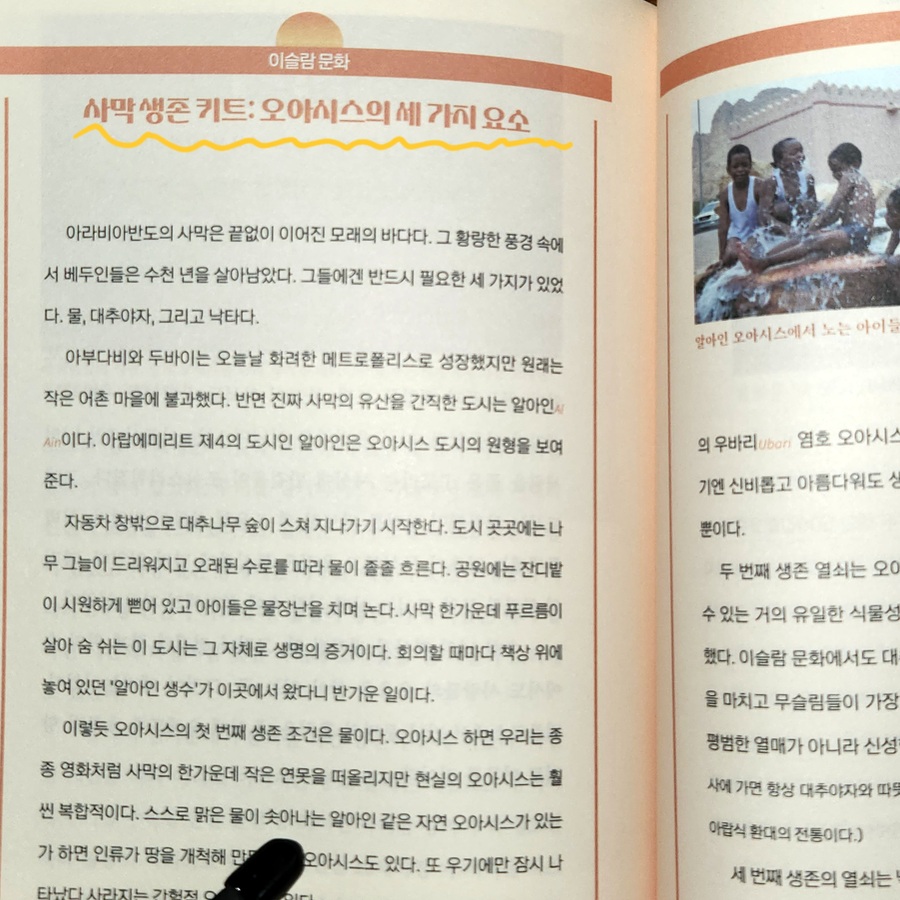 저자는 무함마드 탄신일 연휴를 맞아 아랍에미리트와 국경을 맞댄 오만으로 떠난다. 오만 편을 읽으며 나는 ‘무함마드’가 내가 익숙하게 알고 있던 ‘마호메트’와 같은 인물이며, 이슬람력이 음력을 사용하기 때문에 무함마드 탄신일의 양력 날짜가 해마다 달라진다는 사실을 알게 되었다. 와디 샤브, 비마 싱크홀, 제벨 아크다르, 니즈와의 새벽 가축시장, 무산담 바다에서의 돌고래 관찰과 스노클링 체험도 흥미로웠지만, 무엇보다 《아라비안 나이트》 속 신드바드의 전설이 태어난 무대라는 점이 마음을 끌었다. 만약 내가 오만에 간다면, 조용하고 진정성 있는 아라비안 나이트의 분위기 속에서 자연 그대로의 사막을 경험할 수 있다는 오만의 사막 캠프를 꼭 체험해보고 싶다.