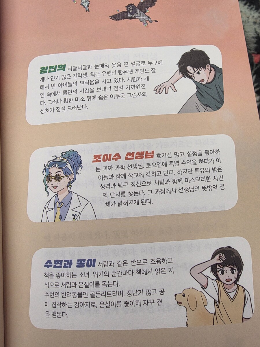 강리호와 황진혁 설명이 바뀐거 아닌가요? 아이가 시간고양이를 너무 좋아해서 예약구매하고 작가님 친필싸인본 받은건데 받자마자 펼치더니 등장인물 소개가 바뀐것 같다고 하네요 내용은 너무 기대된다며 재밌게 읽고 있는데 이 부분은 수정되어야 할 것 같네요. |