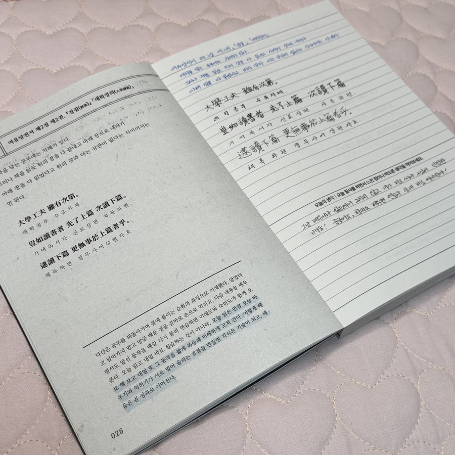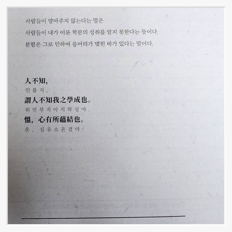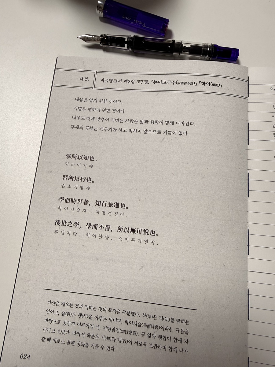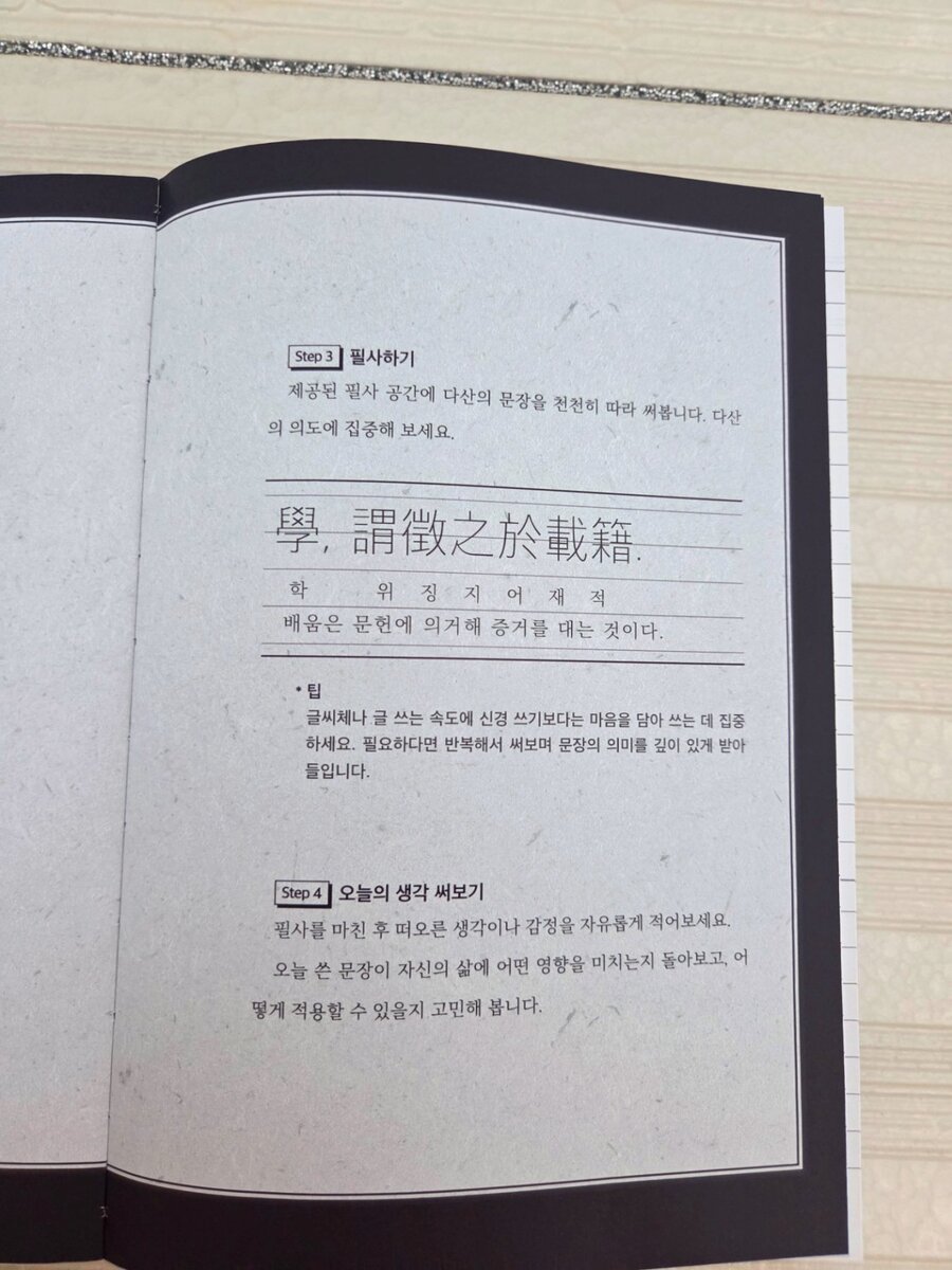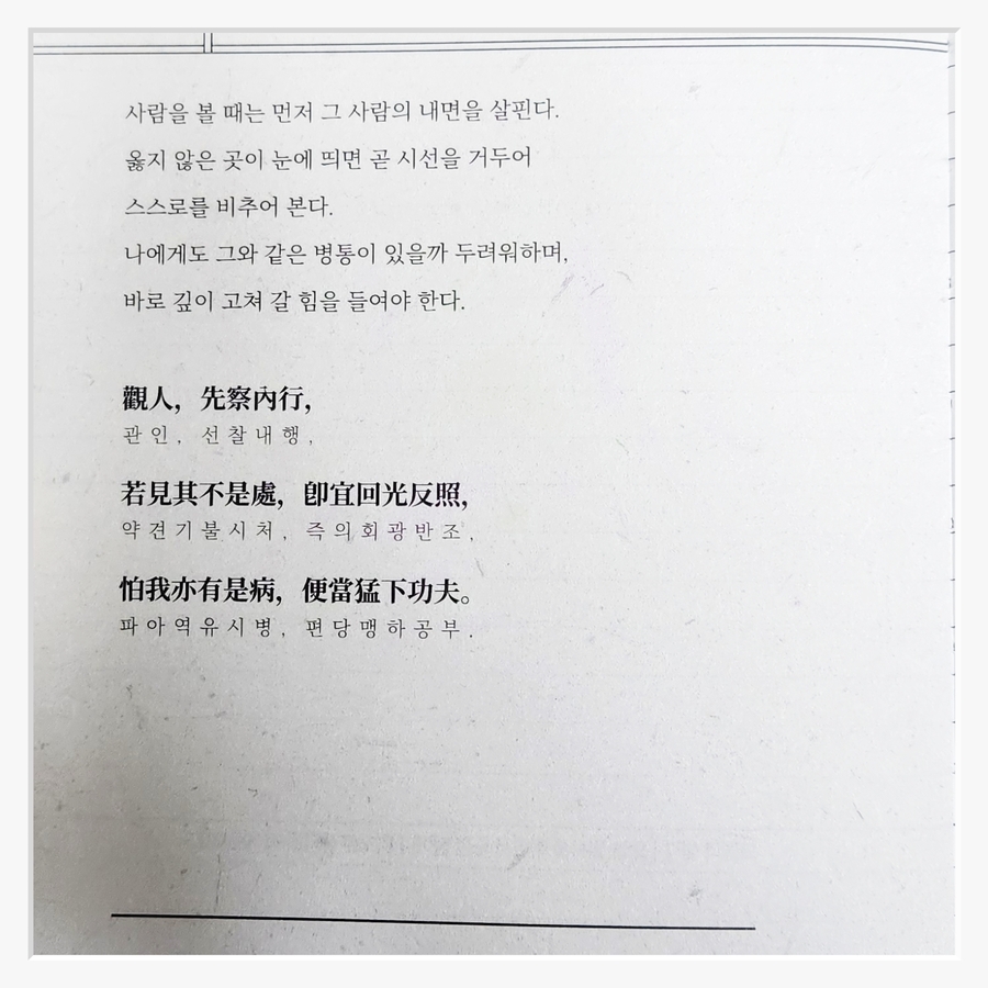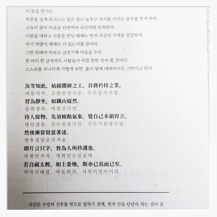 다산의 문장 수업 정약용 저 한정호 편 🔖 이 책은 조선 시대의 위대한 실천가이자 자기경영자였던 다산 정약용의 사고법과 삶의 원칙을 담은 명문장 필사집이다. 다산은 공부를 책상에 앉아 지식을 쌓는 행위에 한정 짓지 않았다. 그는 공부란 현실을 바꾸는 것이어야 한다고 굳게 믿었다. 18년간의 혹독한 유배 기간에도 좌절을 딛고 500여 권의 방대한 저술을 남길 수 있었던 힘은, 앎을 삶으로 증명해내는 실천의 학문에서 나왔다. 이 책은 다산이 평생 지켜온 철학의 정수를 여섯 가지 핵심 원칙으로 체계화하여 제시한다. 📖✔️제1부 학이치용(學以致用)에서는 배우고 묻고 적용하는 공부의 기본자세를, ✔️제2부 실사구시(實事求是)에서는 사실에 입각해 진리를 구하는 실증적 태도를, ✔️제3부 반구제기(反求諸己)에서는 남을 탓하기 전 스스로를 성찰하여 허물을 찾는 내면의 힘을, ✔️제4부 지행겸진(知行兼進)에서는 앎과 실행을 함께 나아가게 하여 몸소 큰 뜻을 이루는 추진력을, ✔️제5부 정심성의(正心誠意)에서는 마음을 바로잡고 뜻을 성실히 하여 삶의 원칙을 공고히 하는 법을, ✔️제6부 경세설제(經世設制)에서는 자신을 닦는 일에서 더 나아가 세상을 경영할 제도를 설계하는 확장된 시각을 다룬다. 요즘 다산의 문장 수업이 피드에 자주 보여서 꼭 필사하고 싶었는데요. 삶의 질서를 만드는 다산의 문장을 읽고, 그 뜻을 이해하고, 손으로 써보고, 내가 할 수 있는 일들을 하나하나 정리해 보면서 통찰의 시간을 보낼 수 있었습니다. 살면서 누구에게나 겪을 수 있는 일들을 다산의 문장 수업을 통해 좋은 관계를 유지시켜 줄 수 있는 현명한 문구들이 많이 있는데요. 옳고 그름을 분별하고 그것을 삶 속에서 되풀이하며 교정하는 과정을 필사를 하며 배워 볼 수 있습니다. 이 책은 하루 한 장이면 충분하다고 합니다. 꾸준한 흐름이 쌓이면, 생각이 달라지고, 습관이 바뀌며, 결국 삶의 방식이 달라진다고 하는데요. 매일 필사 후 나만의 생각을 써볼 수 있어서 더 생각 정리 하는데 좋았습니다. 오늘의 생각이 100일 동안 쌓여서 나만의 멋진 글이 되길 희망해 봅니다. 일주일 동안 필사를 하면서 평소에 배우고 싶었던 공부를 더 해보고 싶다는 희망 사항도 생겼는데요. 다산의 공부관은 배우고 익혀 실천으로 옮기는 구조라고 말합니다. 잘 익혀서 사회 전체의 질서로 확장되는 경험을 하고 싶습니다. 이번 기회에 한문 공부도 해보며 다산의 문장을 통해 나의 말이 되어 판단과 행동을 조금씩 바꾸어 가는 계기가 되었습니다. 꾸준함을 또 배우게 되었고 자주 펼쳐서 필사하고 외우고 삶에 대응해 보며 성장하는 시간을 만들고 싶습니다😄 📮 다산의 문장은 내면을 굳건하게 지탱하는 힘이 되어 준다고 합니다. 함께 필사하며 성장해 보시겠어요? 추천해 봅니다👍🏻 @lovebook.luvbuk 이 책은 <리뷰의숲과 쿠텐베르크 출판사>를 통해서 도서 ’협찬‘ 받았습니다. 뜻깊은 시간 함께 할 수 있어서 감사합니다🙏🏻 #다산의문장수업 #정약용지음 #쿠텐베르크출판사 #필사 #문장 #정약용 #고전 #철학 #동양철학 #동양고전 #다산학 #지적성장 #인생의원칙 #루틴#공부법 #실학 #명언 #처세 #감사합니다 |
