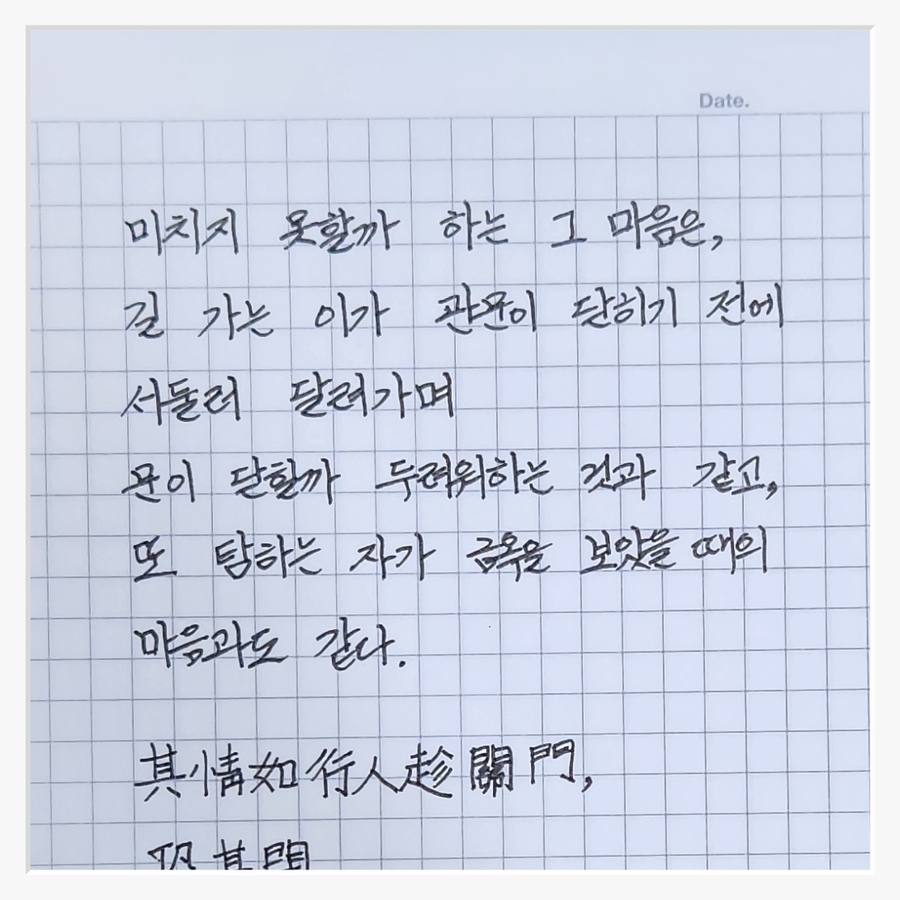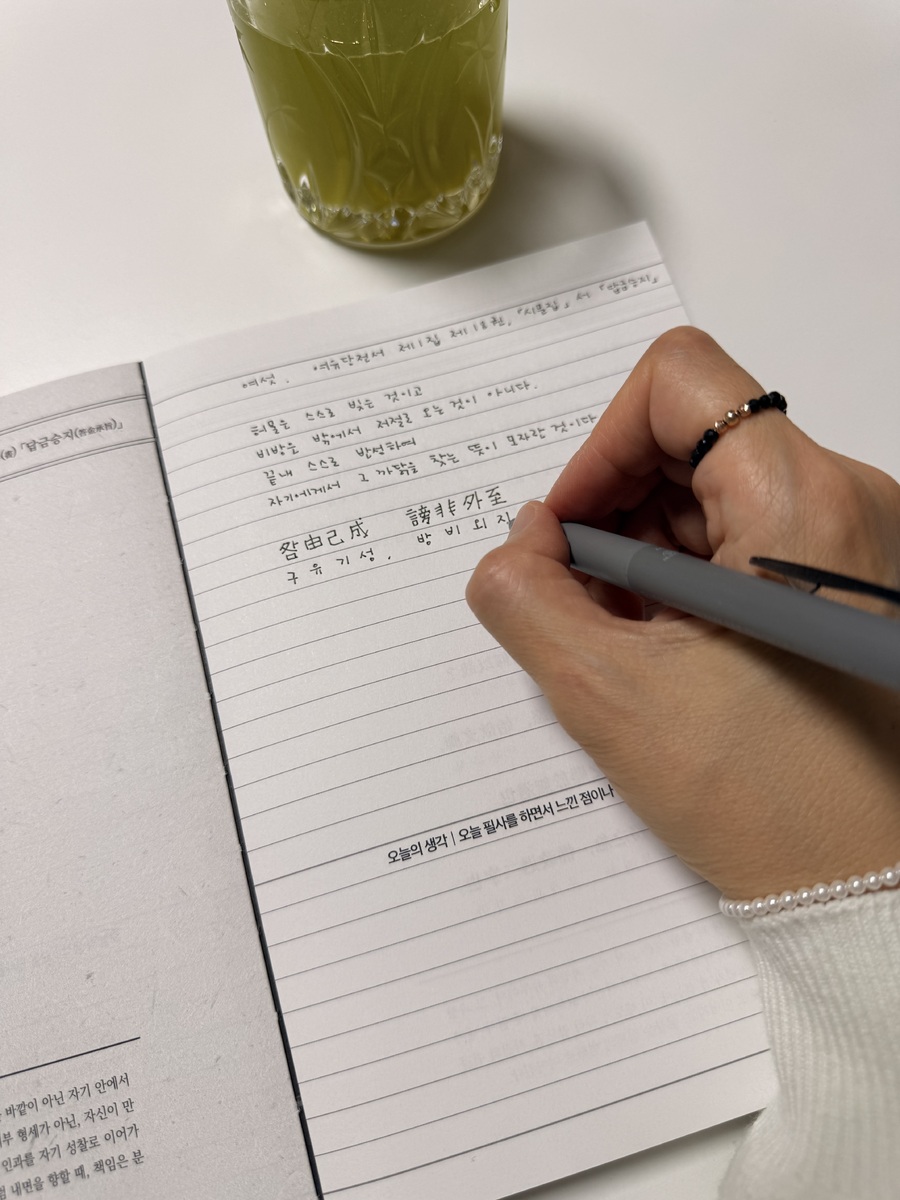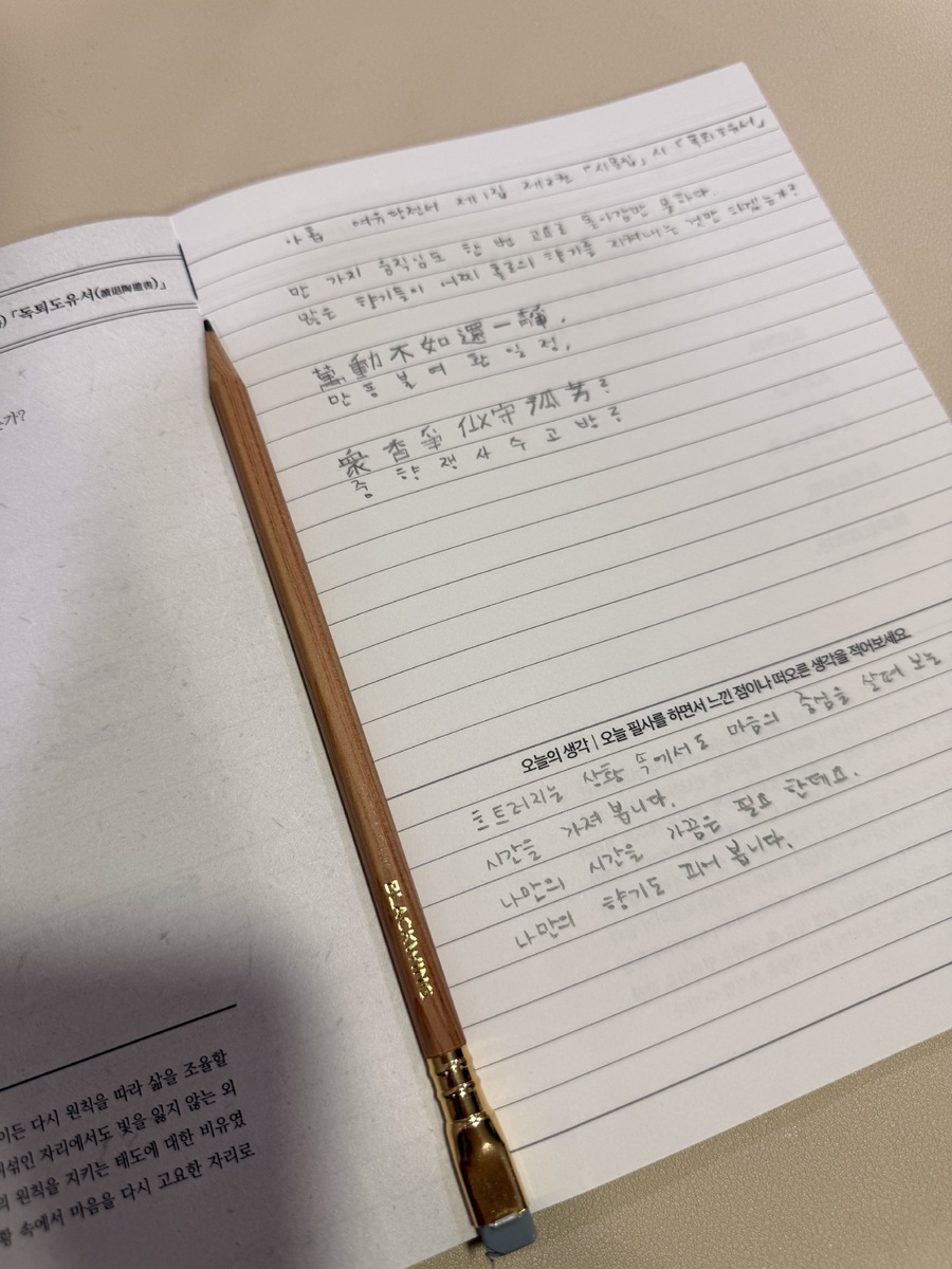 [출판사에서 도서를 제공 받아 직접 읽고 작성한 리뷰입니다.] 🖊 삼남매 육아를 하며 맞벌이를 하고, 하루를 치열하게 살아가는 50대인 나는 요즘 새롭게 배우는 즐거움을 발견하고 있습니다. 오후 일하러가기 전 오전의 짧은 틈을 이용해 도서관에서, 평생학습관에서 배우고싶은 인문학, 역사, 공예 등을 배우며 내면의 풍요로움을 채우려 합니다. 그리고 잠시 주어진 고요한 순간에 나는 책을 펼쳐 필사를 하며 여유를 가지려 노력하는 중입니다. 필사의 힘을 믿기에. [다산의 문장 수업]은 그 시간에 나에게 도움과 깨우침을 주는 책입니다. 다산 정약용 선생의 글쓰기 원칙과 마음 닦음의 내공을 따라가다 보면, 학문이란 단지 지식을 쌓는 것이 아니라 삶을 바로 세우는 일이라는 사실을 거듭 깨닫게 됩니다. 나의 지금의 일상과 배움을 토대로 눈길을 끄는 문장을 필사합니다. “학자하(學者何), 학야자, 각야(覺也).” 배우는 것이란 깨닫는 일이다. “각기비내하 어아언각지이(覺其非奈何 於雅言覺之爾).” 그 그릇됨을 어떻게 깨닫는가? 바른 말을 통해 분별하여 깨닫는다.라는 문장. 다산은 학문을 단지 듣고 베끼는 데에 의지하는 것을 경계했습니다. 스스로 생각하고, 틀림을 발견하고, 바로잡는 과정을 강조하며 내가 이 책을 통해 배우고자 한 평생학습의 태도와 닮아 있었습니다. 요즘 나는 유튜브나 강의를 흘려듣고 얼른 성과를 내는 배움에 익숙해져 있었으나 다산은 말합니다. 기록을 그대로 두지 말고, 근거를 대고 확인하며 교정하라. 이것이 실천하는 공부, 삶을 변화시키는 공부라는 깨달음을 얻게 됩니다. 또 다른 구절을 필사해봅니다. 제1집 제8권, 시문집 대책 지리책의 문장들을 되돌아보며 통치의 정당성. 요즘 뉴스를 보며 아이들에게 정치경제에 대한 이야기를 나눌 때 다산의 이 통치이념에 대한 신념을 기본으로 삼으려 합니다. 가장 기본이 옳은 판단의 근거임을 다시 한번 되새깁니다. ✒️ 이 책의 큰 특징은, 단순한 고전 해석이 아니라 다산의 원문과 현대 해설, 그리고 삶으로 옮기는 실천적 문장 쓰기라는 구조에 있다. 독자가 직접 따라 쓰며 생각을 세울 수 있도록 구성된 책이다. 손으로 글자를 그리는 동안 문장은 천천히 마음 안으로 스며듭니다. 이번 필사를 통해 어려운 한자의 의미도 찾아보며 글씨의 획 하나하나를 따라가는 과정을 통해 다산이 글과 학문을 통해 평생 다져온 내공이 어떤 마음에서 비롯되었는지 지금의 현실과 나의 생활과 생각에 대입해봅니다. 필사로 배움을 일상의 실행으로 이끌어야지! 다짐해봅니다. 이제 나는 배움이란 나를 다그치는 것이 아니라, 나를 돌보고 단단하게 세우는 과정임을 알게 되었다. 앞으로도 순간의 틈틈이 배우는 내가 되고 싶다. 다산의 공부처럼, 나는 오늘도 현실을 바꾸는 평생학습을 계속할 것이다. #다산의문장수업 #정약용 #한정호 #구텐베르크 #필사 #문장 #정약용 #고전 #철학 #동양철학 #동양고전 #다산학 #지적성장 #인생의원칙 #루틴 #공부법 #실학 #명언 #처세