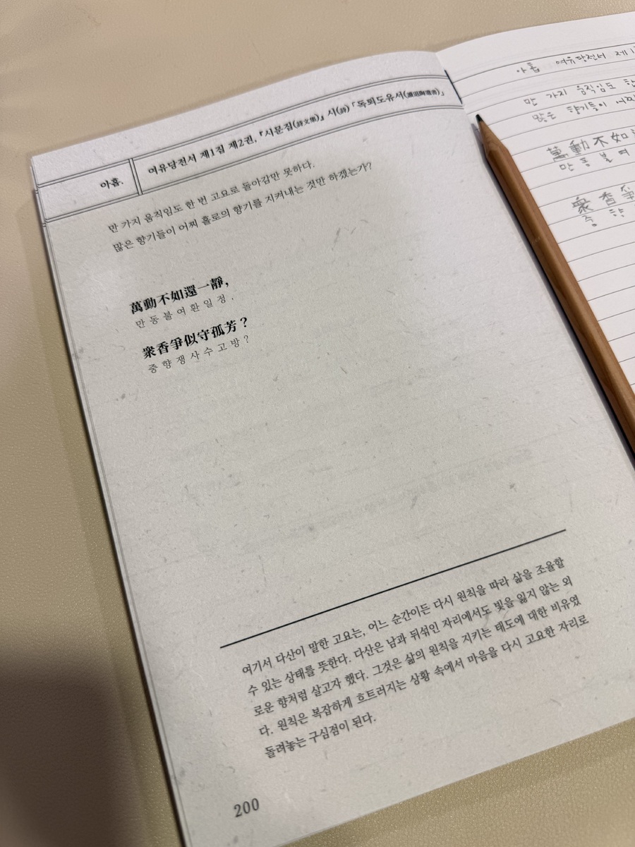 요즘 머릿속이 복잡한 날들이 이어지면 문득 이런 생각이 든다. 독서도 열심히 하고 직장에서나름 자리를 잡았다고 생각했는데 정작 삶은 왜 이 모양일까. 나를 단단하게 붙잡아 줄 원칙 하나, 중심 하나가 절실한 순간이 자꾸 찾아온다. 이런 고민을 품고 사는 사람이 나뿐만은 아닐 것이다. 하루하루는 빠르게 흐르는데, 마음은 자꾸 뒤로 미끄러지고, 다짐은 며칠 못 가 흩어지는 건 누구나 경험한다. 그럴 때 옛사람의 글이야말로 가장 현실적인 조언이 될 수 있다는 걸, 이번 책을 통해 새삼 느꼈다. 다산의 문장 수업은 단순한 필사책이 아니다. 다산 정약용의 사유 방식, 공부의 태도, 삶을 바라보는 원칙을 여섯 갈래로 정교하게 나누어 소개하며, 독자가 직접 써보고 곱씹고 일상에 적용해볼 수 있도록 구성되어 있다. 하루 한 문장을 쓰는 일만으로도 그의 생각이 서서히 스며드는 경험을 하게 된다. 이 책이 던지는 진짜 질문은 결국 하나다. 배움이 삶을 움직이고 있느냐는 것이다. 우리는 ‘나는 알고 있어’라고 말하면서도 정작 행동은 이전과 크게 다르지 않은 경우가 많다. 그런 스스로를 떠올리며 책장을 넘기니, 다산이 200여 년 전에 지적한 문제들이 지금 내 문제와 똑같다는 사실에 묘한 안도감마저 들었다. 책은 배움의 기본 태도에서 시작해 사실을 기반으로 생각하는 습관, 자신에게서 해답을 찾는 방식, 앎과 실천을 함께 끌고 가는 추진력, 마음을 바로잡는 훈련, 더 나아가 세상을 바라보는 시각까지 단계적으로 안내한다. 무엇보다 ‘배웠으면 써먹어라’라는 말이 단순한 구호가 아니라 일상의 행동 지침이라는 걸 다시 깨닫게 된다. 실천 방법은 의외로 간단하다. 읽고, 쓰고, 오늘 바꿀 수 있는 행동을 하나 정리하는 것. 손으로 천천히 문장을 따라 쓰는 동안 마음이 고요해지고, 짧은 문장이지만 그 안에 담긴 뜻이 하루를 정리하는 기준처럼 느껴진다. 특히 오늘의 생각을 기록하는 과정은 나와 대화하는 시간처럼 느껴져서 소중했다. 다산이 이런 원칙을 강조한 이유는 명확하다. 그는 지식이 삶을 바꾸지 못한다면 그것은 공부가 아니라 공허한 장식에 불과하다고 말한다. 유배지에서 버틴 시간, 기록으로 남긴 방대한 저술, 끊임없이 스스로를 단련한 그의 삶이 바로 책의 근거가 된다. 이론이 아니라 삶으로 증명해낸 사람의 말이기에 믿을 수밖에 없다. 지금 이 책을 펼쳐야 하는 이유는 단순하다. 마음이 산만하고 생각이 흐트러질수록 삶의 기준이 필요하기 때문이다. 다산의 문장을 베껴 쓰는 하루 5분만으로도 생각이 정돈되고, 버겁던 하루가 조금은 단단하게 정리되는 경험을 얻게 된다. 이 책은 삶의 혼란을 글의 질서로 바꾸는 경험을 선물한다. 오늘 쓴 문장이 내일의 태도를 바꾸고, 작은 반복이 결국 내가 살아가는 방식까지 바꿀 수 있다는 믿음을 심어준다. 필사라는 느린 동작이 오히려 지금의 나를 달래고 바로 세우는 힘이 되는 것이다.