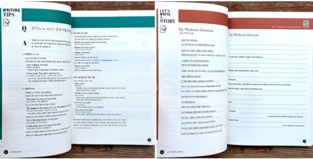 ![]() 이 책은 문장 만들기 즉, 내가 말하고 싶은 말을 영어로 마음껏 표현할 수 있는 능력을 만들기 위해서 만든 거라, 문법공부를 놓쳐서는 안된다는 의미를 담아 <WRITING TIPS>에서 확인이 가능하며, 더 나아가 좀 더 응용하여 문장을 많이 써보도록 고난도 문제도 발견하게 된다.