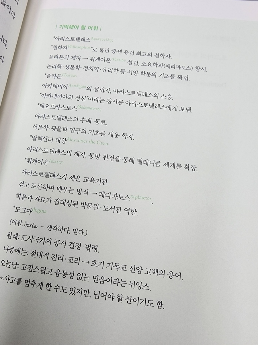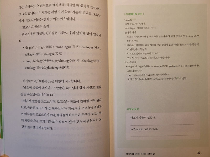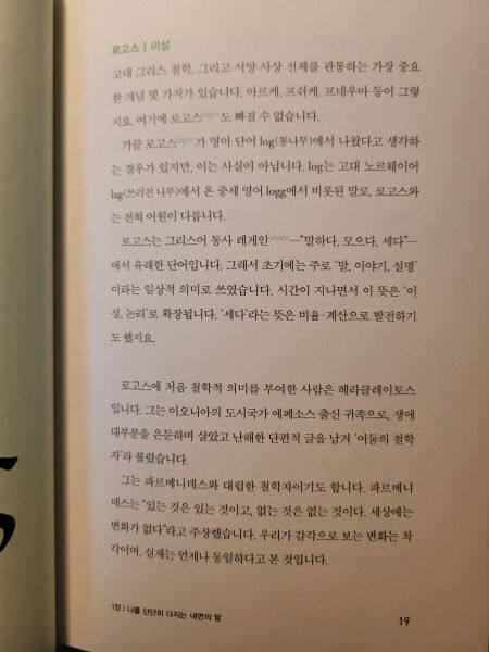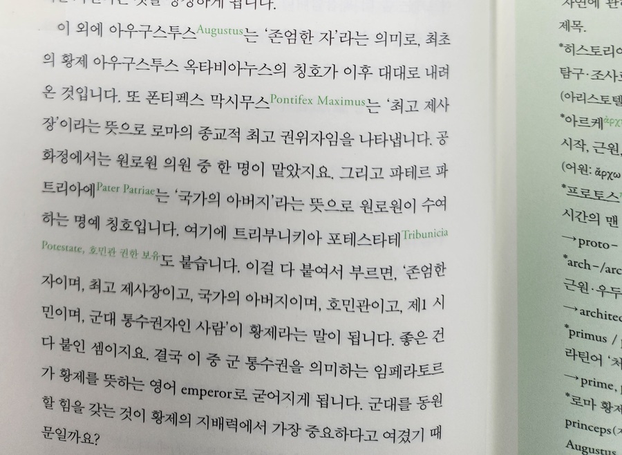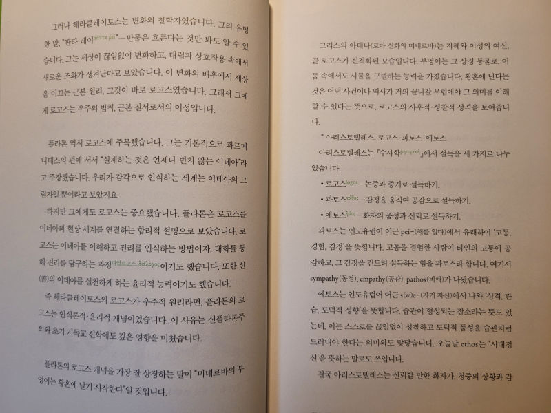 <북뉴스 서평카페의 소개로 출판사로부터 책을 제공받아 주관적으로 작성한 글입니다.> 이 책 『나의 내면을 채워주는 어휘 수업』은 「품격 있는 대화를 위한 말 공부」란 부제가 붙어 있다. 또 "말은 나를 세우고, 세상과 이어주며, 삶의 품격을 완성한다."는 격언 같은 문장이 앞 표지 '띠지'에 썼다. 이 책은 그리스어와 라틴어에서 품격 높은 단어나 문장을 우리 일상에 사용해보면 하는 마음에서 집필됐을 것이라고 짐작된다. 서양 문명의 근원이 고대 그리스·로마에 있다고 유럽인들은 생각하고 있다. 사실은 틀린 말이 아닐 것이다. 그들이 자신들의 문명이 그리스 시대부터 로마 시대에 걸쳐 틀이 완전히 잡혔다고 생각하기 때문이다. 우리가 알다시피 그리스는 세계 4대 문명 발상지 중 하나다. 동양에서 중국, 인도, 그리고 중동의 메소포타미아 유역의 바빌론이다. 인류 문명의 시작된 곳들이다. 각각 인종이 다르고 지형·기후에 따라 다르게 발전했다. 대략 BC 2,000~3,000년 정도로 인류학자들은 확인하고 있다. 4개 지역은 각기 다른 언어를 사용한다. 물론 처음에는 대체로 상형문자 형태였다고 한다. 천체, 땅, 인간, 기타 동식물 등을 형상화해서 표시했다는 말이다. 문명이 발전하면서 차츰 형태에서 기호꼴로 변해간다. 그래서 서양 언어의 어원은 그리스어(희랍어)다. 오늘날 서양 문명의 태동에서 꽃피우는 결정적 역할을 한 시기라고 표현한다. 쉽게 표현하자면 그들의 문화가 오늘날까지 이어져 내려오고 있다는 말이다. 그리스 문명은 무력보다는 학문을 중시했기 때문에 오늘날 서양 문명의 모태가 될 수 있었다고 독자는 생각한다. 이후 페르시아의 전쟁을 거듭하며 결국은 로마에게 지중해와 유럽의 패권이 넘어간다. 로마는 아테네에 패해 흘러들어온 트로이의 사람들이 쫒겨나 정착한 곳이라고 보는 견해도 있다. 아무튼 로마는 차츰 세를 키우다 결국 서양 전역을 무력으로 굴복시킨다. 로마는 하루 아침에 이루어지지 않았다. 물론 이 문장은 시오노 나나미의 『로마인 이야기』 1권 제목이자, 영어 속담 ‘Rome wasn’t built in a day’의 한국어 번역이다. BC 750년 로마 언덕에 터를 잡은 로마인들은 그리스 문명을 동경했다. 오늘날 말로 그리스로 '유학' 가는 귀족들이 많았다고 한다. 또 그리스 문명이 성장기에는 지중해 주변에 이른바 식민지 무역항을 위한 도시를 발전시키기도 했으니, 당연히 그리스 문명을 동경했을 것이다. 그리스가 쇠퇴기에 접어들 무렵 이탈리아 반도에 둥지를 튼 로마가 서서히 세력을 넓혀 갔다. 로마는 그리스 문명을 잘 알았다. 그때 유학 간 일부 귀족의 자제들이 수준 높은 그리스 문명을 배웠을 것으로 보인다. 또 로마가 정착한 이탈리아 반도 제일 아래 쪽에는 그리스 무역항이 있었다고 한다. 당연히 그리스를 많이 따라 국력을 키웠을 것으로 보인다. 사실 로마는 지중해를 장악하기 위해 자신들의 군사력을 강화함과 동시에 한편으로는 무역과 유학 등으로 선진 문명을 받아들이기를 당연시 했다. 강성한 나라로서의 면모를 갖추기 시작한 것이다. 로마인들은 그리스인들로부터 배우기를 꺼리지 않았다고 한다. 당시 그리스가 멸망해 로마에 복속되었을 때 학자들은 노예라도 등급이 높았다고 한다. 자신들의 자제들을 가르치는 가정교사로 채용해 노예 중 최상급 대우를 해줬다고도 들은 바 있다. 그리스 시대에 발생하여 전기 로마 시대까지 성행한 철학의 한 유파로서 스토아학파가 있다. 일상에서 지혜, 용기, 절제 또는 중용, 정의의 네 가지 미덕을 실천하고 자연에 순응하는 삶을 사는 것이 유다이모니아, 즉 풍요로운 삶을 달성하는 길이라고 생각했다. 기원전 300년경 시티움의 제노가 고대 아테네의 아고라에서 창시했다. 스토아학파는 플라톤이나 아리스토텔리스와는 달리 이데아적 윤리에 회의를 품고 삶에 닥치는 일들을 지혜롭게 해결하는 것에 몰두했다. 스토아학파는 특히 인간에게 "덕은 유일한 선"이며, 건강, 부, 쾌락과 같은 외적인 것들은 그 자체로 선하거나 악한 것이 아니라(아디아포라) "덕이 행동할 수 있는 재료"로서 가치가 있다고 가르치는 것으로 유명하다. 세네카와 노예였던 에픽테토스를 비롯한 많은 스토아학파는 "미덕은 행복에 충분하기 때문에" 현자는 불행에도 감정적으로 탄력적일 수 있다고 강조했다. 스토아학파는 또한 어떤 파괴적인 감정은 판단의 오류에서 비롯되며, 사람들은 "자연에 순응하는" 의지(프로하이레시스)를 유지하려고 노력해야 한다고 믿었다. 스토아주의는 서기 3세기까지 헬레니즘 그리스와 로마 전역에서 번성했으며, 그 지지자 중에는 마르쿠스 아우렐리우스 황제도 있었다. 우리 모두가 알고 있는 고대 로마의 정치인이자 군인인 카이사르는 후기 공화정 로마를 근본적으로 뒤엎고 제정의 기틀을 마련하여 사실상 제정 로마의 시조의 위치를 차지하는 인물이다. 그도 그리스 유학파 중의 한 사람이라고 한다. 고대 로마의 초기 알파벳 체계는 그리스 문자가 에트루리아에서 변형된 것이 로마로 전해진 것이다. 에트루리아 언어에서는 'k'와 'g' 발음이 구분되지 않아 'g' 발음을 표기했던 '감마'가 'C'로 변형