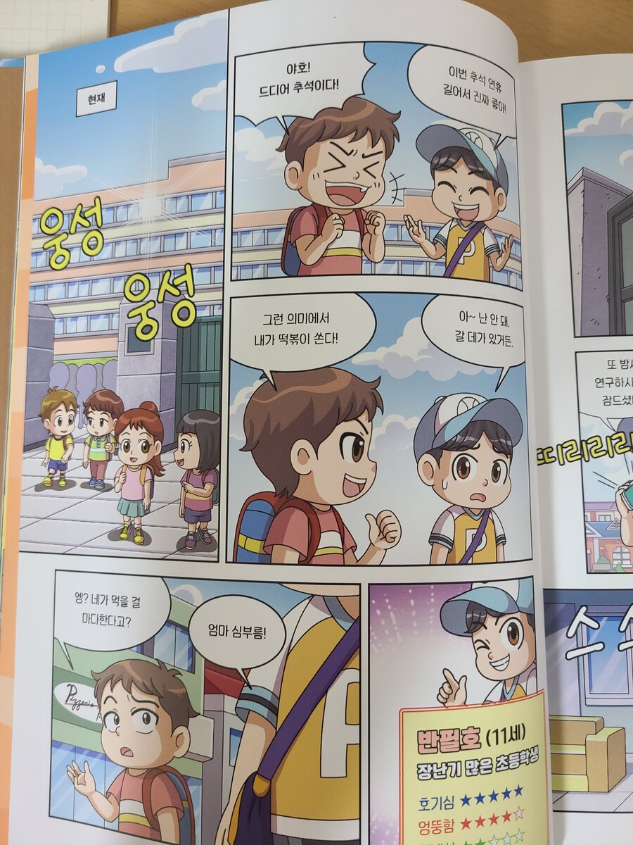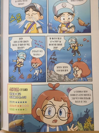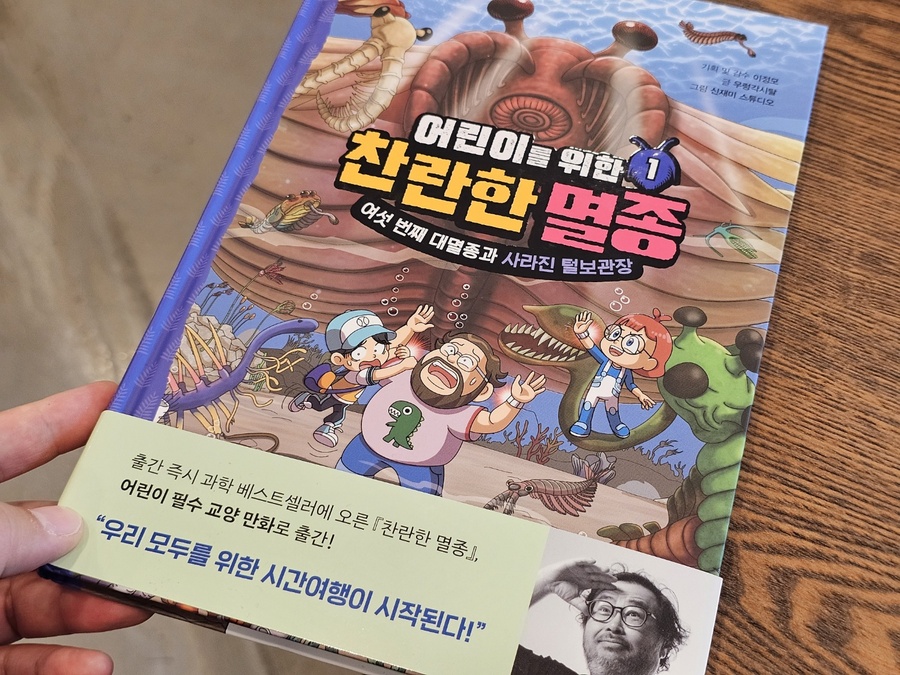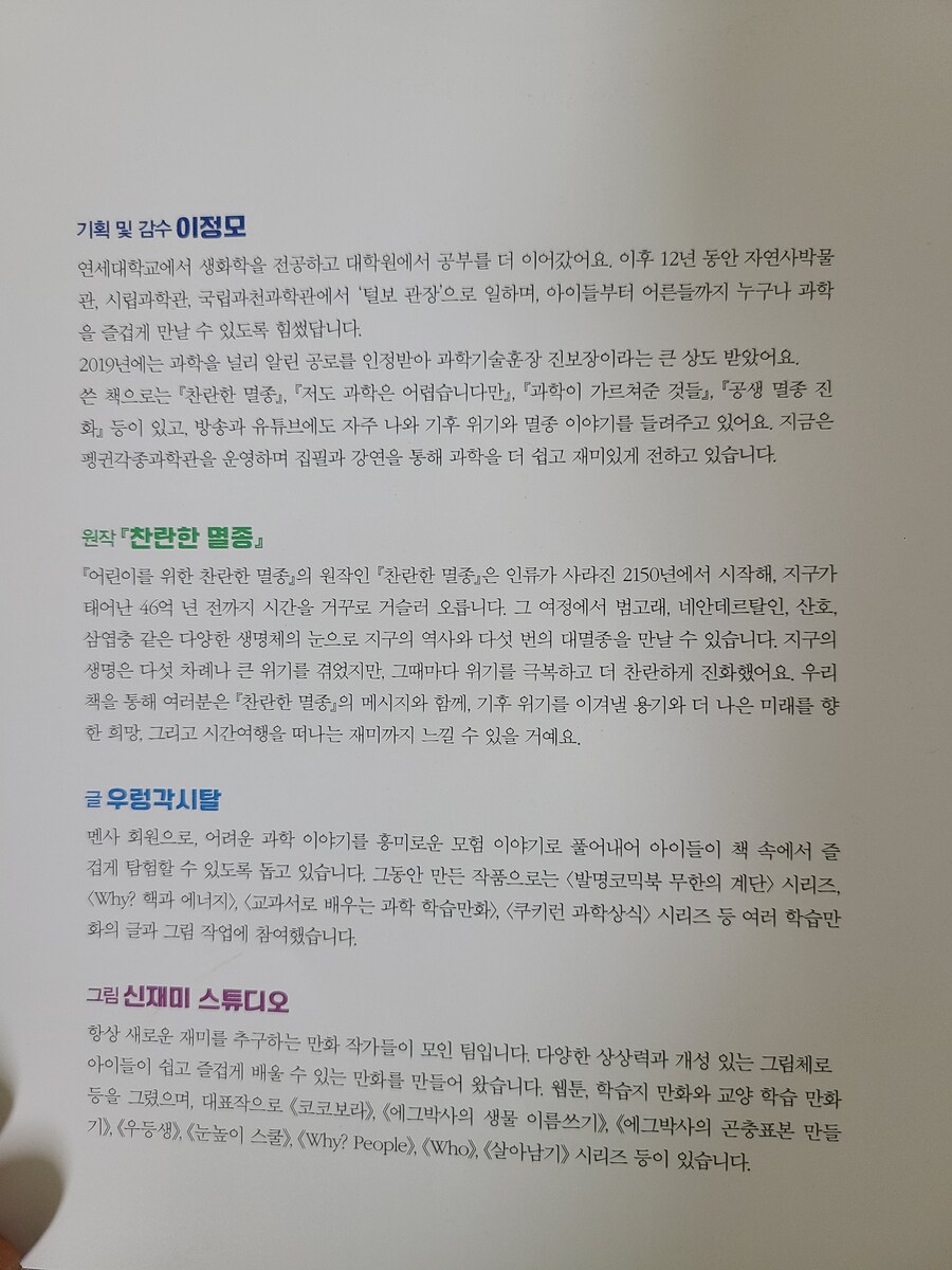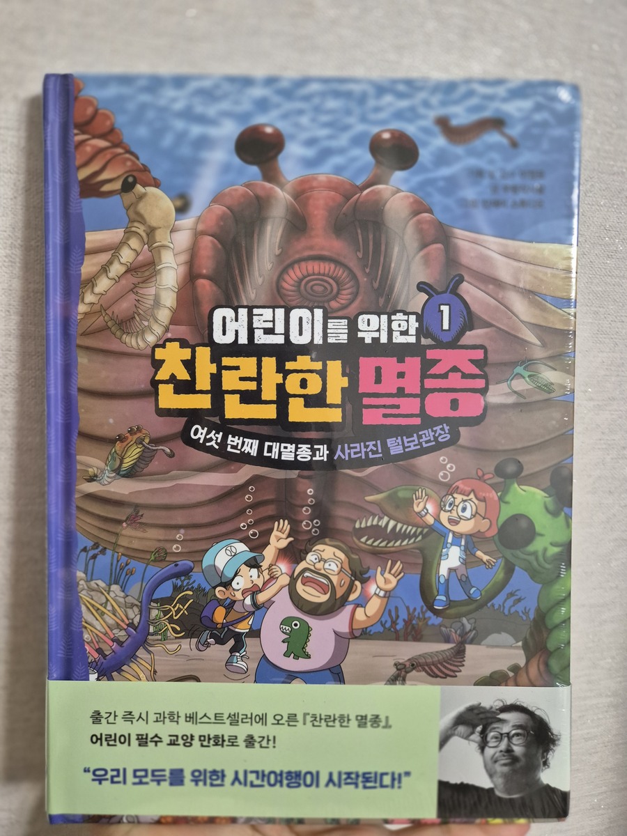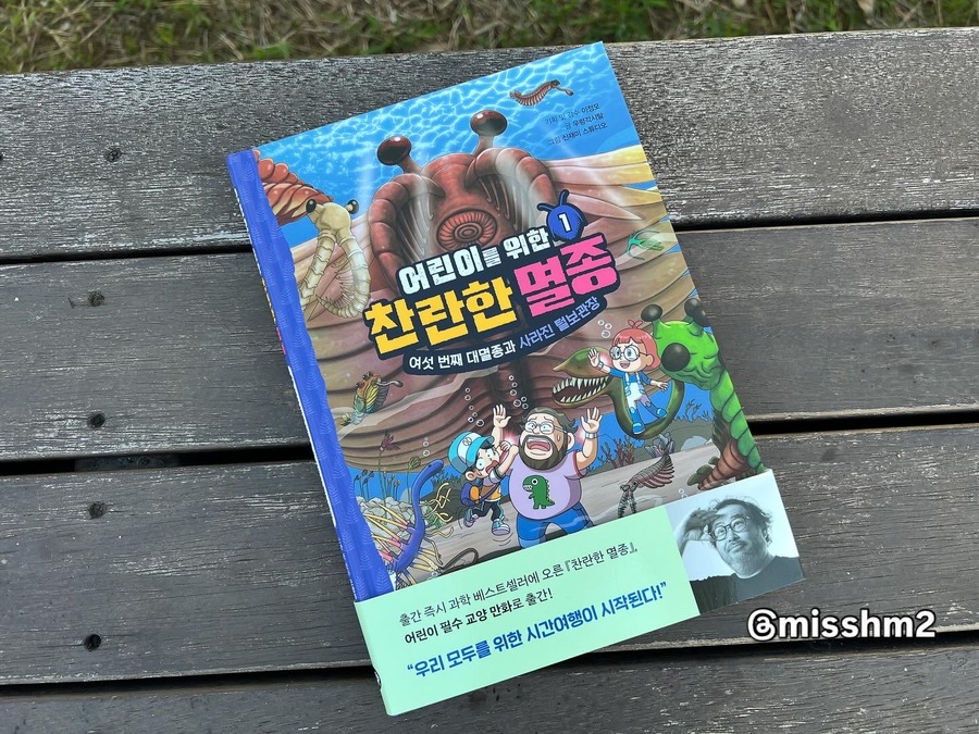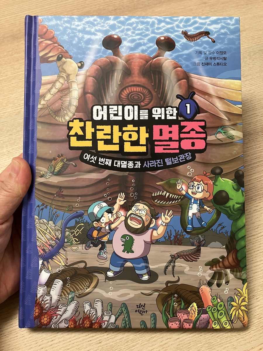 [출판사로부터 도서를 지원받아 솔직한 리뷰를 하였습니다.]책이 도착하자마자 읽기 시작한 둘째가 "우와~엄마 이거 엄청 재밌어"하고 흥분하며 말한다. 그 순간 이 책이 아이들에게 얼마나 큰 매력이 있는지 단번에 알 수 있었다. 이 책은 '털보 관장'으로 유명하신 이정모 관장님의 "찬란한 멸종"을 어린이의 눈높이 맞춘 책이다. 만화 형태로 아이들이 이해하기 쉽게 만들어져 둘째처럼 초등 저학년 아이들부터 재미있게 볼 수 있을 것 같다. 이야기는 인간이 멸종한 가상의 미래 2150년부터 시작된다. 여섯 번째 대멸종을 막기 위해 주인공 필호와 자연이가 타임 오프로 '캄브리아기'로 이동. 캄브리아기부터 석탄기, 페름기로 이어지며 지구와 생물의 진화, 멸종에 대한 이야기가 펼쳐진다. 과거 여행 중 주인공들의 다양한 사건, 사고들이 웃음을 자아낸다. 나도 필호처럼 과거이동이면 공룡시대인가 생각하다가 '캄브리아기'라고 나와서 그때가 언제인가 가물가물했다. 찾아봐야지 했는데 짜잔! 독자의 수준을 다 예상하시는가? 바로 다음 장에 친절하게 지질연대표가 떡하니 나온다. 작가와 편집진의 세세한 배려가 아주 감동적이다! 여섯 번째 대멸종. 무거운 이야기이다. 하지만 두려운 내용을 멸종 생물들과 그들의 능력을 재치 있게 설명해준다. 생물의 독백처럼 쓰인 내용들이 캐릭터들이 살아 움직이는 듯한 생생함을 주어 몰입도를 더욱 높인다. 과학적 근거를 바탕으로 쉽게 풀어낸 설명에 재미와 유익함도 더했고, 멸종 돋보기, 멸종 생물 도감 같은 내용이 중간중간에 포함되어 공부 아닌 듯 공부하는 효과도 쏠쏠하다. 기후 위기, 환경 문제는 어른에게도 쉽지 않은 주제이다. 하지만, 이 책은 늘 어둡고 막막했던 이야기에 두려움을 갖게 하는 대신, 용기와 희망을 주는 내용이다. 우리가 마주한 위기를 직시하고, 우리가 행동할 힘이 있다는 작가의 말이 마음에 깊이 남는다.