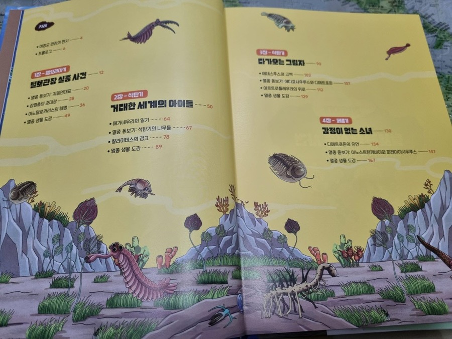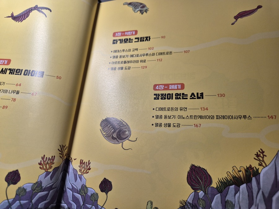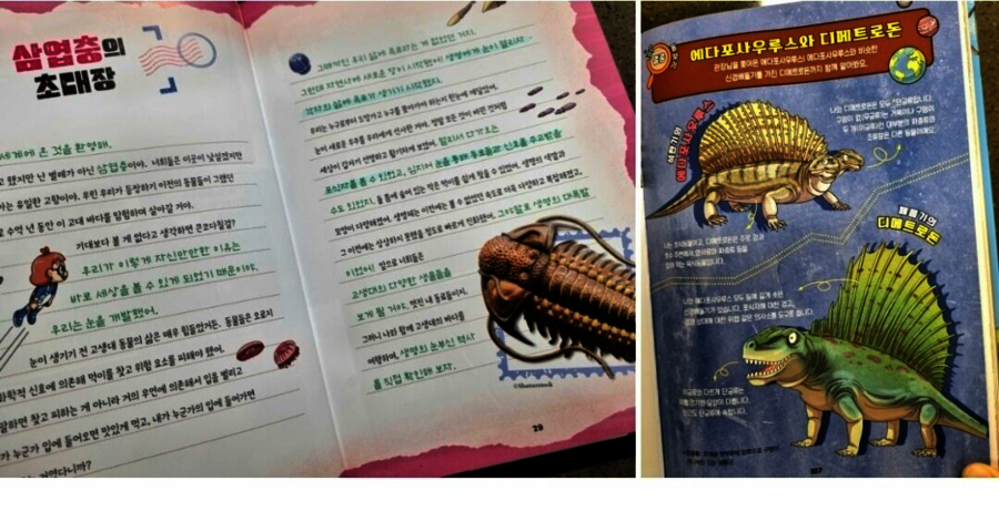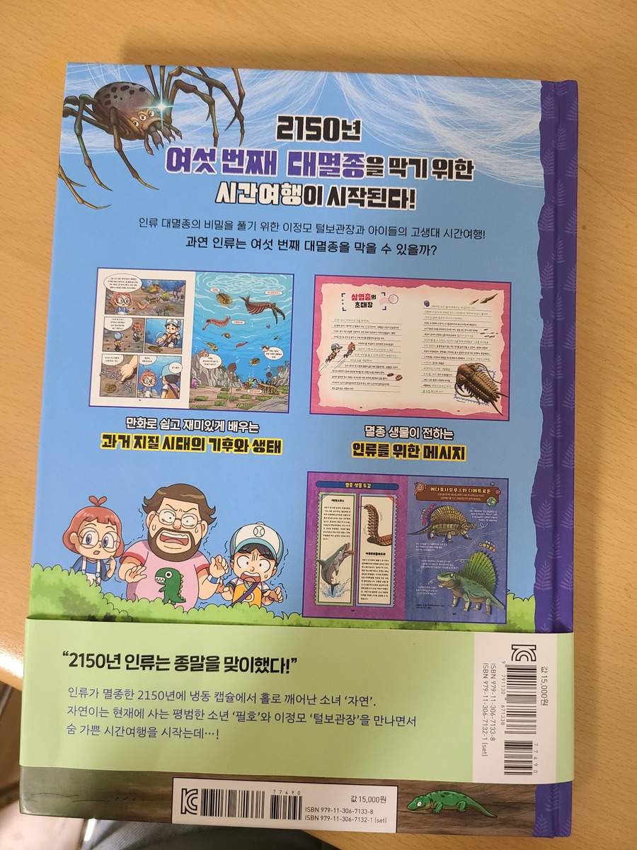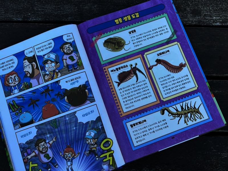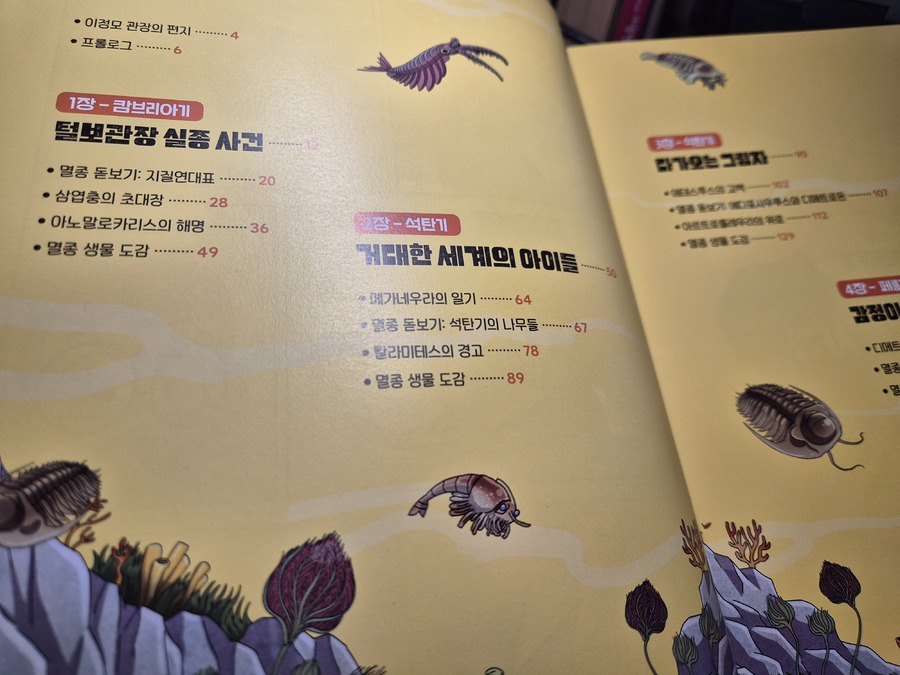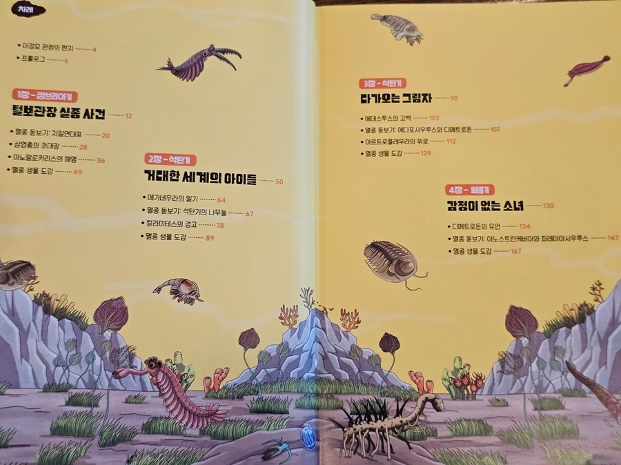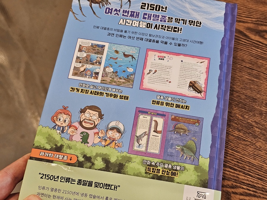 이 책은 2150년, 여섯 번째 대멸종을 막기 위해 미래에서 온 자연이와 필호가 사라진 털보 관장님을 찾아 고생대로 시간여행을 떠나는 이야기로 시작됩니다. 흥미롭고 유쾌한 만화 형식 덕분에 어려운 과학 개념도 자연스럽게 흡수되었고, 무엇보다 ‘멸종 생물들이 남긴 메시지’는 아이와 저에게 현재의 위기에 대해서 깊게 생각해 볼 수 있는 계기가 되었습니다. 🌍 고생대 생명체를 만나는 특별한 경험 중생대 공룡은 익숙하지만 고생대 생물들은 사실 우리에게 익숙하지 않았습니다. 그래서 이 책에서 만난 각종 새로운 생명체들은 정말 신선했습니다. “이런 생명체가 있었어?”라고 감탄하며 생김새와 생태, 그리고 그들이 어떤 과정을 통해 사라졌는지를 따라가다 보면 자연스럽게 지구의 기후 변화와 생태계의 변동을 이해하게 됩니다. 🔥 ‘세 번째 대멸종 – 페름기’가 준 충격