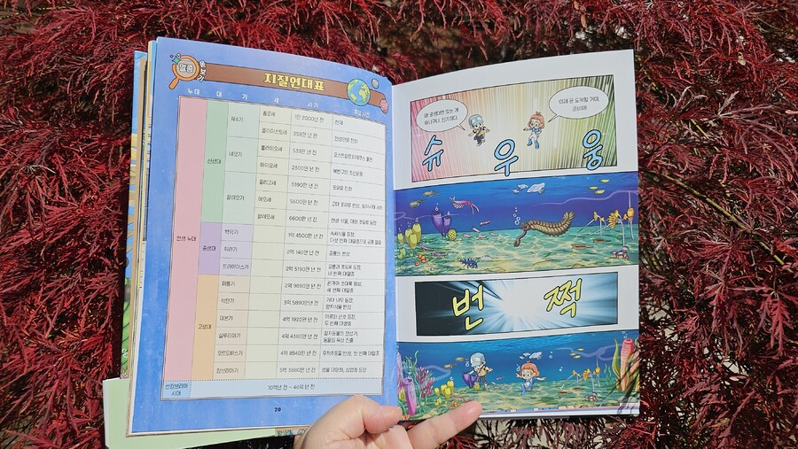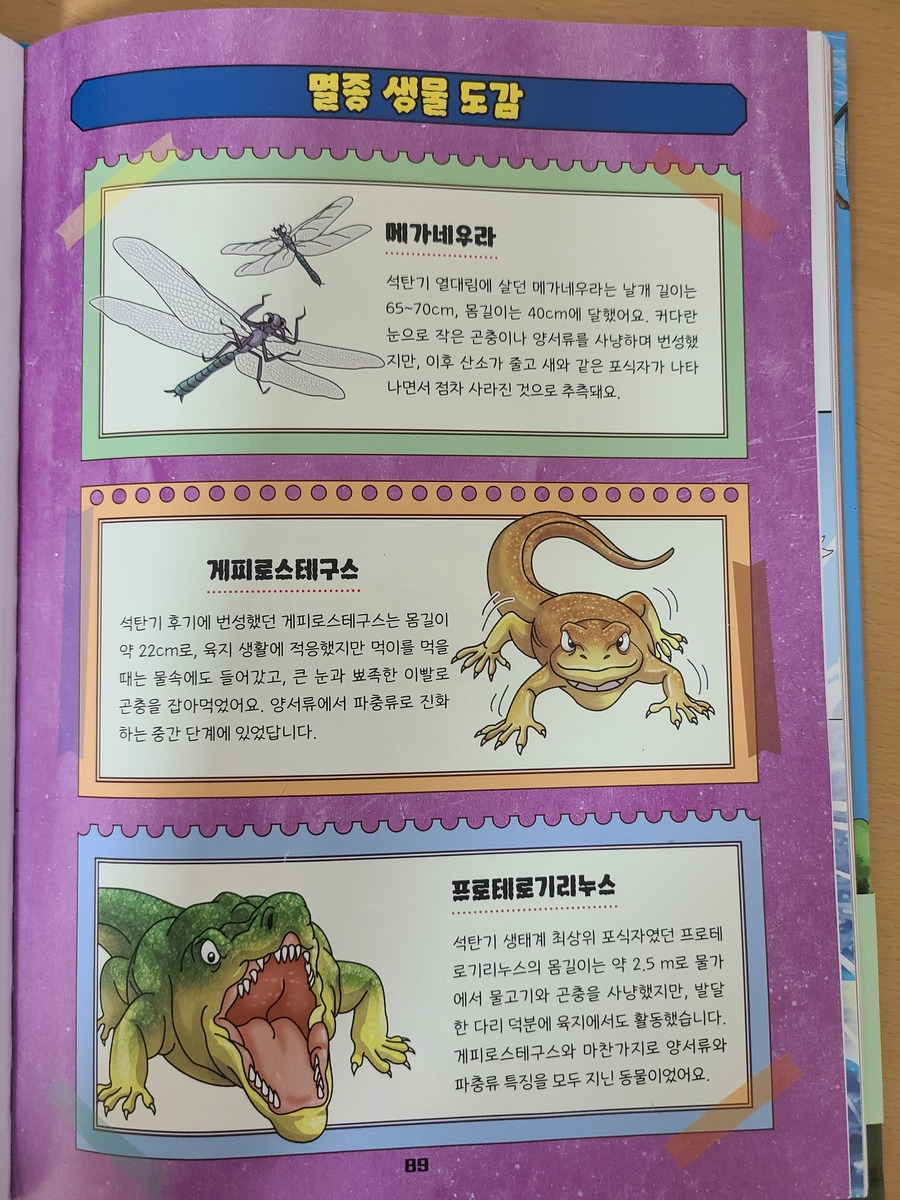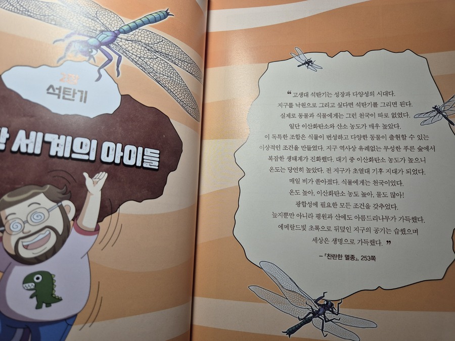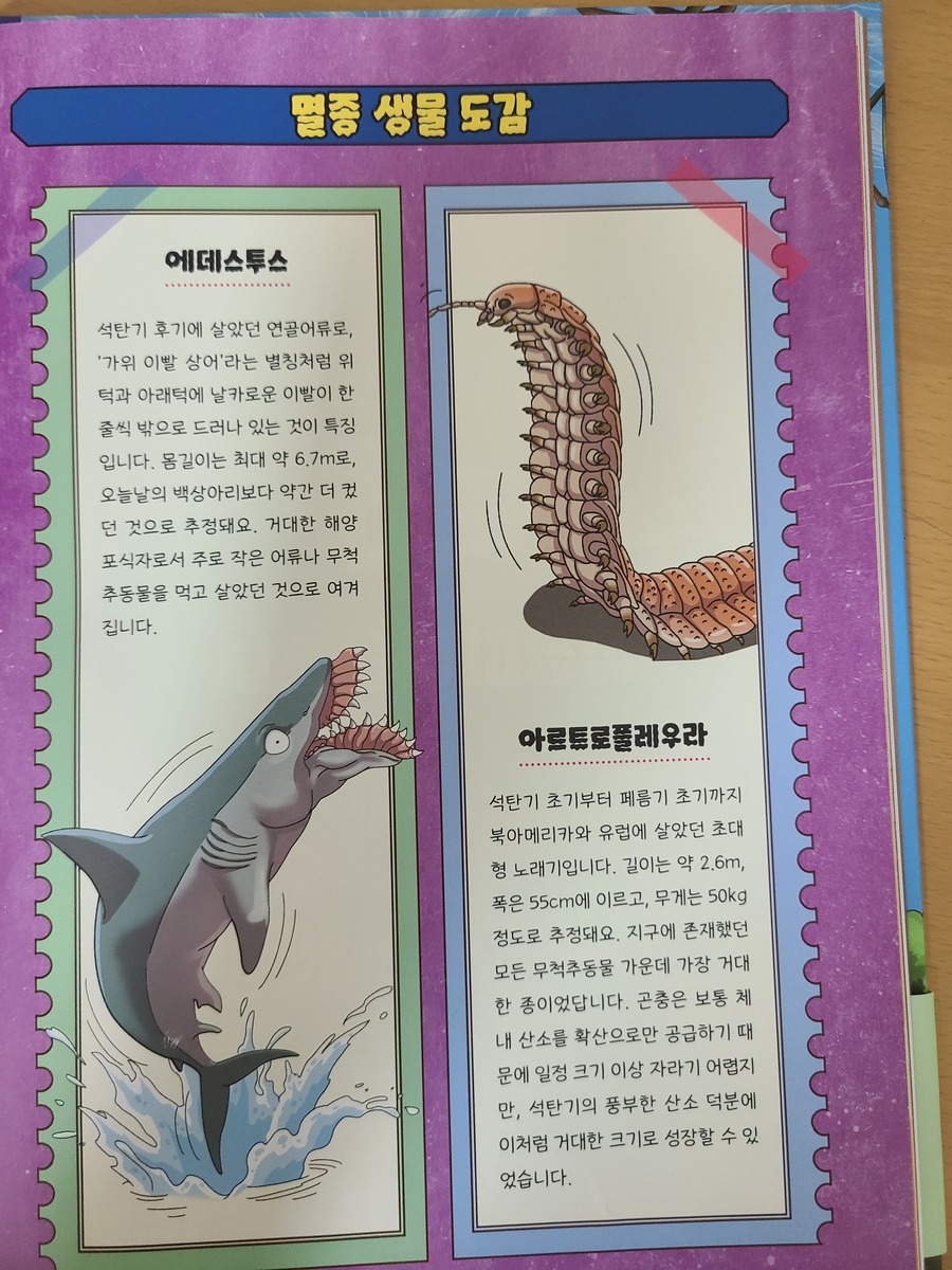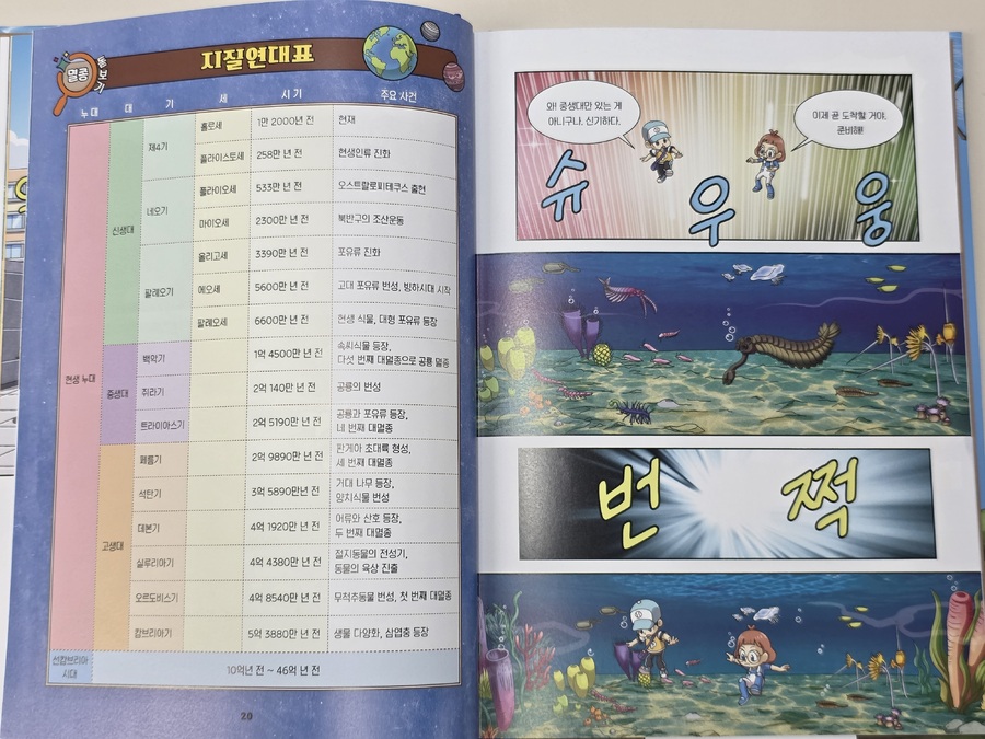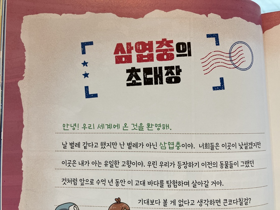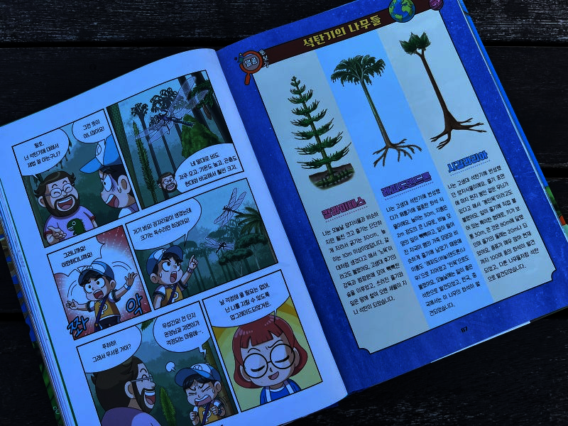 이 책은 2150년, 여섯 번째 대멸종을 막기 위해 미래에서 온 자연이와 필호가 사라진 털보 관장님을 찾아 고생대로 시간여행을 떠나는 이야기로 시작됩니다. 흥미롭고 유쾌한 만화 형식 덕분에 어려운 과학 개념도 자연스럽게 흡수되었고, 무엇보다 ‘멸종 생물들이 남긴 메시지’는 아이와 저에게 현재의 위기에 대해서 깊게 생각해 볼 수 있는 계기가 되었습니다. 🌍 고생대 생명체를 만나는 특별한 경험 중생대 공룡은 익숙하지만 고생대 생물들은 사실 우리에게 익숙하지 않았습니다. 그래서 이 책에서 만난 각종 새로운 생명체들은 정말 신선했습니다. “이런 생명체가 있었어?”라고 감탄하며 생김새와 생태, 그리고 그들이 어떤 과정을 통해 사라졌는지를 따라가다 보면 자연스럽게 지구의 기후 변화와 생태계의 변동을 이해하게 됩니다. 🔥 ‘세 번째 대멸종 – 페름기’가 준 충격