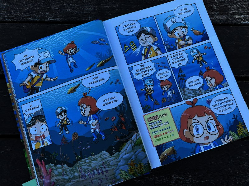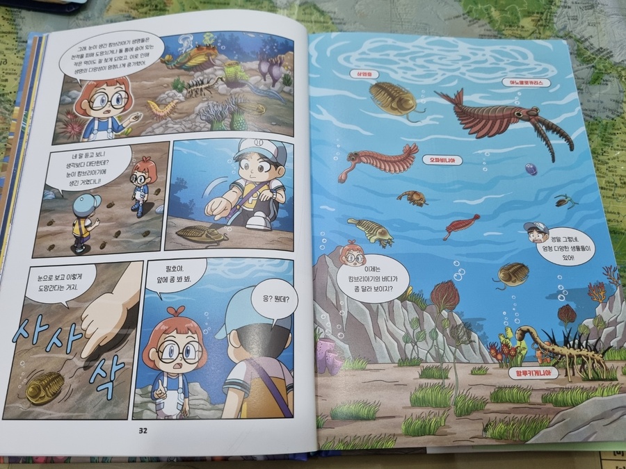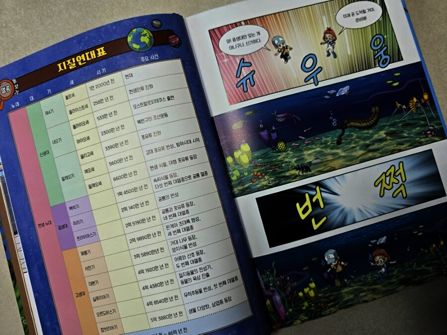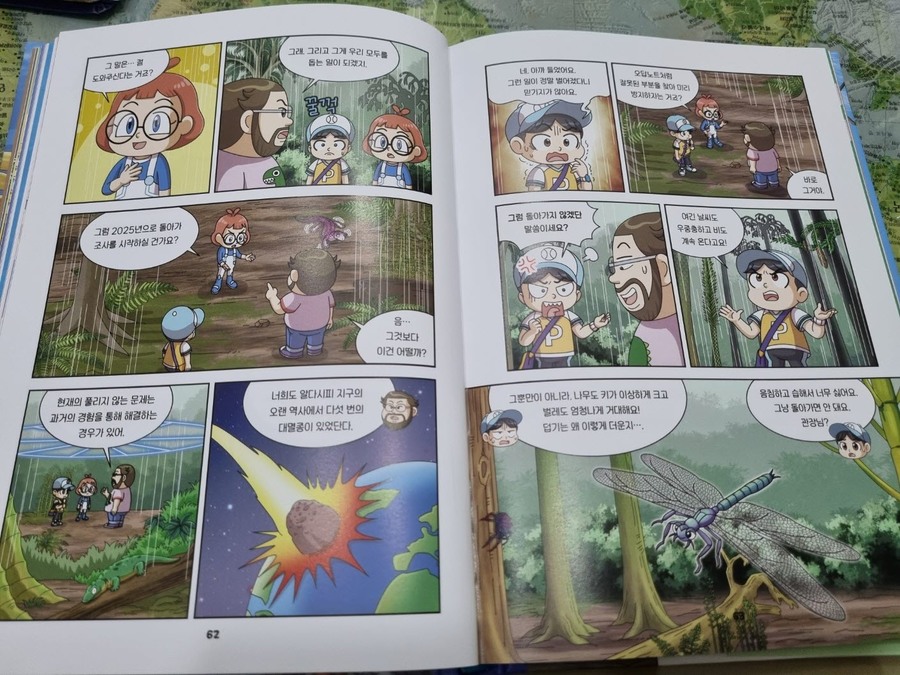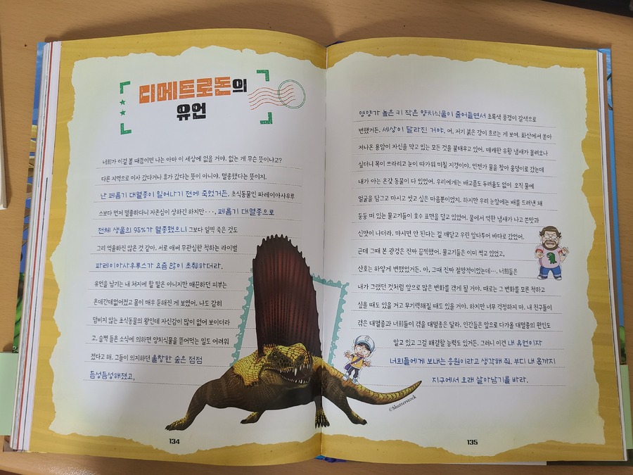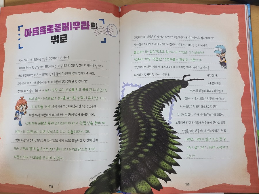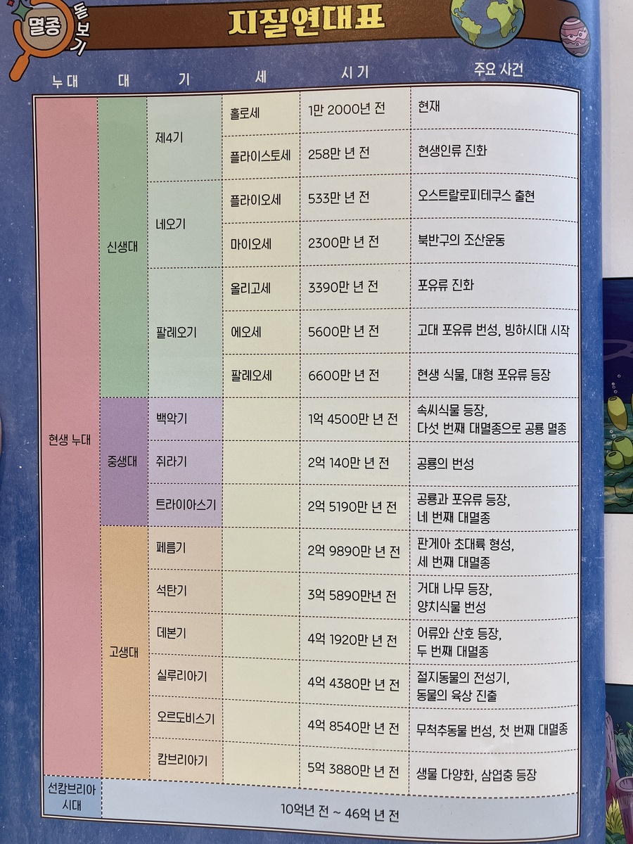 이 책은 2150년, 여섯 번째 대멸종을 막기 위해 미래에서 온 자연이와 필호가 사라진 털보 관장님을 찾아 고생대로 시간여행을 떠나는 이야기로 시작됩니다. 흥미롭고 유쾌한 만화 형식 덕분에 어려운 과학 개념도 자연스럽게 흡수되었고, 무엇보다 ‘멸종 생물들이 남긴 메시지’는 아이와 저에게 현재의 위기에 대해서 깊게 생각해 볼 수 있는 계기가 되었습니다. 🌍 고생대 생명체를 만나는 특별한 경험 중생대 공룡은 익숙하지만 고생대 생물들은 사실 우리에게 익숙하지 않았습니다. 그래서 이 책에서 만난 각종 새로운 생명체들은 정말 신선했습니다. “이런 생명체가 있었어?”라고 감탄하며 생김새와 생태, 그리고 그들이 어떤 과정을 통해 사라졌는지를 따라가다 보면 자연스럽게 지구의 기후 변화와 생태계의 변동을 이해하게 됩니다. 🔥 ‘세 번째 대멸종 – 페름기’가 준 충격