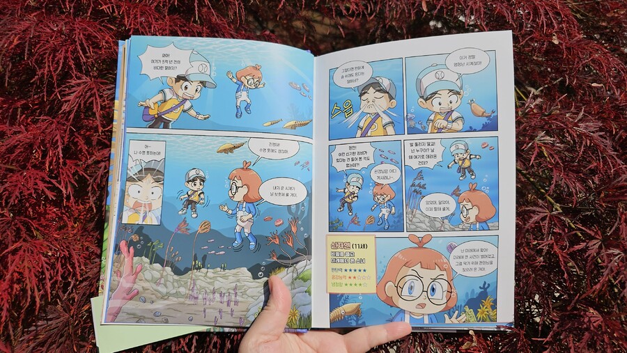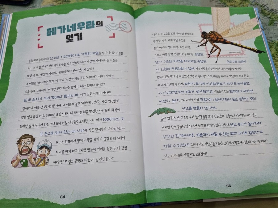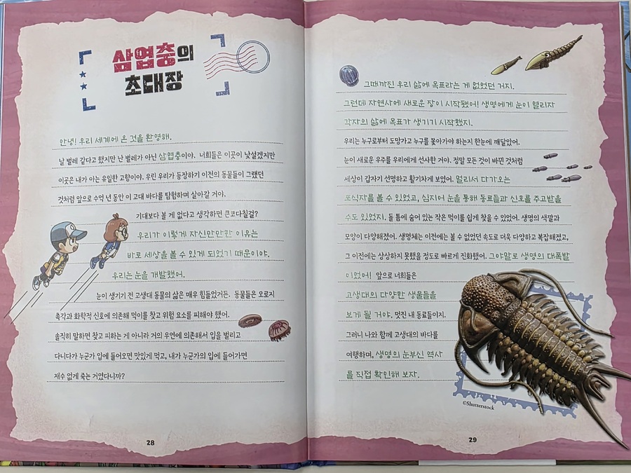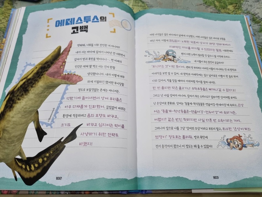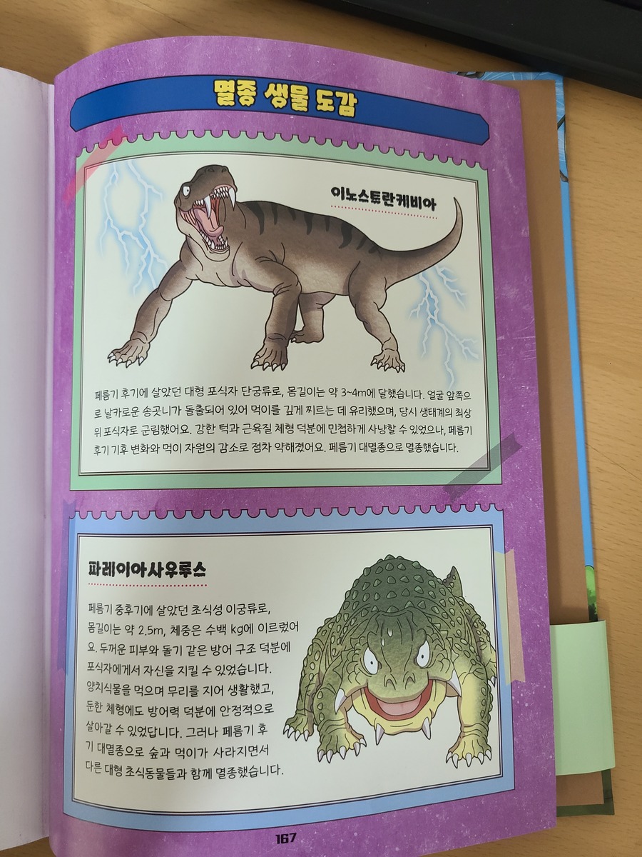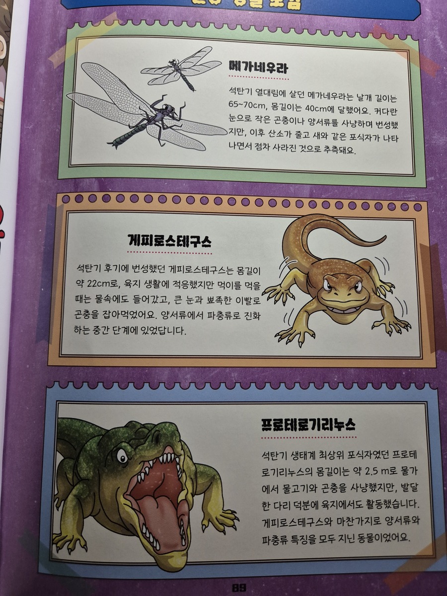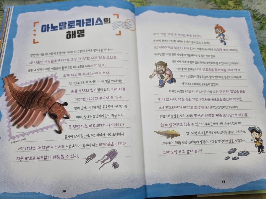 이 책은 2150년, 여섯 번째 대멸종을 막기 위해 미래에서 온 자연이와 필호가 사라진 털보 관장님을 찾아 고생대로 시간여행을 떠나는 이야기로 시작됩니다. 흥미롭고 유쾌한 만화 형식 덕분에 어려운 과학 개념도 자연스럽게 흡수되었고, 무엇보다 ‘멸종 생물들이 남긴 메시지’는 아이와 저에게 현재의 위기에 대해서 깊게 생각해 볼 수 있는 계기가 되었습니다. 🌍 고생대 생명체를 만나는 특별한 경험 중생대 공룡은 익숙하지만 고생대 생물들은 사실 우리에게 익숙하지 않았습니다. 그래서 이 책에서 만난 각종 새로운 생명체들은 정말 신선했습니다. “이런 생명체가 있었어?”라고 감탄하며 생김새와 생태, 그리고 그들이 어떤 과정을 통해 사라졌는지를 따라가다 보면 자연스럽게 지구의 기후 변화와 생태계의 변동을 이해하게 됩니다. 🔥 ‘세 번째 대멸종 – 페름기’가 준 충격