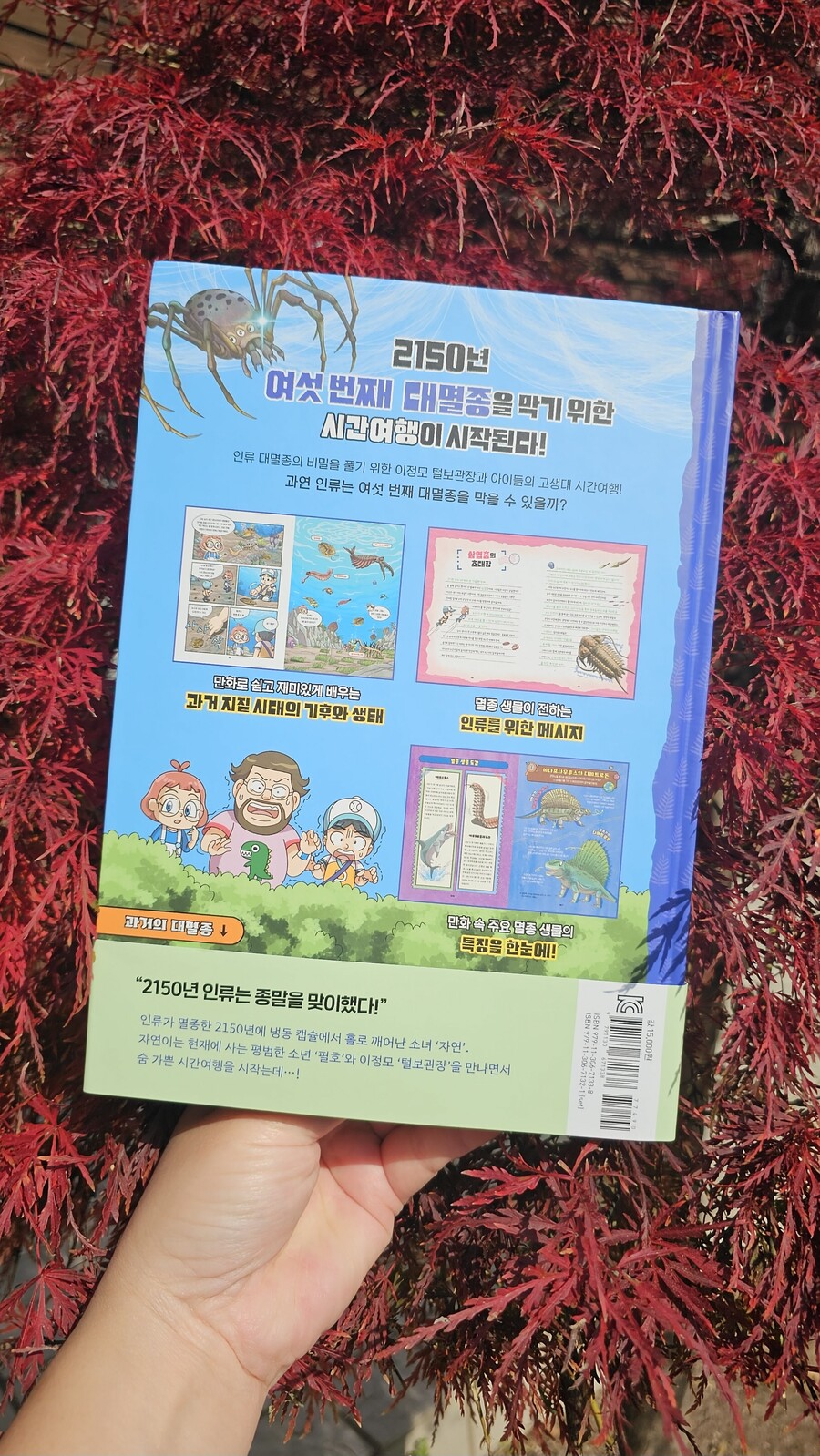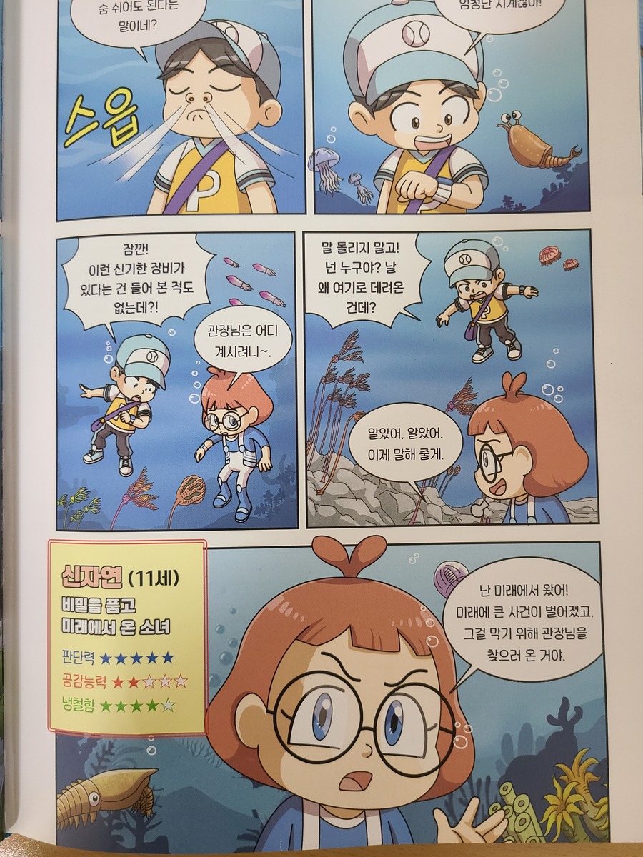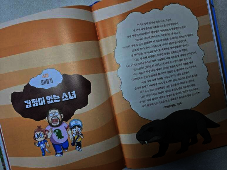 주인공인 ‘신자연’은 시간여행을 통해 지구의 거대한 역사 속으로 가서 멸종을 막을 단서를 찾아다니게 되어요. 고생대에서 신생대까지 실제 존재했던 멸종 생물들을 보며 탐험을 하는데, 그곳에서의 생물들과 자연의 변화를 만화를 통해 생생하게 전달받을 수 있답니다. 고생대 캄브리아기의 삼엽충, 아노말로카리스 같은 바다생물, 파레이아사우루스, 이노스트란케비아 같은 육지생물까지 고생대의 생물을 좀 더 실감이 나게 만나보실 수 있어요.