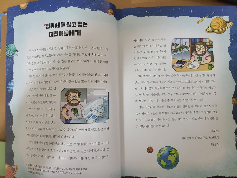 대충 훑어보아야지 하는 첫 마음과는 달리 어른인 내가 보아도 술술 읽히는 재미난 이야기와 멸종동물들의 편지 이야기를 보면서 나도 모르는 사이에 흠뻑 빠지게 되었다. 이래서 아이들이 이렇게나 좋아했구나 이해 되기도 했다.