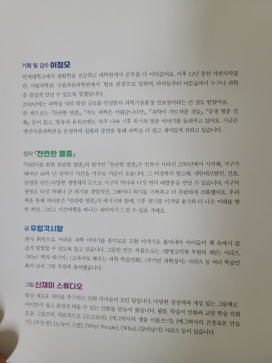 단순히 만화책인 줄 알았다가 책의 내용에 빠져서 작가가 누구인지 검색해보니 이미 과학 분야의 베스트셀러인 [찬란한 멸종]을 쓰신 이정모 작가님이셨다. 책 속에 등장하는 ‘털보관장님’이 바로 ‘털보관장’ 이정모 관장님이라니. 더욱 신선하고 재미있게 다가왔다.