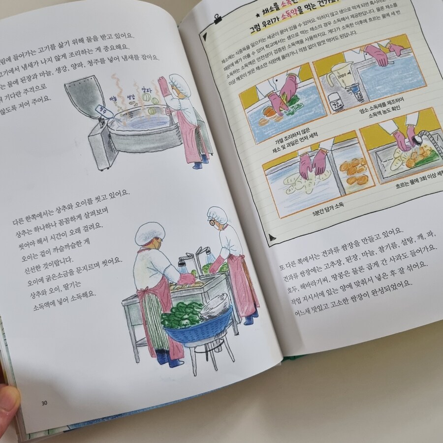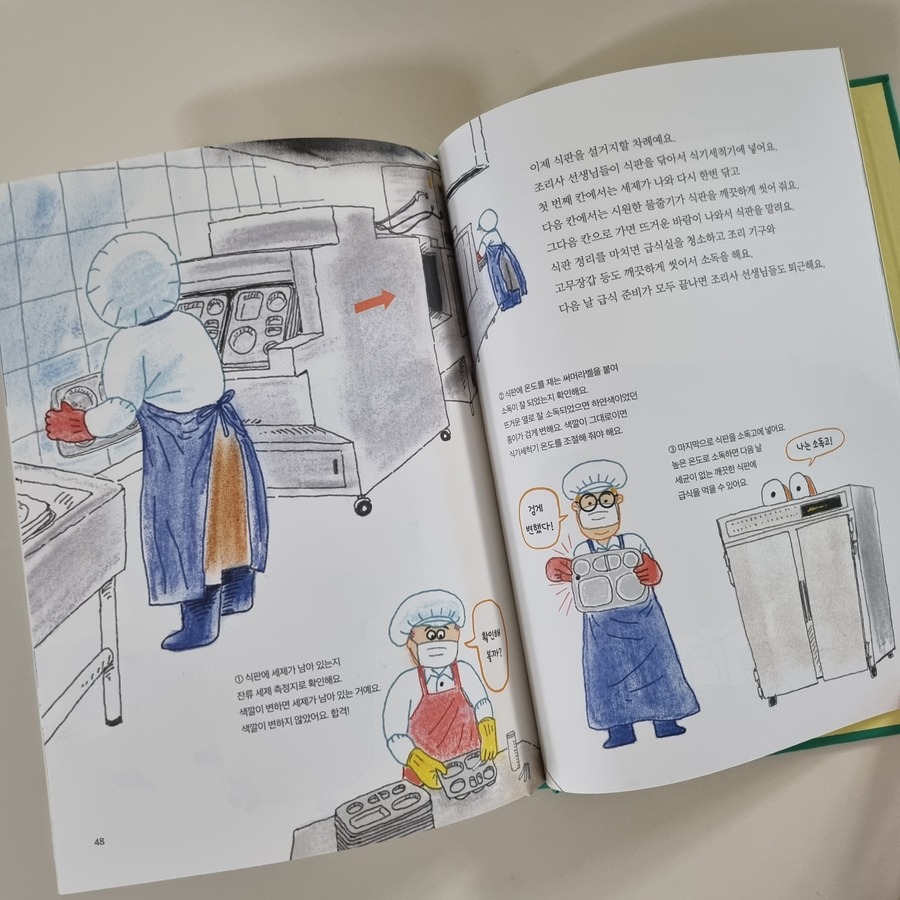 *출판사로부터 도서를 제공받아 주관적으로 작성한 글입니다. 아이들이 매일 먹는 급식은 어떻게 만들어질까요? 편식하는 아이들도 많고 남기는 아이들도 많은데 이 책을 통해 급식이 얼마나 정성스럽게 만들어지는지 이해하고 잔반을 남기지 않는 습관을 가지면 좋을 듯 합니다. 학생들이 먹는 급식이 식판에 올라가기까지 아주 많은 과정을 거칩니다. 영양사 선생님이 영양 분석을 하고 그에 맞게 재료도 구입해서 맛있게 급식을 만듭니다. 급식식의 시작은 아침 7시 30분부터 시작입니다. 조리사 선생님이 일찍 출근해서 맛있는 급식을 제공하기 위해 부지런히 준비하십니다. 출근하자마자 건강체크를 합니다. 배가 아프거나 전염이 되는 병에 걸리면 아이들에게 영향을 줄 수 있기 때문입니다. 본격적으로 급식을 만들기 위해 고무장갑, 위생모자, 고무장갑, 방수앞치마, 고무장화등을 신고 준비를 합니다. 급식을 만드는 순서는 어떻게 될까요? 우선 식재료들이 제대로 들어왔는지 확인하고 수량 체크 후 검수하는 과정을 거칩니다. 조리하기 전 식재료를 깨끗이 씃고 조리를 시작합니다. 마지막 단계는 세척입니다. 급식실에는 각 단계마다 다른 색깔의 앞치마와 고무장갑을 착용합니다. 세균이 옮겨 가지 않도록 하기 위해서입니다. 청결은 정말 중요하게 생각하는 부분이라 식중독을 예방하기 위해서 손을 씻고 위생 장갑을 끼고 소독을 또 합니다. 학교에서는 껍질 벗긴 채소를 산다는 걸 알고 있나요? 흙에는 식중독을 일으키는 균들이 많아 잘못 손질하다가는 식중독을 일으킬 가능성이 있기 때문에 더 더욱 껍질을 벗긴 채소를 구입합니다. 그리고 친환경 농산물을 사용하며 환경을 지키기 위해 노력합니다.