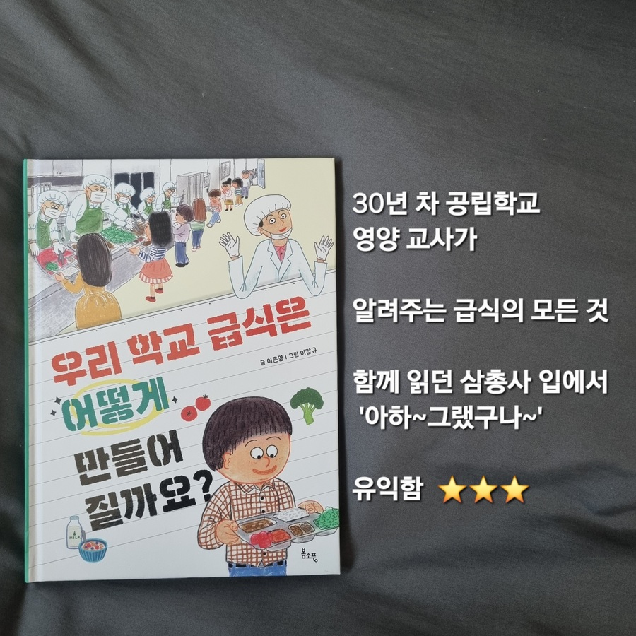 저희 집 삼총사는 학교에 가는 낙(樂)이 체육 시간과 급식 시간 이랍니다. 오늘은 체육을 하나? 운동장에 나가나? 그리고 오늘 급식 메뉴가 뭐지?가 인생 최대의 관심사입니다. 어쩔 수 없이 애미 닮았구나😌 인생 최대 낙(樂)이 점심 메뉴인 저랑 똑 닮았어요. 그런 삼총사랑 재미있게 읽은 그림책입니다♡ ☑️급식에 진심인 초딩을 둔 부모님께 추천합니다👍 #우리학교급식은어떻게만들어질까요? 30년 차, 영양교사 이은영 선생님께서 급식에 관한 모든 것을 썼습니다. 책 속으로 gogo~📚 조리사 선생님들께서 입는 앞치마의 색깔 수가 4종류, 요리 할 때 사용하는 도마의 색의 수도 4종류, 급식에 사용하는 야채는 껍질 벗긴 야채를 구매하고 좋아하는 탕후루는 급식 메뉴로 나올 수 없는 이유까지 자~~~~~세하게 알 수 있습니다. 알쓸급잡입니다.👍 매일 먹는 급식이 내 식판에 담기까지 그 안에 많은 노고가 있음을 자연스럽게 알게 되는 책입니다. 지식 그림책이지만 술술~읽힙니다. 아마도 #이갑규 작가님의 생동감 넘치는 그림 덕분이겠죠. (삼총사 최애 작가님 중 1분♡) 삼총사랑 몇번 더 보고 학교 도서관에 기증할 예정입니다. @bomsopung_book 덕분에 잘 읽었습니다🙏 #우리학교급식은어떻게만들어질까요#이은영#이갑규#봄소풍#그림책추천#영양그림책#급식그림책#그림책 |