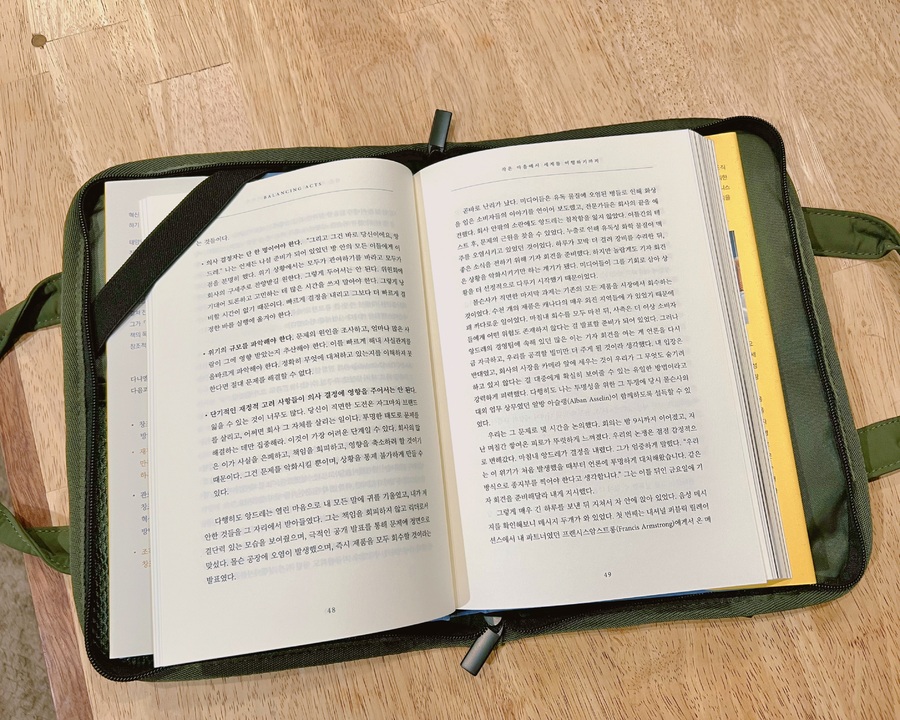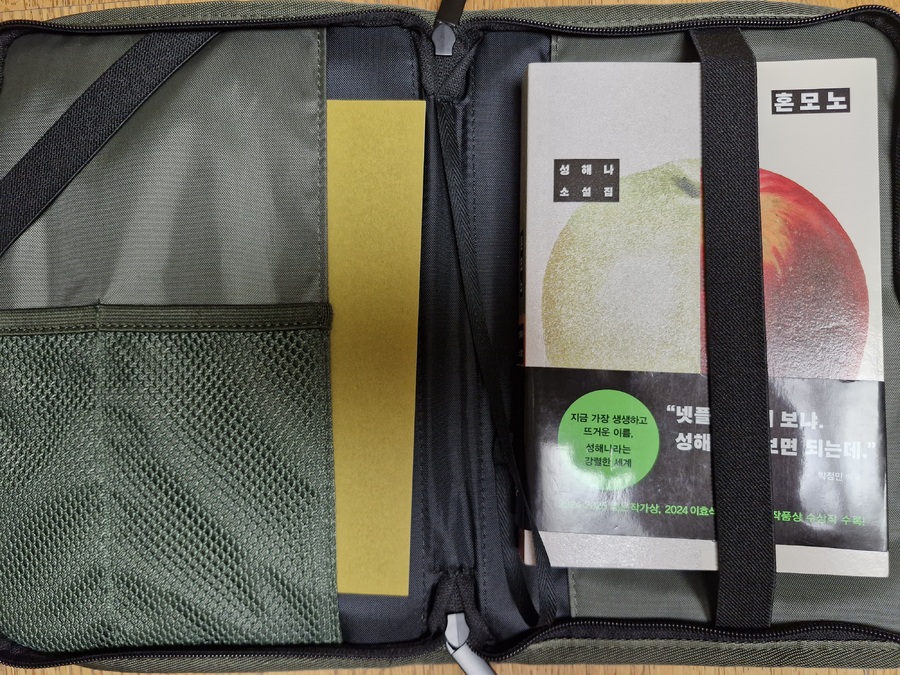 평소에 북커버를 갖고싶었는데 마침 출시되서 가족 모두 색깔별로 샀어요.손잡이가 있어서 들고다니기 편하고 안에 지퍼로된주머니가 있어서 포스트잇이나 펜을 담아다닐수있어서 좋아요. 실용적이고 깔끔하고 잘활용할 수 있을 거 같아요. |