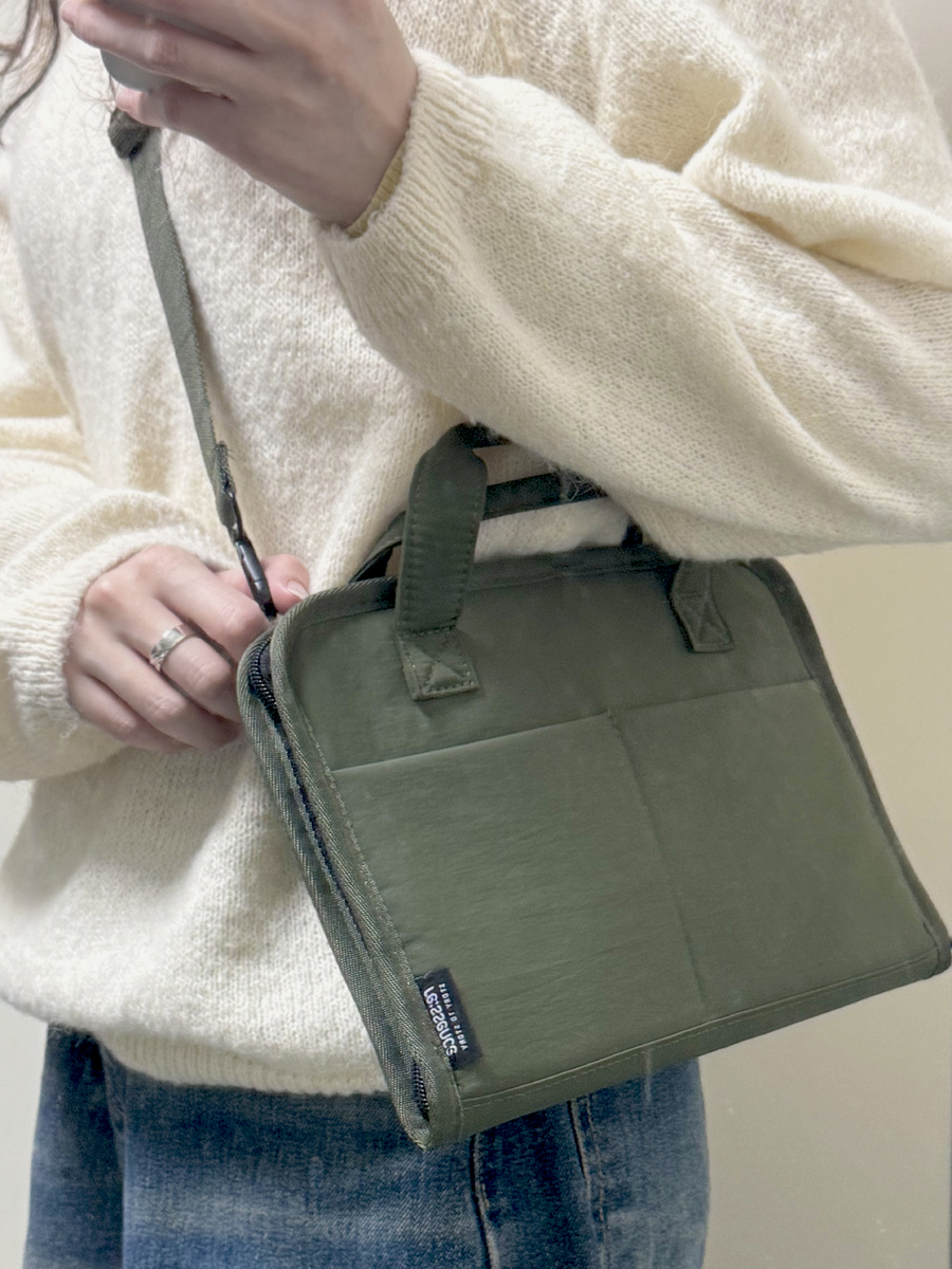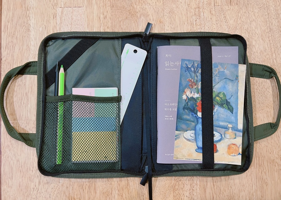 책 한 권과 노트 정도만 들고 나가는 일이 많은 편인데 항상 가방이 좀 거추장스러웠어요. 그런데 요 북백이 딱 맞춤한 사이즈라 요긴하게 잘 쓸 것 같습니다. 질감도 아주 좋고 내부에 수납할 곳도 꽤 많아서 펜, 기록장, 북마크 등등 잘 넣고 다닐 거 같네요. 색깔이 사진에서 본 느낌보다 살짝 진한 카키색이라 약간의 아쉬움이 있는데 그래도 퍽 예쁩니다. 만족합니다. |