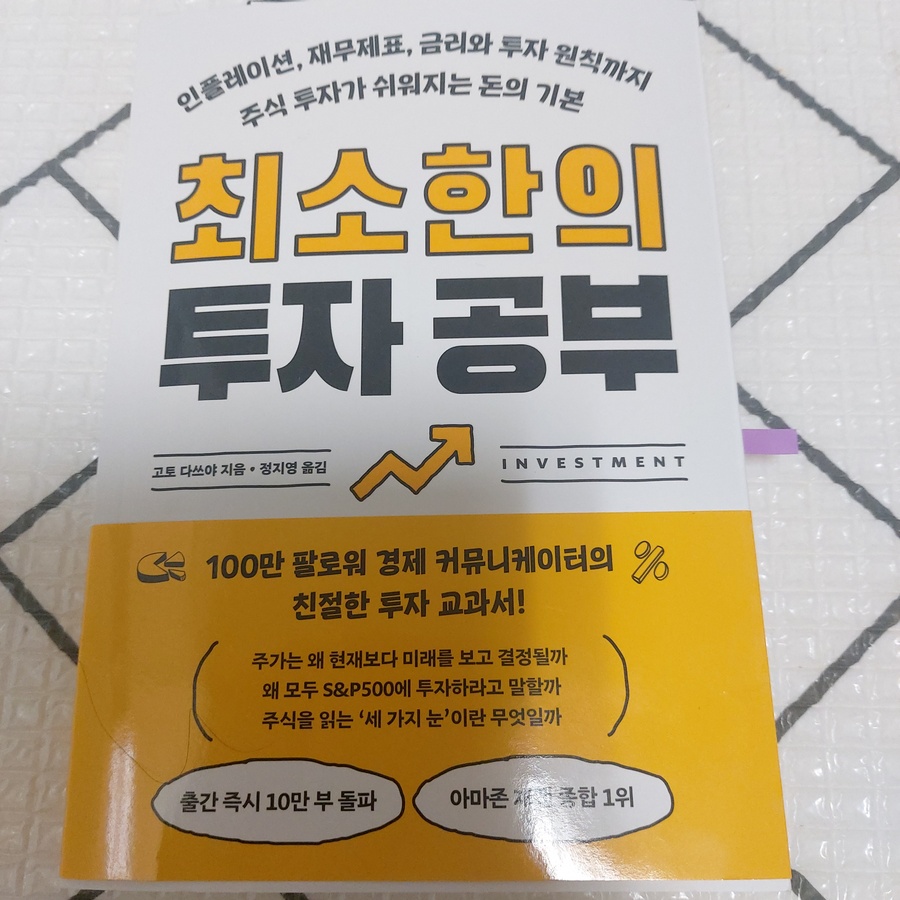 인플레이션, 재무제표, 금리와 투자 원칙까지 주식 투자가 쉬워지는 돈의 기본 최소한의 투자공부 100만 팔로워 경제 커뮤니케이터의 친절한 투자 교과서! 주가는 왜 현재보다 미래를 보고 결정될까 왜 모두 S&P500에 투자하라고 말할까 주식을 읽는 '세 가지 눈'이란 무엇일까 인플레이션이 큰 시대. 금리가 많이 낮아진 탓에, 투자에 관심을 가지고 있던 중, "최소한의 투자 공부" 라는 책을 알게 되었고 서평단에 참여하여 책을 받아 보게 되었다! 투자를 한다면 최소한으로 공부해야하는 책! 기초도 아직인 나에게 딱인 책이라는 생각이 들었다.