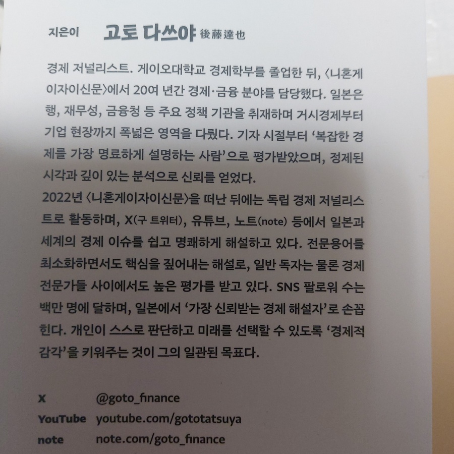 고토 다쓰야 경제 저널리스트. 일본과 세계의 경제 이슈를 쉽고 명쾌하게 x, 유튜브, 노트등에서 명쾌하게 해설하고 있다. SNS 팔로워 수는 백만명에 달하며 일본에서 '가장 신뢰받는 경제 해설자'로 손 꼽힌다. 개인이 스스로 판단하고 미래를 선택할 수 있도록 '경제적 감각'을 키워주는 것이 그의 일관적 목표라고 한다. 일본은 은행 예금하나에 자산을 집중하는 식의 투자가 강했는데 엔화 약세 인플레이션을 겪으며 최근엔 투자방식이 바뀌고 있다고 한다. 투자는 엔화 약세 인플레이션의충격을 완화하는 대비책이 될수 있다. 주가는 인플레이션 일때 쉽게 오르고, 외화 자산을 가지고 있다면 엔화약세에 대비할 수 있다. 자산 가치가 늘어나는 것이다. 다시 말해 자산을 은행 예금 하나에 집중하는 것은 리스크를 안게 된다는 뜻이다. 외화나 주식을 운용하고 있으면 엔화 약세나 인플레이션이 일어났을 때 보험 역할을 해 줄 가능성이 있다. 공격이 아니라 수비의 관점에서 투자의 의의를 다시 생각하면 투자를 보는 관점도 바뀔 것이다. 일본인이 주식 투자에 신중한 이유중에는 리스크를 좋아하지 않는 국민성도 한몫한다. 미국에서는 이직이 많고 일본에서는 적은 것도 이런 국민성을 반영할 것이다. 다만 그런 국민성도 변하고 있다. 20대를 중심으로 주식투자를 시작하는 사람이 증가하고 있다. 사회 구조가 변하지 않는 시대에는 리스크 회피형이 합리적은 생활방식이었을지도 모른다. 하지만 기술 진보의 속도가 빨라져 몇년 뒤에는 AI로 인해 일하는 모습이 크게 달라질 수도 있다. 그런 시대에서 막연히 주어진 업무만 하다보면 사회에 필요없는 사람이 될지도 모른다. 전환의 시대에서는 리스크를 감수하고 도전하면 얻을 수 있는 과실이 커진다. 반대로 실패를 두려워해서 현상 유지를 지속하면 손실을 볼 수 있다. 해댕 책에서는 주식이 무엇인지 부터 기초부터 알려준다., 주식회사를 설립할 때는 돈이 필요하다. 돈은 차입금과 주식 두종류로 나뉠수 있다. 주식은 자본으로 불리며 차입금처럼 갚을 필요가 없다. 주식에게 있는 2가지 권리 (배당, 의결권) 저자는 2022년에 작은 회사를 설립했으며 해당 회사 설립 이야기를 토대로 예를 들어 설명을 해준다. 주가는 현재보다 미래를 보고 결정된다. 다양한 이익중에서 우선은 영업이익이 중요하다. 주가는 무엇으로 움직이는 가. -주가를 보는 세가지 눈으로 무엇으로 움직이는 지 칼럼과 함께 알려준다. 중앙은행은 금융시장의 심장 투자를 시작하자 총 5개의 챕터로 투자에 대한 설명으로 쉽게 투자에 대해 공부할 수 있는 목차로 되어 있다. 저자가 일본사람이라 엔으로 금액이 기재되어 있지만 괄호안에 한국금액으로도 적혀 있어서 이해를 쉽게 할 수 있었고, 나도 일본사람들처럼 투자에 부정적인 부분이 많았는데 책을 읽으면서, 인플레이션이 심할 때, 화폐의 가치가 하락할 때에는 투자가 꼭 필요하구나 하고 느꼈다.. 책을 다시 한번 정독하며, 투자에 도전해봐야겠다고 생각했다. 나와 비슷한 주식을 잘 모르는 사람들, 투자에 관심이 없고 예적금만 운용하고 있는 사람들이 읽어보고 투자에 도전해보면 좋겠다는 생각이 들었다. 저자의 말처럼, 주식을 함으로써 세계에, 문화에, 현재 상황에 뉴스에 관심을 가지게 되고, 여러가지 방면에서 배울 수 있다는 점에서 큰 장점도 될 것 같다. |