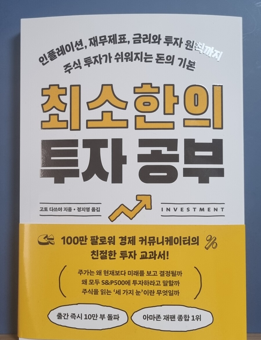돈을 모으는 것도 중요하지만 모아진 목돈을 불리는 투자 또한 중요한데요. 투자하기 앞서 최소 알아야할 기본적인 사항들을 담고 있는 고토 다쓰야씨의 최소한의 투자공부 도서 리뷰 후기를 남겨 볼게요. 주식 투자를 시작하면서 좋아하는 문구가 있습니다. 바로 주식의 대가 워렌버핏의 첫째도 둘째도 셋째도 잃지 않는 투자를 해야한다는 문구인데요. 투자하기에 앞서 돈을 잃지 않으려면 주식에 대한 기본적인 지식은 필수라고 생각합니다. 이 책을 읽으면서 왜 투자가 필수인 시대가 되었는지에 대해 생각해 보는 계기가 되었습니다. 오랫동안 20년 이상 경제금융분야에 몸담고 있는 저자가 쓴 도서라 더 신뢰성 있게 느껴졌습니다. 주가란 현재 보다 미래가 더 중요하다고 봅니다. 기업을 볼때 이달에 벌어들이는 수익보다 앞으로 5년, 10년에 걸쳐 이익이 점점 커지는지, 계속해서 수익을 낼 수 있는지가 훨씬 더 중요하다는 말에 공감이 되었습니다. 주식이란 무엇인가? 기업의 가치가 어떻게 만들어지는가? 금융정책과 시장은 어떻게 연결 되는지 등 경제의 핵심 개념을 비유로 알기 쉽게 풀어내서 이해하기 쉬웠습니다. 주식 투자를 하면서 공부를 하려고 하는데 어디서부터 시작하지 모르겠다는 분들에게 도움을 줄 수 있는 도서 입니다. 저 또한 주린이로서 주식투자 공부를 어떻게 하면 좋을지 방향을 잡아주었고, 주식의 기본적이고 기초적인 부분들을 알아보고 정리해 볼 수 있어서 좋았습니다. |