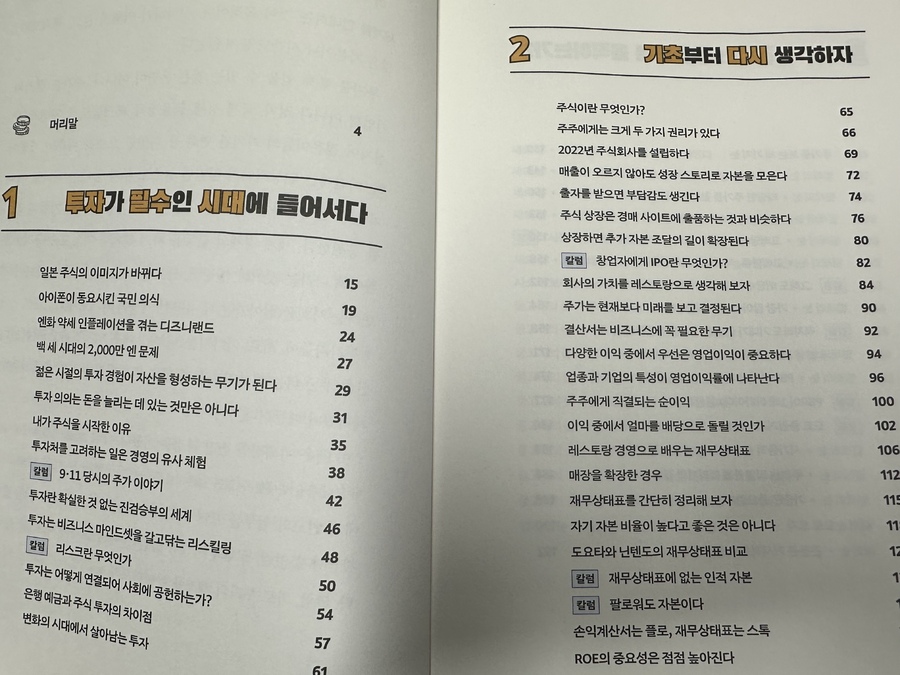 저자는 우선 투자에 대해서 앞으로 사회를 살아가는데 반드시 필요한 교양이라고 단언하면서, 투자를 통해 돈만 늘리는 것이 아니라 경제나 기업뉴스부터 정치, 사회, 첨단기술, 각종 사회문제까지 모든 세상사에 관심이 높아지면서 넓은 범위의 지식과 리스크 감수에 따른 대응 능력, 주가 메커니즘까지 알게 되면서 감정의 통제는 물론 자신에 대한 성찰까지 얻을 수 있다고 한다. 최근 러시아-우크라이나 전쟁, 미국과 중국의 충돌, 북한 리스크 등 다양한 국제정세의 급변 속에서 나를 지킬 수 있는 혜안이라는 부수 효과도 거둘 수 있으므로 저자는 투자에 대한 찬양을 안할 수가 없다는 것이다. 이러한 전제 속에서 주식투자에 대해 기본부터 다시 시작하자는 권고를 한다. 특히 저자가 가진 장점이 일상에서의 사례를 비유로 훌륭하게 주식투자를 설명하는 것인데 이 책에서 그의 역량이 극명하게 드러난다.