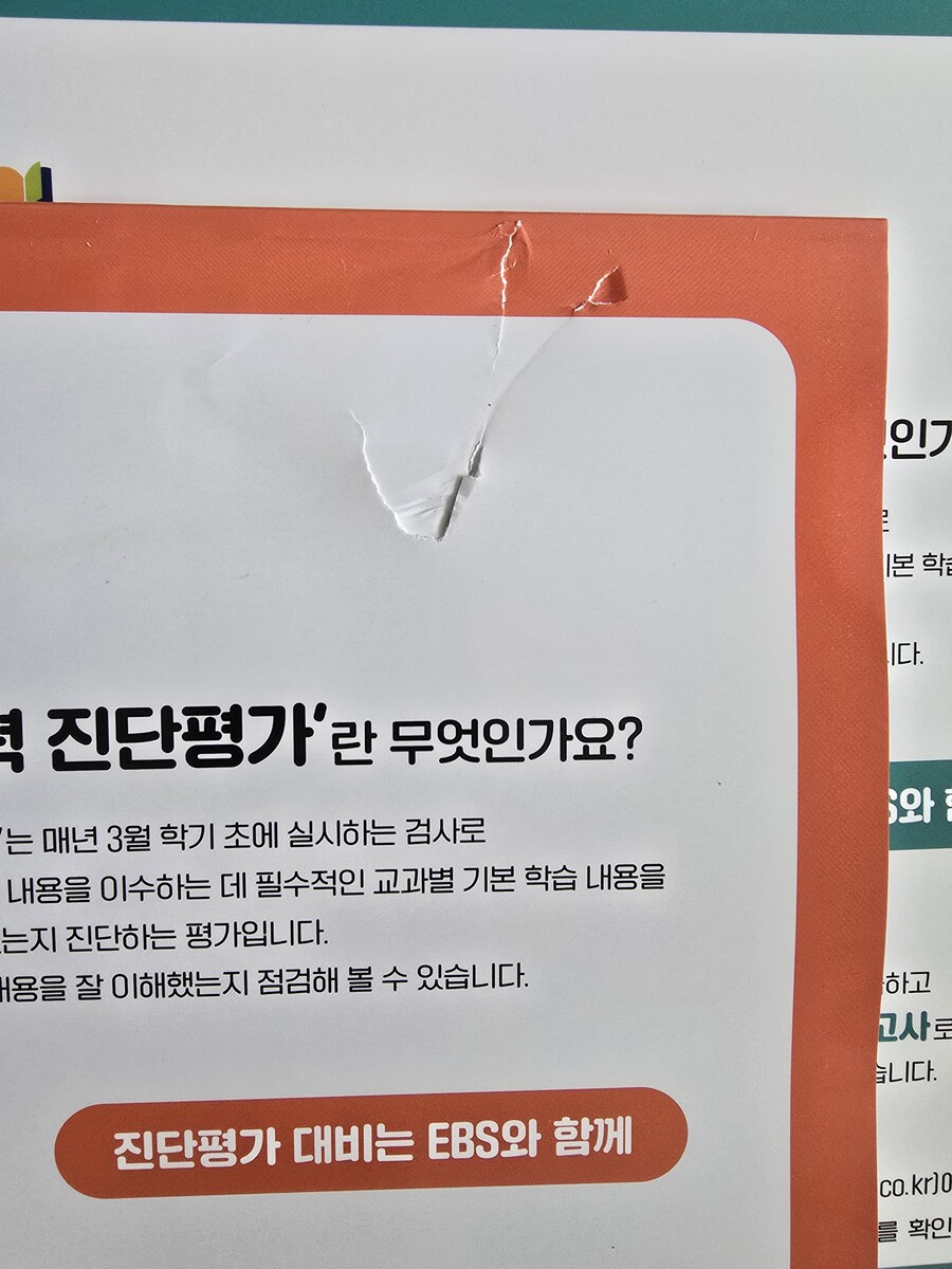 진단평가 대비해서 구매했어요. 아이가 혼자 풀기에도 좋고 다시 복습을 할 수 있어 좋습니다. 그런데 도착하자마자 포장 뜯어봤더니 책 표지가 이렇게 되어 있네요. 다행히 책 안은 괜찮았고 교환하기도 귀찮아서 그냥 사용합니다. 좀 더 신경써주셨음 좋겠네요. |