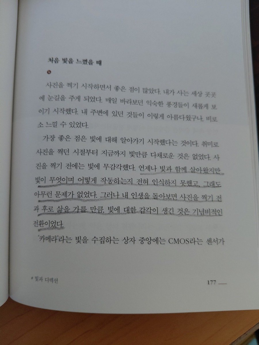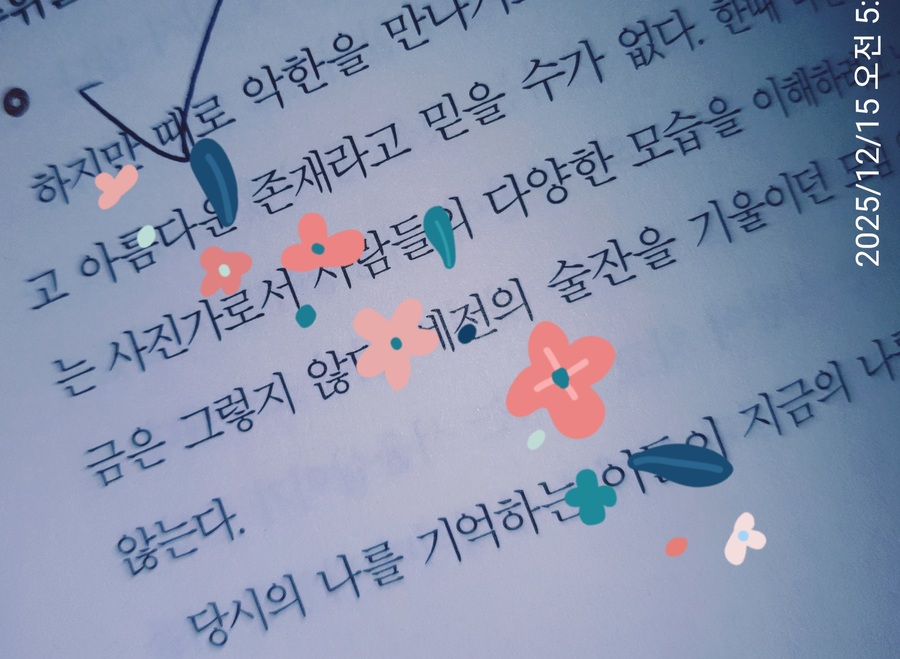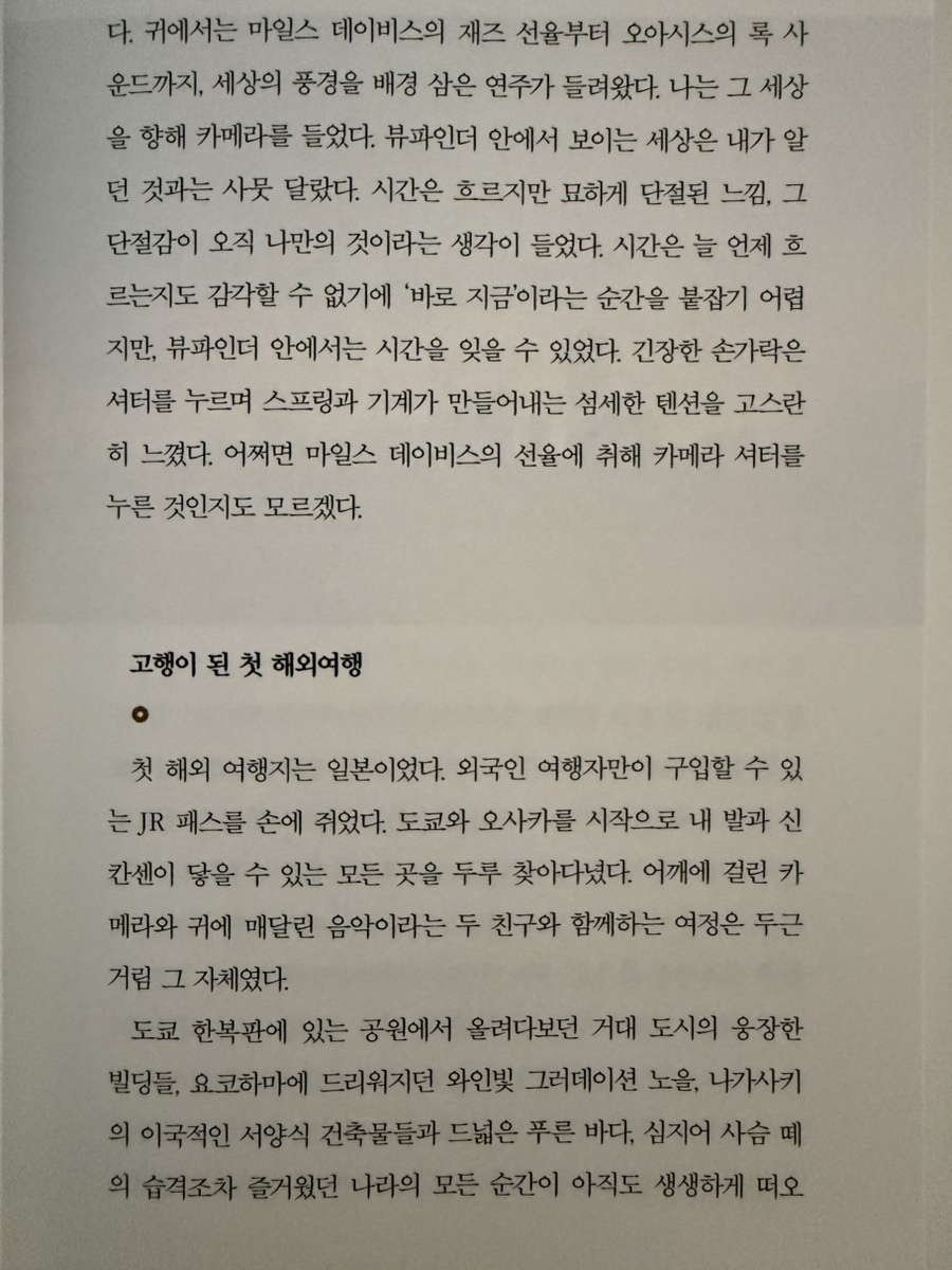 평소 취미로 캐논 AE-1을 들고, 이곳 저곳을, 그리고 그 공간에서의 가족의 모습을 담기 위해 필름을 감고 셔터를 누르는데, 그래서인지 이 책이 재미있었어요. 음악을 품고 자란 사람이 사진으로 말을 건네듯, 감각적인 묘사와 진솔한 고백을! 늘 사진을 찍을 때 음악을 틀어놓고 프레임을 잡곤 하는데,ㅍ 그럴 때면 소리와 빛이 서로 닮아가는 순간이 오죠. 저자도 결국 “사진이 된 내 안의 음악들”을 이야기하는데, 그 문장에선 저도 모르게 필름 카운터를 한 칸 더 돌리고 싶어지더군요. 무엇보다 좋았던 건 이 책이 단순한 직업 에세이가 아니라는 점이에요. 문학, 영화, 요리, 스포츠까지... 저자의 경험과 취향들이 사진이라는 큰 그릇 안에서 맛있게 어우러지는 듯한! 스스로를 길러온 다양한 문화예술적 토양들에 대한 내용들! 그리고 저자가 스스로 과제를 만들고 조명을 공부하며 스포츠 사진이라는 낯선 장르를 개척해나가는 과정에서는, 취미를 직업으로 연결하는 것에 대한 현실적 용기와 방법을 보여주는 것 같았어요. 은퇴를 앞두거나 이미 지나온 세월 속에서 소소한 즐거움을 찾는 이들에게도, ‘작은 도전’을 다시 시작할 동기가 되어 줄 수 있는 내용이었어요. 완벽할 필요는 없고, 다만 빛을 향해 한 걸음 더 나아가는 것, 어쩌면 그게 이 책이 말하는 핵심은 아닐까...하는 생각도 듭니다. 사진의 기술적인 팁을 기대했다면 조금 다른 책일 수 있지만, 예술을 직업으로 삼고자 하는 사람, 혹은 인생의 방향을 잃었을 때 다시 빛을 찾고 싶은 사람에게는 분명 위로와 공감과 영감을 줄 수 있는 책이에요. 필름을 현상소에 맡기고 결과를 기다릴 때의 그 떨림!! 정말 너무 좋잖아요~ '빛과 디렉션'은 사진을 좋아하는 분들께서 재미있게 읽을 수 있는 책이네요! *문장수집 [1] 지금 생각해보면 이 여정이 방황하던 청년기에 내면을 정돈하고 치유하는 과정이었던 것 같다. 여행과 사진에 빠져들지 않았다면 나는 이도 저도 아닌 미지근한 어른이 되었을지도 모른다. . [2] 태어나면서부터 피아노 소리를 들으며 자랐던 한 아이가 사회적 가치를 지향하는 사진가가 되기까지, 내 안의 나침반 바늘이 빙빙 돌다가 이제는 비로소 어떤 한 지점을 완벽하게 가리키고 있다. 인생 속에서 그런 방향성을 찾았다는 것이 요즘 나에게는 큰 행복이 아닐 수 없다. |