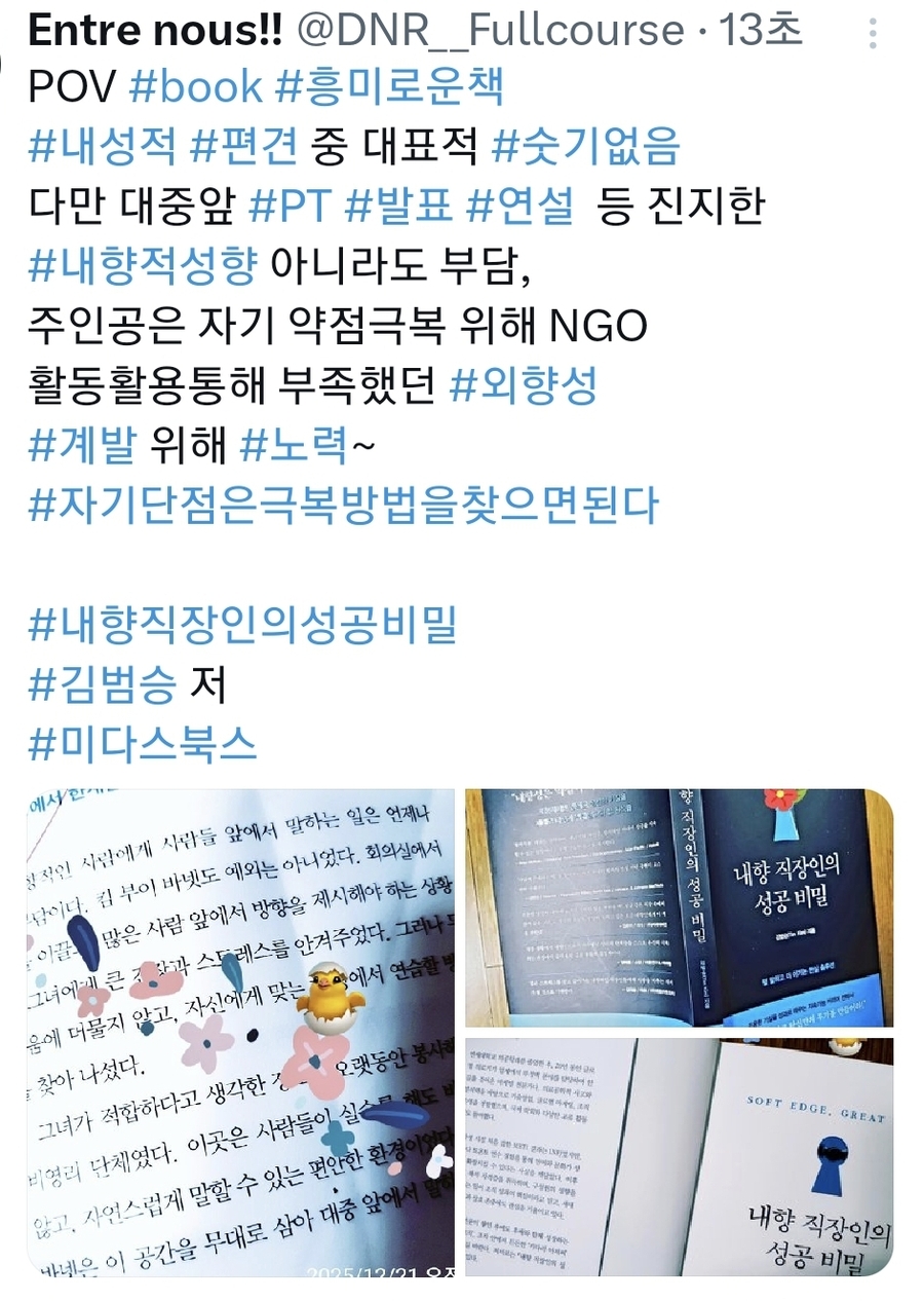 출판사 협찬 도서를 읽고 쓴 주관적인 리뷰 스미다 (펴냄) 직업인으로서의 에세이, 예술 에세이는 늘 흥미롭다. 이 책이 직업 에세이로서 설득력을 갖는 지점은, 흔히 자기만족, 자기표현식, 스펙을 위한 글쓰기나 에세이가 아니라는 점이다. 최근에 책을 쓰고 싶은 사람들의 욕망은 에세이 영역에서 가장 크게 반영된다. 글쓰기 코치들의 도움을 받아서 몇 달 만에 완성하는 에세이들이 일부 쏟아져 나오는데 지구를 사랑하는 마음이라면 그런 책은 종이책이 아니라 그냥 e북으로 개인 소장하시길!! 책의 저자는 방황을 미화하지 않으면서도 낭비로 치부하지도 않는다. 저자가 음악을 포기한 결정, 세계를 떠돌던 무계획한 시간, 팬데믹으로 모든 일이 끊긴 절벽 같은 시기 등 다양하다. 이 사건들은 결국 잘 됐다는 이야기로 정리되지 않는다. 대신 작가는 그때 무엇을 잃었고, 무엇을 새로 선택했는지 구체적으로 적어 내려갑니다. 직업 사진가로 살아남기 위해 얼마나 냉정하게 자신을 점검했는지, 예술과 생계 사이에서 어떤 기준을 세웠는지가 솔직하게 드러나는 부분은 감동이 있다. 흔히 직업 에세이를 만나면 독자들 혹은 이 분야 지망생들에게 헛된 꿈을 불러일으키는데 저자는 그렇지 않았다. 무작정 희망을 주는 것이 얼마나 위태로운가. 대신 지금의 선택이 내 삶의 디렉션을 어디로 돌리고 있는가라는 질문을 전한다.... 이 책은 사진가뿐 아니라 글 쓰는 사람, 기획자, 예술 노동자에게 유효한 부분이 많다. 책에서 얻은 나만의 가장 큰 가치는 스타일은 재능이 아니라 선택의 누적이라는 점이다. 저자의 사진 세계는 어느 날 갑자기 뚝딱 만들어지지 않았다. 어떤 작업을 거절했고, 어떤 방향의 의뢰를 받아들였는지, 어떤 빛을 ‘나답지 않다’고 느꼈는지가 하나의 스타일을 만든다고 내게 조언을 주는 듯하다. 창작에서 중요한 건 잘 해나가는 것보다 계속 선택하는 기준이라는 점을 분명히 보여준다. 실패를 서사로 만들지 않는 태도는 팬데믹 시기의 몰락 역시도 감정적으로 과장하지 않는다. 예술이 흔히 고독한 작업이라고 알고 있는데 저자의 책에 의하면 예술 역시 다양한 방식의 협업이라는 점이다. 인생에도 디렉션이 필요하다 삶이 저절로 흘러가게 두지 말고, 내가 어느 쪽을 바라보고 걷고 있는지는 스스로 정해야 한다. 디렉션이 없으면, 선택이 남의 기준이 된다. 방황을 ‘경력’으로 바꾸는 방식 오래 기억하고 싶다. #빛과디렉션 #직업에세이 #예술에세이 #사진작가에세이 #창작자의삶 #예술가로산다는것 |