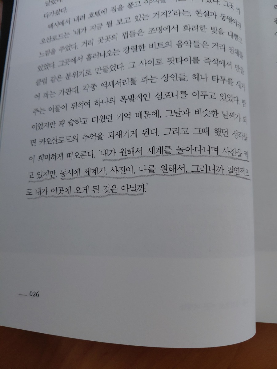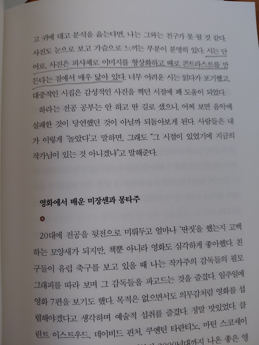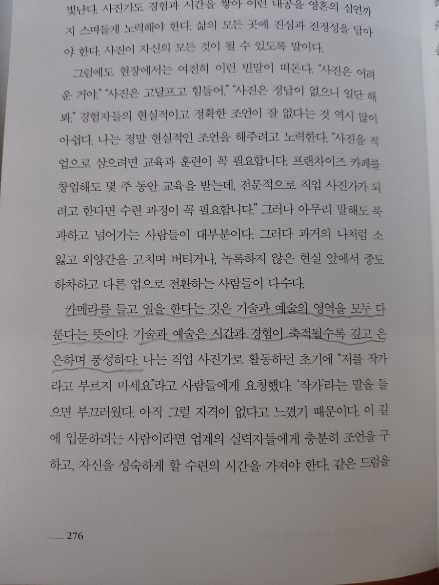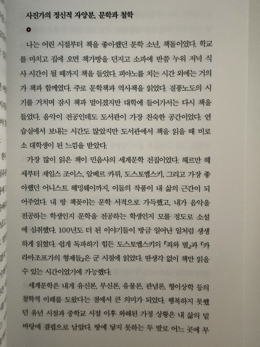 저자는 “연필을 쥐기도 전에 피아노부터 배웠다”는 평생 음악인으로 전공도 실용음악이라고 한다. 평생 음악만 해오다가 취업 진로에서 취미이던 사진을 선택하게 된 사람이다. 물론 처음 스튜디오를 차리고 망하기도 해 편의점 사장을 한 전적도 있다고 고백하기도 했다. 하지만 다시 사진으로 돌아왔고 그 여정에서 그는 “세계가, 사진이, 나를 원해서, 그러니까 필연적으로 내가 이곳에 오게 된 것은 아닐까.”라는 수준의 천직이자 소명으로 느끼기도 하는 것 같았다.