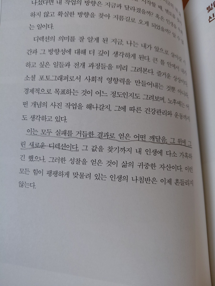 *본 포스팅은 출판사로부터 도서를 제공받아 주관적으로 작성한 리뷰입니다. 누군가 내게 "당신은 무엇을 쫓으며 살아가고 있나요?"라고 묻는다면, 나는 한동안 말문이 막힐 것 같다. 이번에 읽을 기회가 있었던, 이준희 작가의 책 여정을 따라가며 나는 계속해서 나 자신에게 질문했다. 나는 무엇을 향해 걷고 있는가. 내 손에 든 것은 무엇이고, 내가 응시하는 것은 무엇인가. 작가는 "빙빙 도는 나침반"이라는 표현을 사용했다. 얼마나 정확한 비유인가. 우리는 모두 어느 시점에 그런 나침반을 들고 서 있었을 것이다. 바늘은 미친 듯이 회전하고, 우리는 그것이 멈추기를 기다리며 불안해한다. 때로는 그 기다림이 너무 길어서, 나침반을 내던지고 싶은 충동마저 느낀다. 그런데 작가는 그 회전하는 바늘을 붙들고 세계를 방랑했다. 카메라라는 무거운 쇳덩이를 어깨에 메고, 의미를 찾아 헤매며, 빛을 쫓았다. 그의 이야기를 읽으며 나는 깨달았다. 방향을 찾는 것은 어느 날 갑자기 계시처럼 찾아오는 것이 아니라는 것을. 그것은 무수한 발걸음, 수많은 셔터음, 끝없는 자기 질문의 축적 속에서 서서히 모습을 드러낸다는 것을. 빛이란 무엇일까. 작가에게 빛은 사진의 기술적 요소만이 아니었다. 그것은 선이었고, 방향이었으며, 존재의 이유였다. “빛이 없으면 어둠 조차 인식할 수 없다"는 C.S. 루이스의 통찰을 사진으로 체현한 사람. 나는 그의 글에서 빛에 대한 거의 종교적인 헌신을 느꼈다. 우리는 각자 다른 빛을 쫓는다. 누군가에게는 그것이 음악일 수도, 글일 수도, 사랑하는 사람일 수도 있다. 중요한 것은 그 빛을 향해 걷는 것을 멈추지 않는 것이다. 설령 그 빛이 때로 너무 강렬해서 눈이 부시고, 때로 너무 희미해서 길을 잃을 것 같아도... "3승 20패." 작가가 자신의 인생을 야구 전적으로 표현한 이 대목에서 나는 웃음과 동시에 서늘함을 느꼈다. 얼마나 솔직한가. 얼마나 용감한가. 자신의 실패를 숫자로 정량화하고, 그것을 부끄러워하지 않는 태도다. 우리 사회는 승리만을 기억한다. 603승을 기록한 임요환을 기억하지, 그가 430번 패배했다는 사실은 쉽게 잊는다. 하지만 작가는 정확히 그 지점을 파고든다. 승률 60%의 '황제'도 열 번 중 네 번은 진다는 것. 그렇다면 우리가 진다는 것, 실패한다는 것에 대해 가진 공포 는 얼마나 과장된 것인가. 이 대목을 읽으며 내 삶의 전적표를 떠올렸다. 아마도 나는 작가보다 훨씬 더 참담한 성적표를 가지고 있을 것이다. 포기한 꿈들, 중단한 프로젝트들, 실패한 관계들. 그것들을 일일이 세어본다면 나는 아마 2승 30패 쯤 되지 않을까. 하지만 작가의 말처럼, "리그는 아직 한참이나 남았다." 무엇보다 감동적인 것은 그의 목표다. 한국시리즈 우승이 아니라, "와일드카드 결정전에라도 나가서 언더도그로서 한 팀 한 팀 격파"하는 것. 이 얼마나 현실적이면서도 낭만적인 목표인가. 그는 자신이 1등 팀이 될 수 없다는 것을 안다. 하지만 그래도 플레이오프에는 진출하고 싶어 한다. 그리고 그곳에서 누구도 예상하지 못한 반전을 만들어내고 싶어 한다. 우리에게 필요한 것은 바로 이런 종류의 희망이 아닐까. 완벽한 승리가 아니라, 다시 배트를 드는 용기. 무너진 담장을 걷어내고 벽돌을 다시 쌓는 끈기. 작가가 사십 줄에 접어들 어서도 "포기할 때가 절대 아니다"라고 말할 수 있는 것은, 그가 패배의 쓴맛을 충분히 알고도 여전히 게임에 남아있기 때문이다. "내 몸이 가루가 되어도 좋다." 작가는 자신이 원하는 촬영을 하기 위해서라면, 온몸에 힘이 빠질 정도로 지쳐도, 밤새 설계도를 그리며 잠을 못 자도 좋다고 말한다. 왜냐하면 그것은 "내가 하고 싶었던 일을 하고 있다는 명백한 증거"이기 때문이다. 나는 질문했다. 나에게도 그런 일이 있는가? 몸이 가루가 되어도 좋을 만큼 하고 싶은 일이? 고단함마저도 기쁨으로 느낄 수 있는 무언가가? 많은 사람들이 일과 삶의 균형을 이야기한다. 워라밸, 번아웃, 휴식의 중요성. 물론 그것들은 중요 하다. 하지만 작가가 말하는 것은 그보다 더 근원적인 무엇이다. 그것은 자신이 진정으로 원하는 것을 발견했을 때 느끼는, 거의 종교적인 헌신에 가까운 열정이다. 팬데믹 시기, 모든 것이 무너졌을 때도 작가는 카메라를 놓지 않았다. 한 손으로 절벽에 매달린 절박한 시간 속에서도 그는 새로운 프로젝트를 구상했다. <춤추는 사상>이라는 작품을 통해 소멸 위기의 지역에 에너지를 불어넣고자 했다. 생존의 문제와 예술적 지향을 동시에 붙잡으려 했다. 이것이 바로 직업 예술가의 삶이 아닐까. 그것은 낭만만으로도, 현실감각만으로도 유지될 수 없다. 두 가지를 동시에 움켜쥐고, 줄타기를 하듯 균형을 잡아가는 것. 때로는 넘어지고, 때로는 다시 일어서며, 끊임없이 자신의 중심을 찾아가는 것이다. 장애인 스포츠 촬영 현장에서 작가가 느낀 자책감과 깨달음도 같은 맥락이다. 앞을 볼 수 없는 선수들과 양팔을 잃은 선수들이 거침없이 바다를 헤쳐나가는 모습을 보며, 그는 자신의 나약했던 의지를 반성했다. 온전한 신체를 가진 자신이 겪었던 고통들이 "깃털처럼 가볍게" 느껴졌다고 했다. 이것이 바로 사진의 힘이 