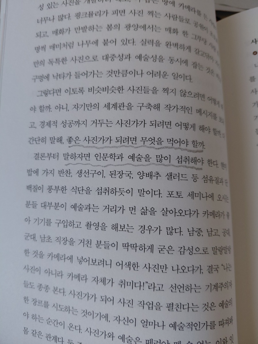 이 책은 소셜 포토 그래퍼 이준희 님이 집필한 ‘직업 사진가의 현실 에세이’다. 저자는 “예술가가 자신만의 철학을 가지고 예술 활동을 하는 것은 (어느 장르를 막론하고) 행위적 차이만 있을 뿐이지, 그 본질은 비슷하다는 것을 느낀다”고 고백하기도 한다. 바로 그다음 장에서는 “모든 물가가 상승하는데 사진 촬영 비용은 계속 하락하고 있다”며 직업 사진작가로서 생계를 걱정하는 말을 하기도 한다.