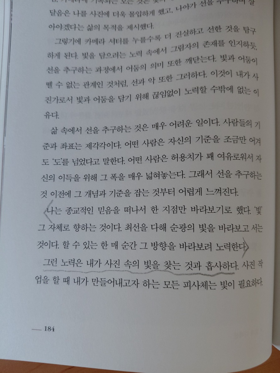 그는 “시는 단어로, 사진은 피사체로 이미지를 형상화하고 때로 콘트라스트를 만든다는 점에서 닮아있다”며 예술 사이의 공통분모 속에서 삶의 성찰을 얻는 과정을 그려주기도 한다. 모든 그림이 그렇지만 “피사체를 매개로 구현되는 이 사진이라는 것에서 빛은 다른 어떤 예술보다도 중요하지 않을까” 싶은데 그래서인지 빛에 대한 저자의 깨우침이 묘사되어 있기도 하다. “종교적 믿음과는 다른 빛”을 향하는 자신의 관점을 전하면서 “최선을 다해 순광의 빛을 바라보고 서는 것”을 “할 수 있는 한 매 순간 그 방향을 바라보려는” 자신의 노력으로 상징하며 사진가로서 “사진 속의 빛을 찾는” 것과 흡사하다는 감상을 담고 있기도 하다.