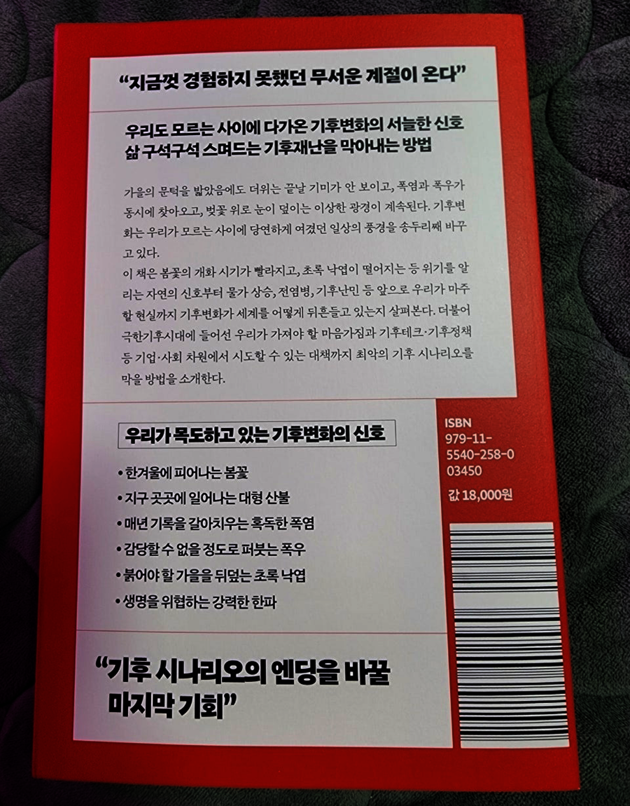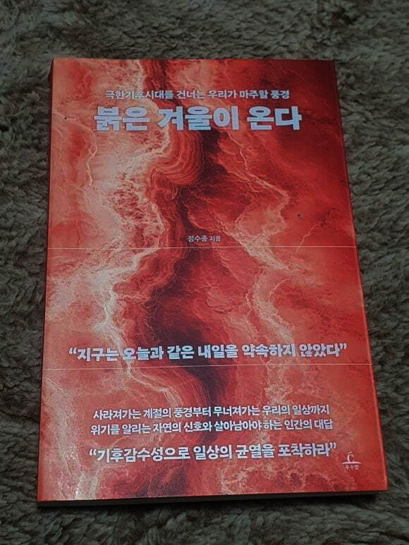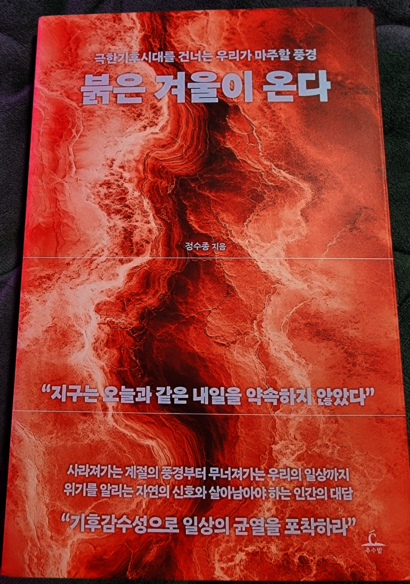 이 글은 출판사로부터 도서를 제공받아 자유롭게 작성했습니다. 극한기후시대를 건너는 우리가 마주할 풍경이라는 부제가 달린 이 책은 올 한해 우리나라를 둘러싼 이상 기후에 맞물려 과연 미래는 어떻게 될까?에 대한 많은 생각을 하게 해주었습니다. 이렇게까지 더워도 되는 것인지 지금껏 경험하지 못했던 무서운 계절이 오면 우리 인류는 어떻게 되는 것인지 살아남을 수 있을 것인지 우리도 모르는 사이에 다가온 기후변화의 서늘한 신호가 우리의 삶 구석구석에 영향을 끼치는데도 과연 이런 기후재난을 막아낼 방법이 있을지 의문이 생겼습니다. 우리가 목도하는 기후변화의 신호들 앞으로 전 세계가 마주할 기후재난 극한기후시대에 필요한 기후 대책 등을 알게 되면서 기후 시나리오의 엔딩을 바꿀 마지막 기회를 우리가 제발 놓치지 않게 되기를 바래보는 책읽기였습니다. # 이 글은 출판사로부터 도서를 제공받아 자유롭게 작성했습니다. ![]() ![]() ![]() 극한기후시대를 건너는 우리가 마주할 풍경이라는 부제가 달린 이 책은 올 한해 우리나라를 둘러싼 이상 기후에 맞물려 과연 미래는 어떻게 될까?에 대한 많은 생각을 하게 해주었습니다. 이렇게까지 더워도 되는 것인지 지금껏 경험하지 못했던 무서운 계절이 오면 우리 인류는 어떻게 되는 것인지 살아남을 수 있을 것인지 우리도 모르는 사이에 다가온 기후변화의 서늘한 신호가 우리의 삶 구석구석에 영향을 끼치는데도 과연 이런 기후재난을 막아낼 방법이 있을지 의문이 생겼습니다. 우리가 목도하는 기후변화의 신호들 앞으로 전 세계가 마주할 기후재난 극한기후시대에 필요한 기후 대책 등을 알게 되면서 기후 시나리오의 엔딩을 바꿀 마지막 기회를 우리가 제발 놓치지 않게 되기를 바래보는 책읽기였습니다. #붉은 겨울이 온다 #정수종 |