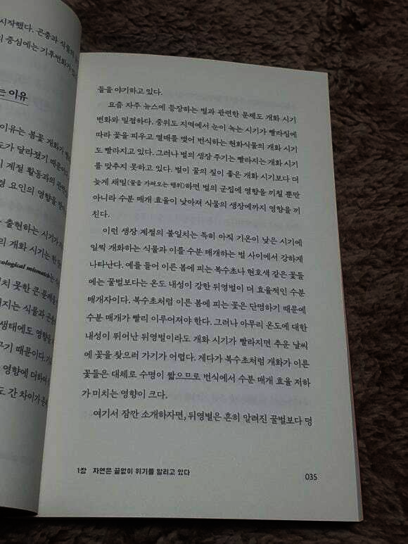 1장에서는 자연이 보내는 경고 신호에 대해 이야기한다. 특히 개화 시기가 앞당겨지거나 식물의 잎이 예년보다 이르거나 늦게 자라는 등, 어딘가 낯설게 느껴지는 계절의 변화에 대한 설명이 인상 깊었다. 이러한 개화 시기의 변화가 곤충을 비롯한 생태계 전반에 영향을 미치고, 결국 종 다양성의 위기로 이어진다는 점을 알게 되면서 기후위기는 훨씬 더 현실적인 문제로 다가온다.