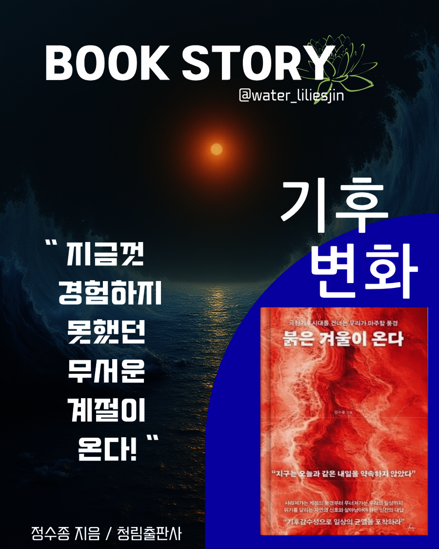 🦋BOOK STORY📚 극한기후시대 《 붉은 겨울이 온다.》 🌸 4계절의 변화가 뚜렷해서 계절마다 주는 아름다움이 가득했던 우리나라❤️ 눈 덮힌 산이 예쁜 하얀세상의 겨울❄️ 파릇 파릇한 연두빛의 새싹들이 주는 상큼함의 봄🌱 선명한 초록의 세상이었던 여름🌳 여러가지 예쁜 색깔로 물들어서 등산하기 좋은 계절 가을🍂 각자의 매력을 뽑냈던 4계절이 점점 그 빛을 잃어가고 있다. 봄,가을을 느낄 수 있는 날들이 너무 짧아 어느순간 사라져 버릴까봐 무섭다. 아니 슬프다😭 무엇이 그렇게 만들었을까❓️ 지구 온난화현상. 온난화로 인해 기후변화가 일어나면서 자연이 위협 받고있다. 온도가 올라감으로써 꽃들의 개화시기가 빨라지는데 곤충들은 그 속도를 따라가지 못한다고 한다. 식물과 곤충은 밀접한 관계가 있다. 식물과 곤충의 동조화가 깨지고 있다. 곤충의 변화가 식물의 변화에 또는 반대로 식물의 변화가 곤충의 변화에 영향을 미치는데 어긋나면서 탈동조화현상이 나타나기 시 작 했다. 기후변화로 인해 곤충과 식물의 균형이 깨지고 있다는 신호다. 자연의 기본적인 생태계가 파괴되고, 빙하가 녹기 시작 했으며, 해마다 다르게 여름은 폭염으로 열대야가 심해지고 겨울은 한파로 인해 더 추워지고 있다. 지구는... 자연은... 더 이상 기다려 주지 않는다. 이제 지구 온난화의 주범인 우리가 바뀌어야 할 때이다. 🩵 기후감수성 생소한 단어였다. 하지만 우리의 아이들에게 또 그 아이들의 아이들에게 물려줄 미래를 생각하면 꼭 알아야 하는 단어 이며 실천을 할 때이다. 기후과학자 정수종 지음 청림출판 @chungrim.official #청림출판 서평단에 선정되어 #도서협찬을 받아 작성한 주관적인 서평입니다. #붉은겨울이온다 #정수종 #청림출판 #기후위기 #한파 #환경 #기후감수성 #폭염 #폭우 #서울대 #과학#논술 #자연 #온난화 #수련