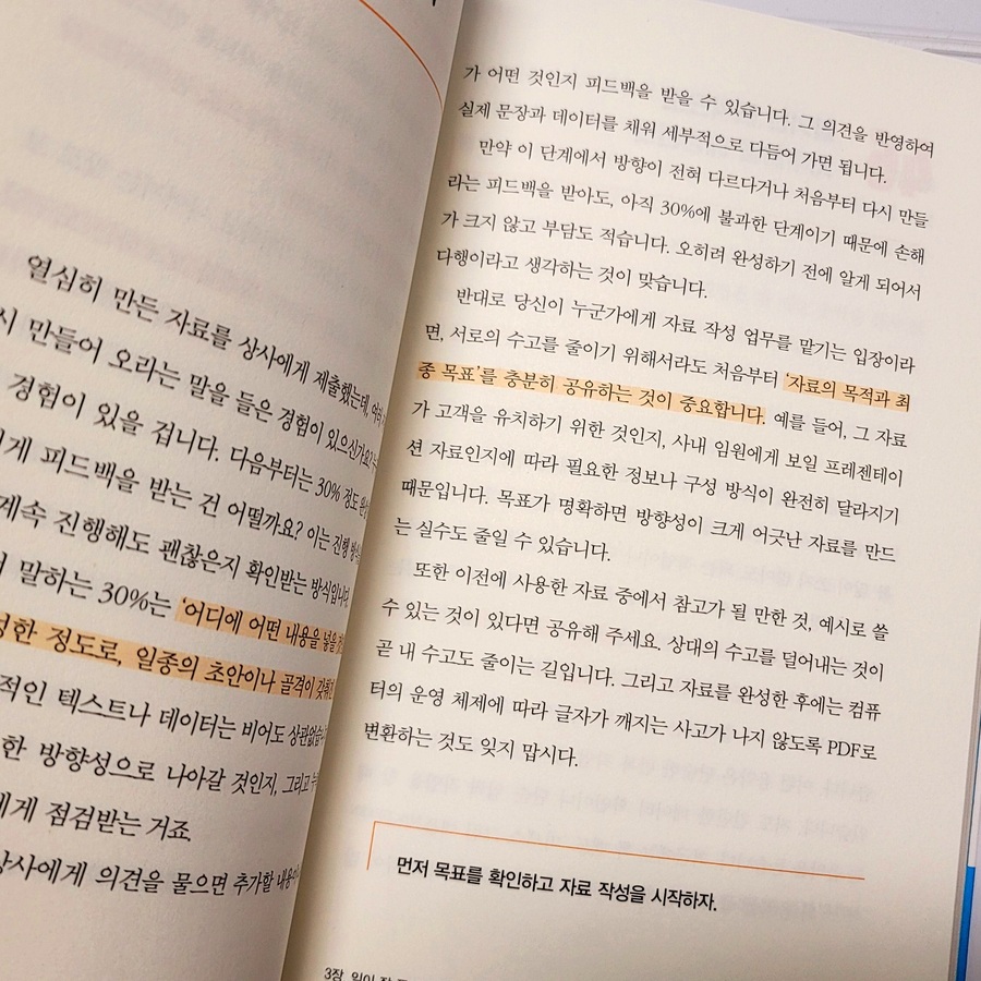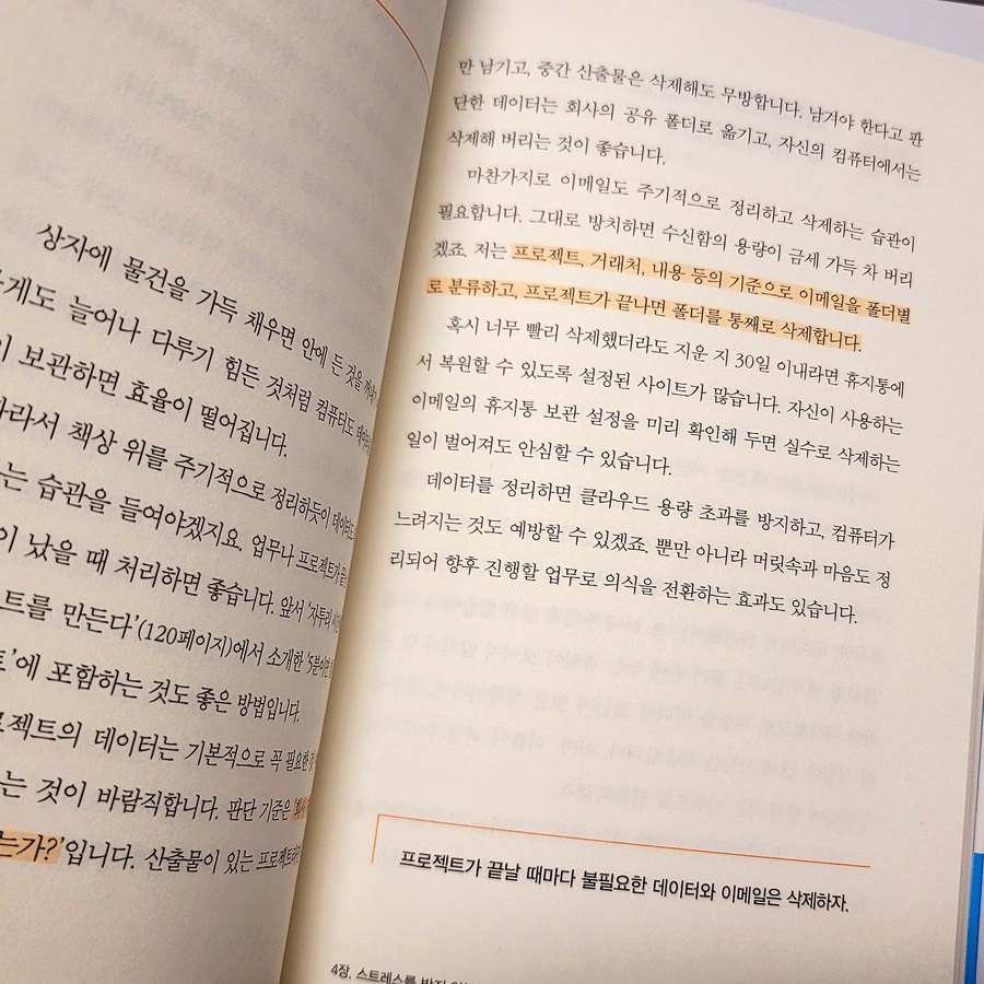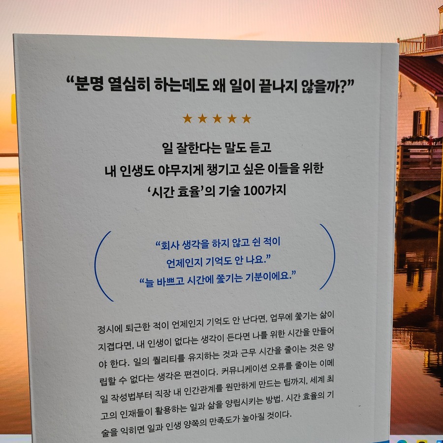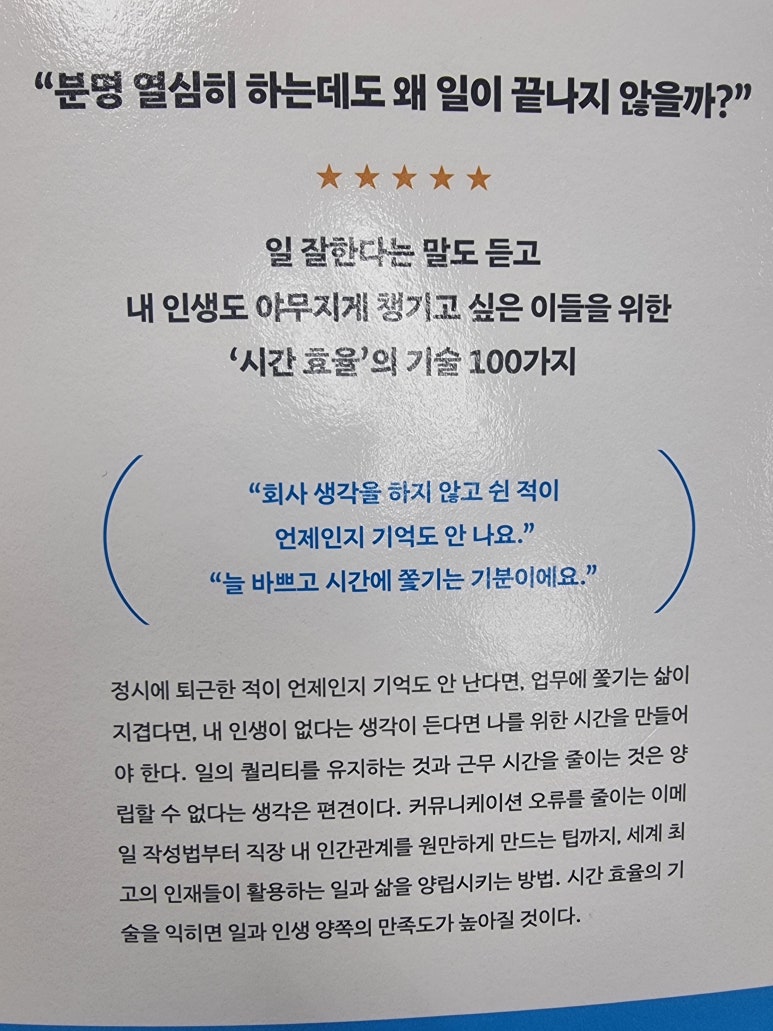 이 책을 읽으며 사회 초년생이던 시절을 떠올렸어요. . 영양사로서 새벽에 출근해 해가 질 때까지 일에 파묻혀 지냈었거든요. . 야근이 미덕이라 여겨지던 시절. 현재까지도 많은 사람들이 '열심히'와 '오래'를 혼동하며 일합니다. . 퇴근시간을 앞에 두고도 자리를 지키는 이유는, 업무가 끝나지 않아서이기도 하지만 완벽하게 끝내지 못한 자신에 대한 불안 때문이기도 합니다. . 이 책은 그 익숙한 불안을 정면으로 마주할 수 있는 기회를 줍니다. . 일을 적게 하는 것이 아니라 제대로 하라는 것. 그 기준은 '시간'이 아니라 '집중력'입니다. ㅡ 1️⃣ 문제는 시간이 아니라 일하는 방식이다 무심코 반복해오던 비효율적인 업무 습관들을 하나씩 바꿔나가야 한다 . ✔️모든 일을 당장 처리하려는 태도 ✔️중요도와 상관없이 동일한 에너지를 쓰는 방식 ✔️집중을 방해하는 잦은 메신저. 회의. 확인 습관 . 야근의 원인은 업무량이 아니라 일의 설계에 있다. . 일을 시작하기 전의 정리, 일하는 중의 선택, 일을 끝내는 기준이 바뀌지 않으면 퇴근 시간은 절대 앞당겨지지 않는다. ㅡ 2️⃣ 완벽함은 줄이는 데서 시작된다 완벽하게 일한다는 것은 해야 할 일과 하지 않아도 될 일을 분명히 구분하는 능력에 가깝다. . 지금 이 일이 정말 내 역할인가 이 결과물에 지금 수준의 에너지가 필요한가 오늘 끝내야 할 일과 내일 해도 되는 일은 무엇인가 . 이런 질문들이 쌓일수록 업무의 밀도는 높아지고 퇴근 후의 삶은 자연스럽게 되돌아온다 . 이 책의 내용들이 와닿는 이유는 이 모든 변화가 '현실적인 범위' 안에서 가능하다는 점이다. ㅡ 3️⃣ 나의 삶을 지키기 위한 일의 기술 이 책은 자기계발서이면서 동시에 삶의 태도에 관한 책이다. . 퇴근 후 가족과의 시간, 나만의 시간들을 지키는 일은 나의 에너지와 삶의 우선순위를 존중하는 선택이기 때문이다. . 시간 효율을 높이려면 요령을 습득하는 것 자체에 집착하지 말고 그것을 행복한 삶으로 향하는 도구로 인식해야 한다. ㅡ 💙 이 책을 통해 느낀 가장 큰 메시지는 시간을 잘 쓴다는 것이 결코 나를 더 혹사시키는 일이 아니라는 점이었습니다. . 💙 능력 있고 일 잘하는 사람들은 더 오래 일하지 않았고 더 바쁘게 움직이지도 않았습니다. 대신 자신의 에너지를 어디에 써야 할지 분명히 알고 있었을 뿐입니다. . 💙 결국 시간 효율의 핵심은 기술이 아니라 선택이라는 생각이 들었습니다. 무엇을 할지보다 무엇을 하지 않을지를 결정하는 힘. . 💙 작은 한 끗 차이의 선택이 ✔️퇴근 시간을 앞당기고 ✔️일의 완성도를 높이며 ✔️삶의 여백까지 되돌려준다는 사실을 이 책을 통해 제대로 체감하게 됩니다. . 💙 ‘열심히’가 아닌 ‘제대로’ 일하고 싶은 사람이라면 지금의 일하는 방식을 한 번쯤 점검해 보게 만드는 책이었습니다. ㅡ |
