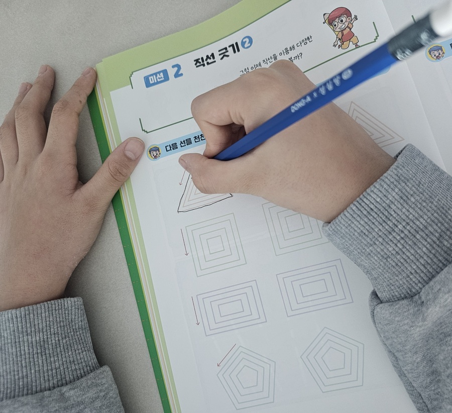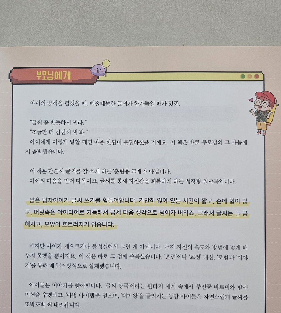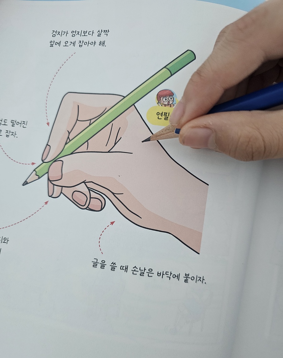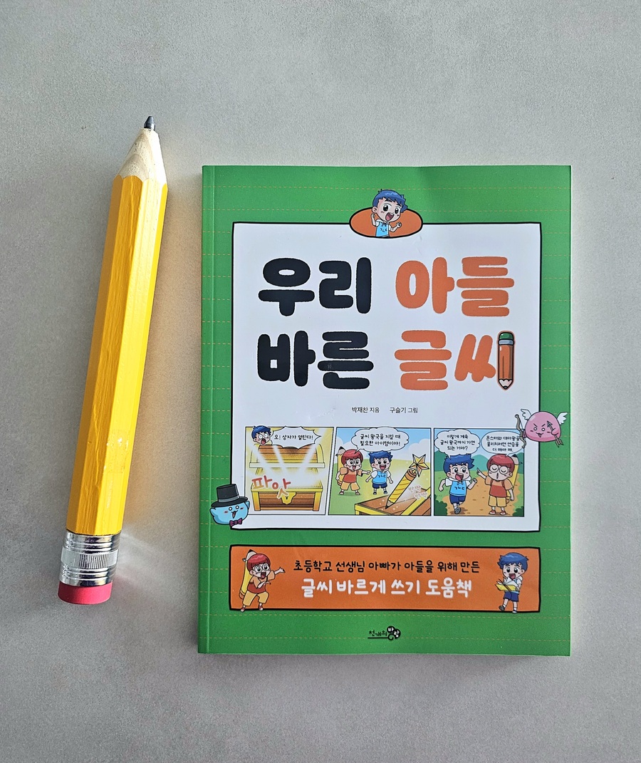 초등학교 4학년 아들의 글씨는 자음과 모음의 크기가 제각각이고 글자는 위아래로 오르락내리락하여 글씨 연습이 꼭 필요했습니다. 아들들의 글씨는 비슷한 걸까요 제목부터 공감이 갔던 글씨 연습 교재 『우리 아들 바른 글씨』를 만났습니다. 남자아이들은 손힘이 세서 연필이 잘 미끄러지고 빨리 쓰려고 마음이 앞서다 보니 글씨가 비뚤어지기 쉽다는 저자의 이야기에 공감합니다. 눌러쓰는 힘이 강해 종이에 자국이 많이 남고 무슨 글자를 쓴 건지 물어봐야 했습니다. 그래서 이번 겨울 방학에는 꼭 연습을 시켜야겠다고 마음먹었고 저의 마음을 알아준준 이 교재가 참 반가웠습니다. 매일 꾸준히 연습하기 위해 많은 분량을 한꺼번에 하지 않고 조금씩 천천히 진행했습니다. 빨리 쓰려는 급한 마음이 글씨를 더 흐트러뜨린다는 점을 이야기하며 속도를 늦추도록 했습니다. 지금 중요한 건 빠르게 쓰는 것이 아니라 정확하게 제대로 쓰는 것 이기 때문입니다. 글씨 연습과 함께 구성된 학습 만화는 연습 시간을 지루하지 않게 도와줍니다. 초등학교 교사이자 아들을 키우는 선생님이 만든 교재라서 인지 남자아이들의 성향과 마음을 잘 이해하고 구성했다는 느낌을 받았습니다. 바르게 앉는 자세와 연필을 잡는 방법을 그림을 통해 구체적으로 확인할 수 있어 도움이 되었습니다. 아이의 모음 쓰기를 지켜보며 연필을 쥐는 방법부터 바로잡아야 한다는 것도 알게 되었습니다. 손목을 안쪽으로 꺾어 글씨를 쓰다 보니 모음의 방향이 기울어졌던 것입니다. 글씨를 쓰는 데 있어 바른 자세의 중요성에 대해 이야기하고 자세를 잡고 꾸준히 연습하고 있습니다. 고학년이 되면 노트필기가 많아질 텐데 적어도 자기 글씨는 알아볼 수 있기를 바라는 마음입니다. 방학 동안 부담 없이 연습해 보기 좋은 책입니다. 늦지 않았습니다. 우리 아들들 방학 동안 꼭 한번 연급해 보기를 권합니다. |