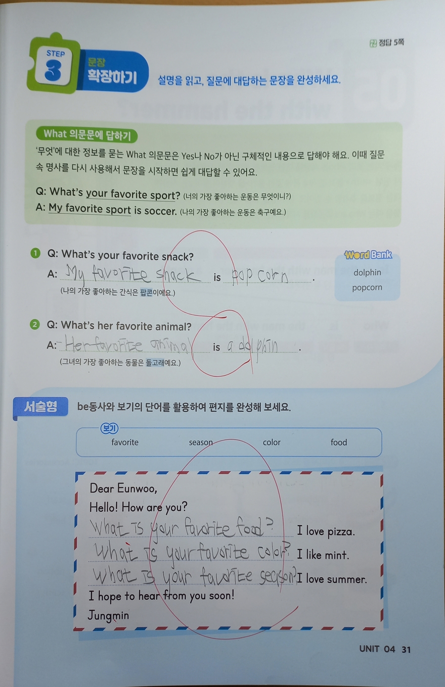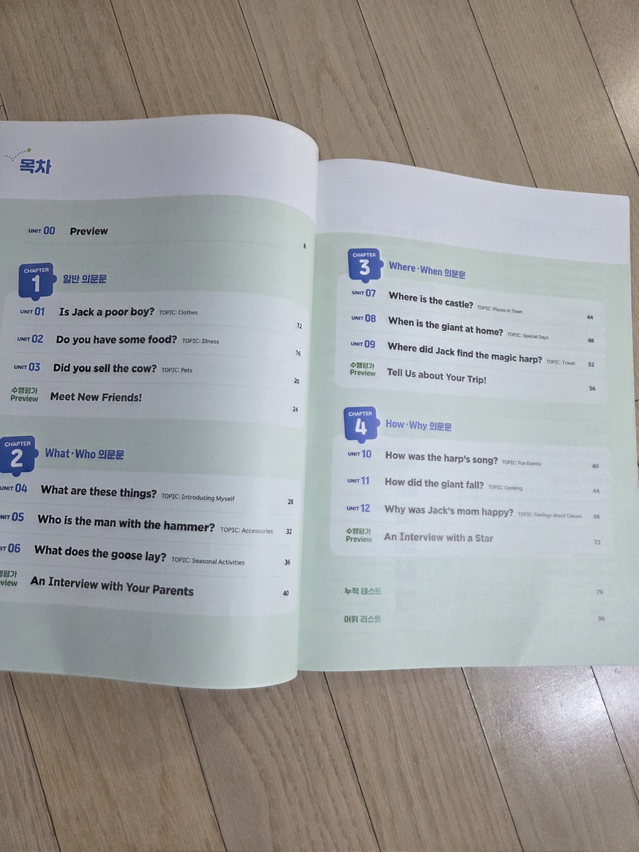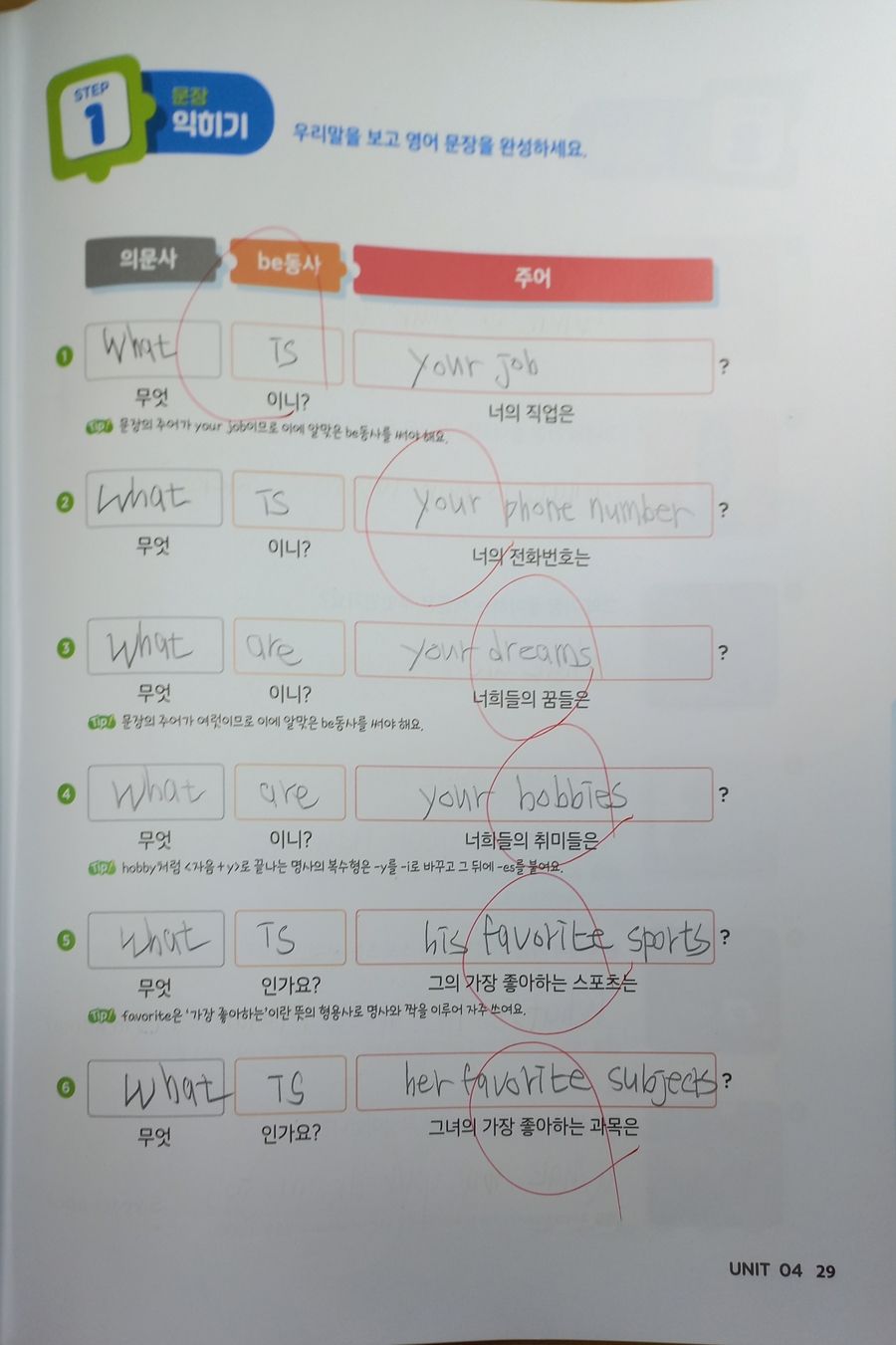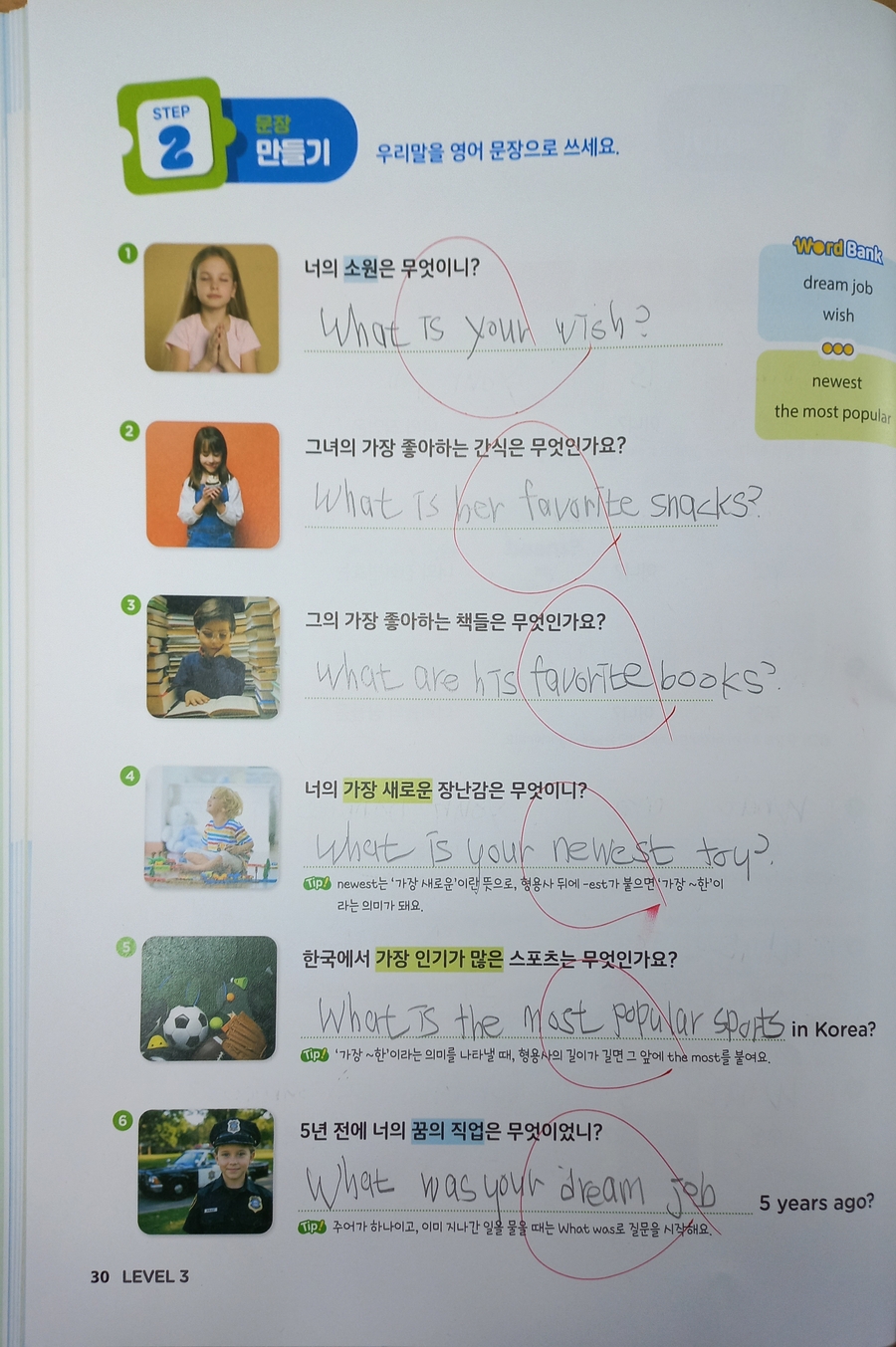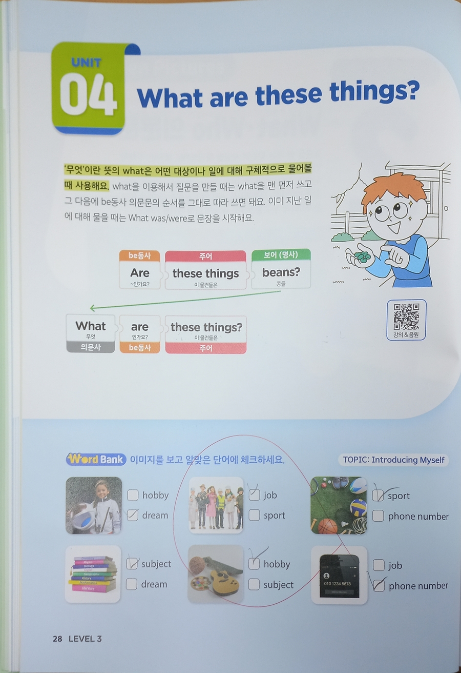 2주간 학습 진행중인데 이번주엔 What과 Who를 사용해서 구체적인 정보를 묻는 의문문을 배워봤어요. 첫주 학습땐 be동사와 do/does/did 사용을 많이 헷갈려 했는데 첫주에 이어 이번주도 명사를 바꿔가며 반복적인 유사문을 작성해 보니 이해가 되고 조금 익숙해 진 듯해요. 쉬운 문장을 시작으로 단계적으로 학습이 진행되다보니 효과가 좋은 것 같아요. 더불어 강의와 음원까지 제공이 되어 학습시간이 풍성해서 좋았어요. 이번주엔 시제며 주어동사 수일치며 실수할 수 있는 부분이 있지만 대부분 잘 해 냈는데요. 당연하게 보이는 with의 위치로 조금 헤맸어요. 제가 몇번 설명을 해줬는데 잘 이해 했는지는 모르겠네요. 첫번에 완벽할 순 없겠죠. 반복하다보면 익숙해 지리라 믿고 꾸준히 학습해 볼게요. |