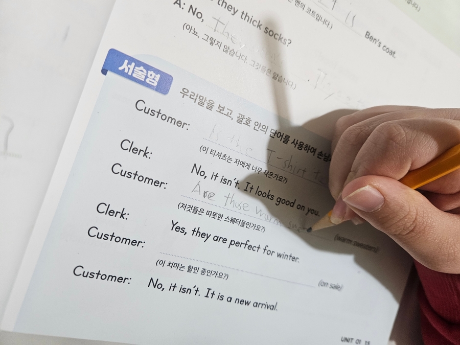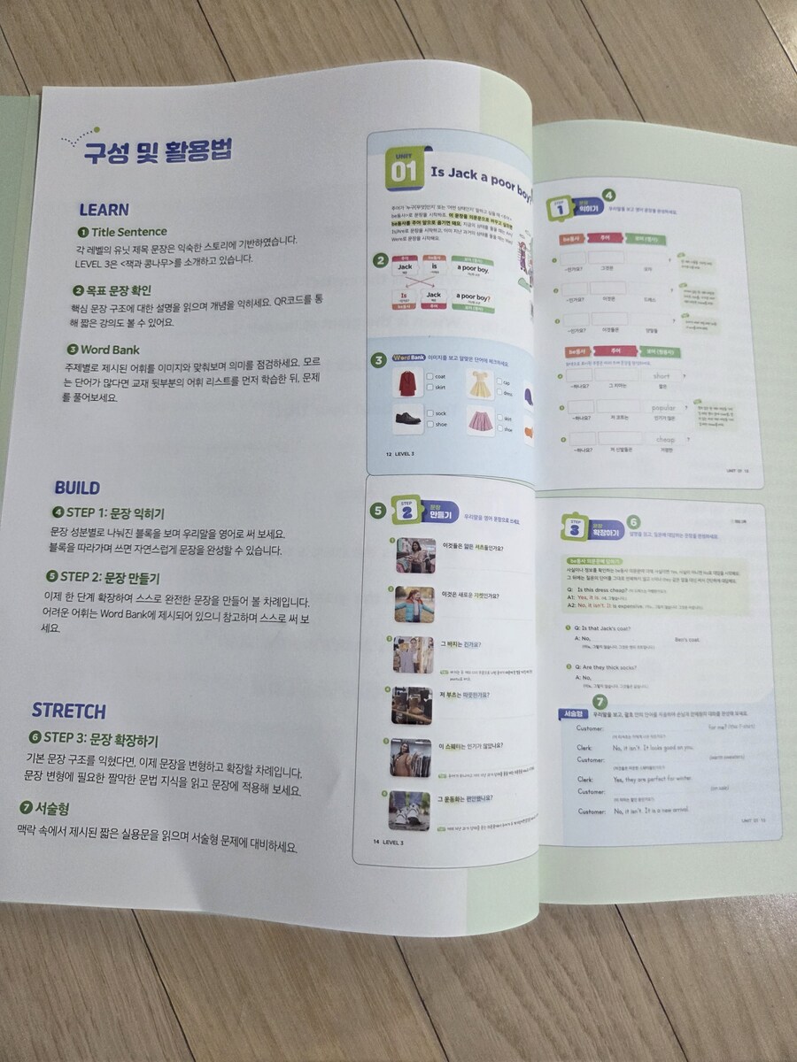 이번에 진행한 단원은 What으로 시작하는 의문문이었는데, 질문 문장을 처음 접하는 아이에게 부담 없이 다가갈 수 있도록 구성된 점이 특히 좋았습니다. 이 책은 문법 설명을 먼저 내세우기보다, 질문이 어떤 상황에서 쓰이는지부터 이해하도록 안내해 줍니다. What is, What are 같은 기본 구조를 반복적으로 연습하면서도, 직업이나 꿈, 취미처럼 아이에게 익숙한 주제를 사용해 문장을 만들게 하니 아이가 의미를 생각하며 쓰는 모습이 보였습니다. 문장 읽기에서는 질문의 형태를 자연스럽게 익히고, 문장 만들기 단계에서는 우리말을 영어 질문으로 직접 바꿔 써 보게 되어 흐름이 끊기지 않습니다. 단수와 복수에 따라 be동사가 달라지는 부분도 여러 예시로 반복되다 보니, 실수해도 스스로 다시 확인해 볼 수 있었습니다. 서술형 확장에서는 질문에 대한 대답까지 이어지면서, 영어 문장이 단순한 연습문제가 아니라 실제 대화처럼 느껴지도록 구성되어 있습니다.