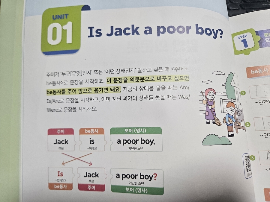 큰 아이와 중등 1학년을 겪어보니 중학교 영어 수행평가가 쉽지 않다는 걸 느낄 수 있겠더라고요. 라이팅의 중요성을 알기에 이번에 NE능률 신간 프로젝트 학습단에 참여하게 되었습니다. 문장 쓰기로 서술형 자신감을 키울 수 있는 달곰한 Sentence Writing 입니다. 상대방에게 질문을 하여 대답을 요구하는 문장을 의문문이라 합니다. 우리말에서 의문문은 문장 끝을 ~인가요? ~하나요 로 바꾸면 됩니다. 주어가 누구[무엇]인지 또는 어떤 상태인지를 나타낼 때 <주어+be 동사> 로 문장을 시작합니다. 책에 있는 큐알을 찍으면 강의 & 음원으로 |