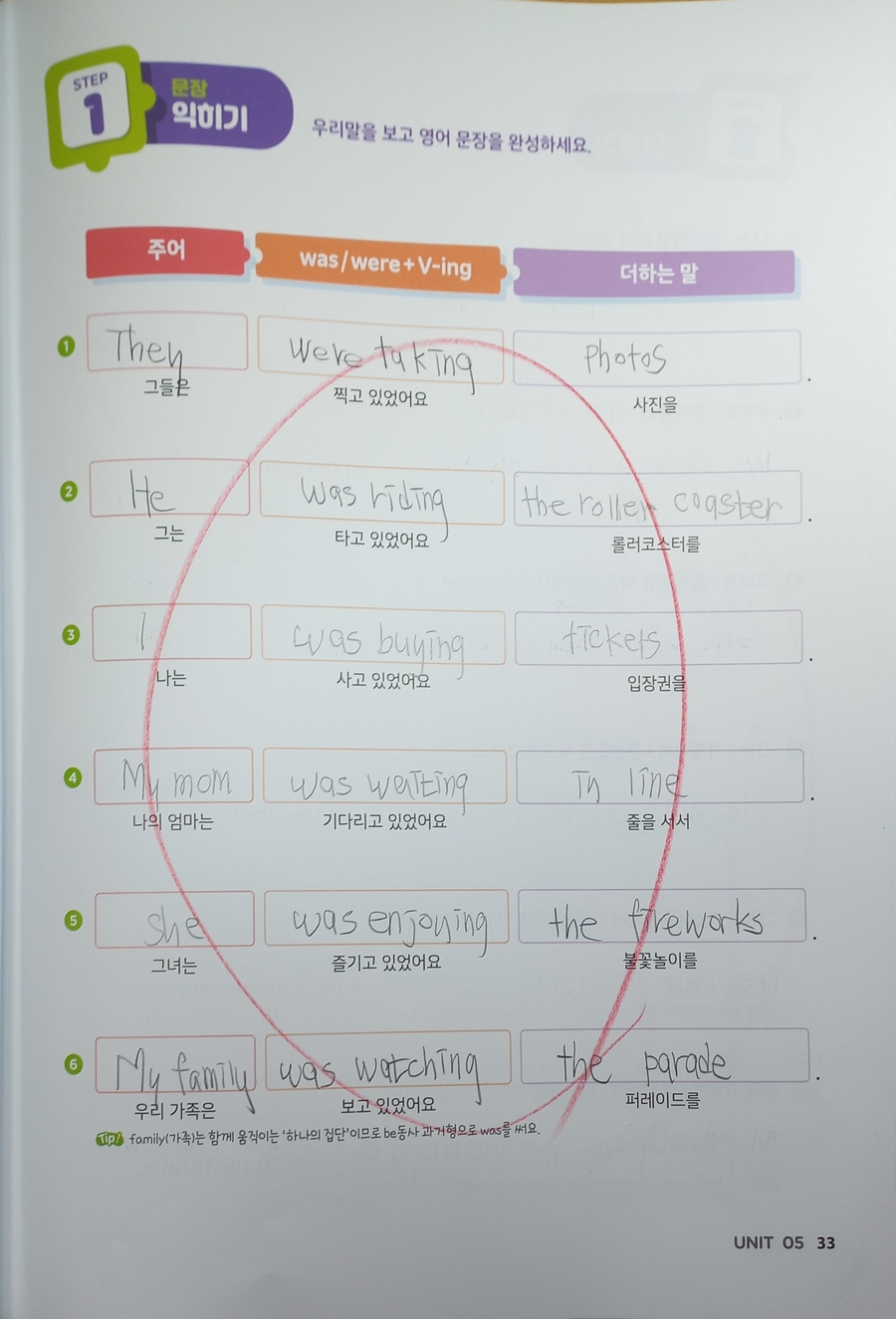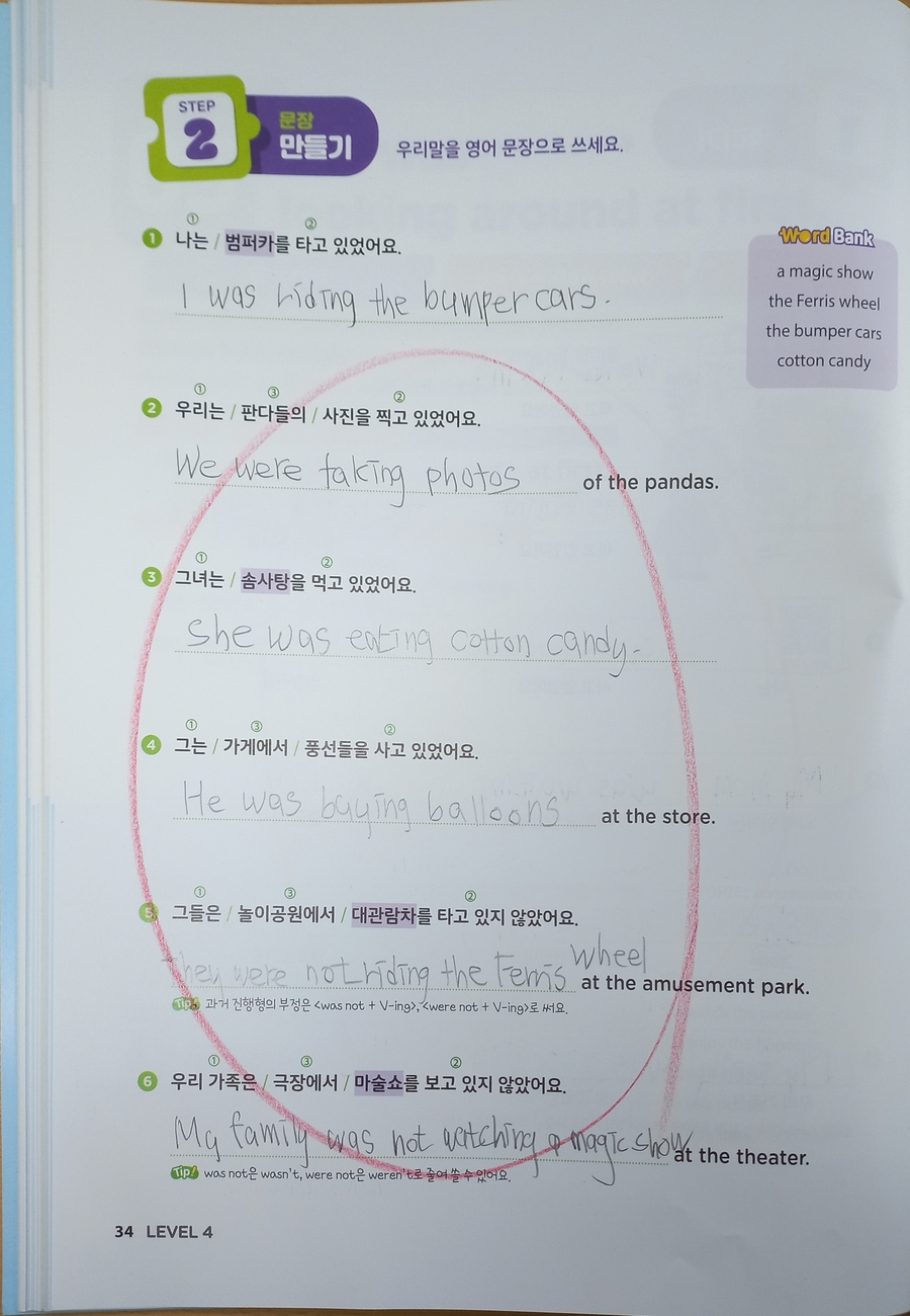was/were + ing 형태를 규칙으로 외우기보다, “그때 하고 있던 행동”이라는 장면 속에서 문장을 써 보게 하니 자연스럽게 의미와 형태가 함께 연결됩니다. 주어, 동사, 이어지는 말이 단계적으로 제시되어 있어 문장을 하나씩 조립하듯 완성해 나가게 되고, 우리말을 영어로 바꾸는 과정에서도 어디를 먼저 생각해야 하는지 흐름이 잡혀 있습니다. 놀이공원이나 일상 장면처럼 아이에게 익숙한 소재를 사용해 문장을 만들다 보니, 영어 문장이 생활 속 이야기처럼 느껴지는 점도 좋았습니다. 문장 읽기, 문장 만들기, 서술형 확장까지 이어지는 구성 덕분에 단순히 쓰고 끝나는 학습이 아니라, 왜 그렇게 써야 하는지를 다시 확인할 수 있습니다. 아이가 스스로 고쳐 쓰거나 설명하려는 모습을 보며 이해도가 쌓이고 있다는 느낌을 받았습니다. 영어 문장을 처음부터 길게 쓰게 하기보다는, 시제와 문장 구조를 차근차근 익히며 쓰기 자신감을 키워 주고 싶은 가정에 잘 어울리는 교재입니다. 집에서 엄마가 함께 봐주며 공부하기에도 설명이 친절하고 흐름이 안정적이라, 꾸준히 이어가기 좋은 영어 쓰기 책이라고 생각합니다. |