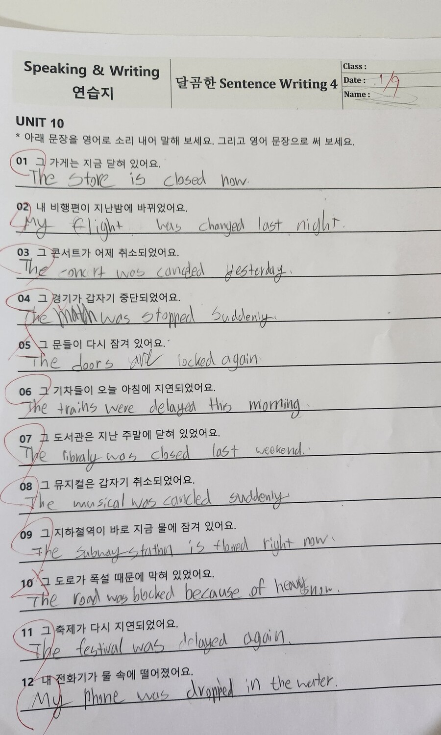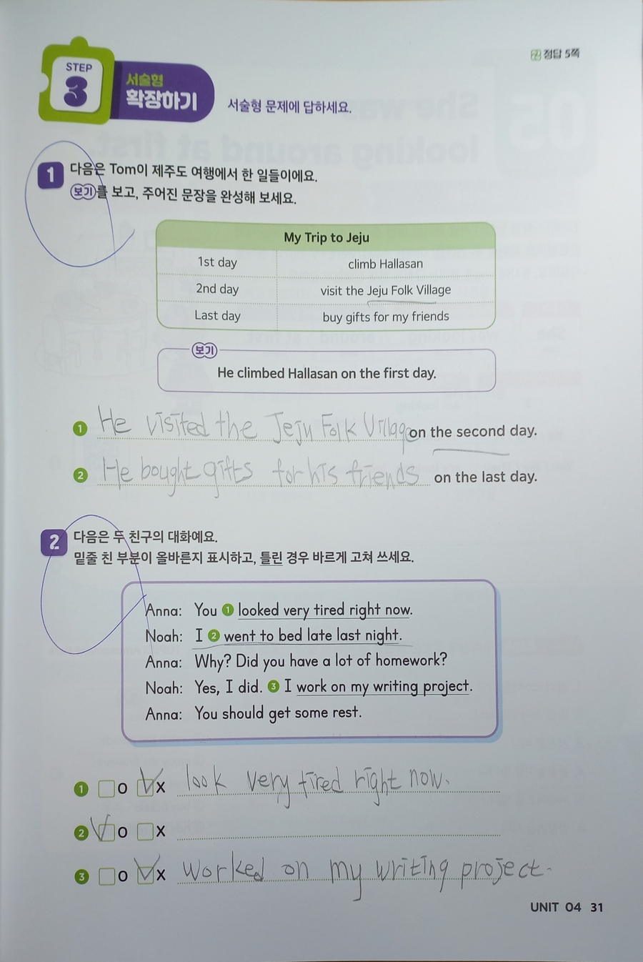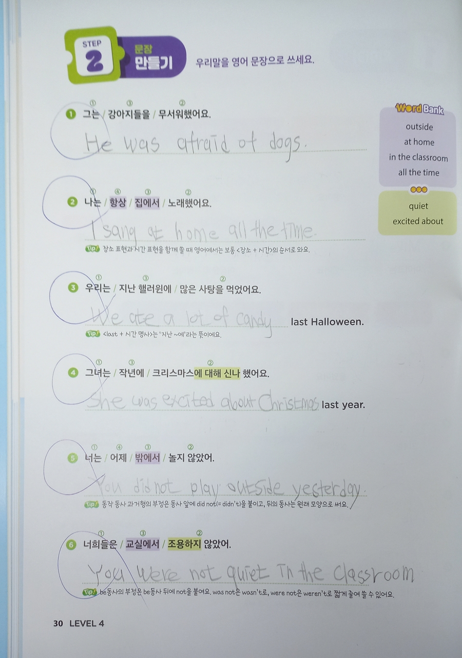 아이와 함께 달곰한 Sentence Writing Level 4를 4주 과정으로 공부하고 있는데, 지금은 2주차를 지나며 교재의 장점이 더 분명하게 느껴집니다. 이 책은 영어 문장을 외워서 쓰게 하는 교재라기보다, 문장이 만들어지는 과정을 자연스럽게 이해하도록 이끌어 주는 점이 좋았습니다. 주어–동사–더하는 말 구조가 보기 쉽게 정리되어 있어서, 아이가 문장을 통째로 암기하기보다는 각 요소의 역할을 생각하며 쓰게 됩니다. 과거형 단원에서는 was/were와 일반동사 과거형, 불규칙 동사를 함께 다루지만 부담스럽지 않게 구성되어 있습니다. 문장 읽기로 충분히 익힌 뒤 우리말을 보고 직접 문장을 써 보고, 마지막에는 서술형 문제와 대화문으로 확장되면서 문장 쓰기가 자연스럽게 이어집니다. 부정문이나 시간 표현처럼 아이들이 헷갈리기 쉬운 부분도 간단한 팁으로 짚어 주어, 틀린 문장을 스스로 다시 생각해 보고 고칠 수 있는 흐름입니다. 아이가 왜 이렇게 써야 하는지를 말로 설명하려는 모습을 보며 이해도가 높아지고 있다는 느낌을 받았습니다. 영어 문장을 처음부터 길게 쓰게 하기보다는, 시제와 문장 구조를 차근차근 익히고 싶은 경우에 잘 맞는 교재입니다. 집에서 엄마가 함께 보며 공부하기에도 구성과 진행이 안정적이라 꾸준히 이어가기 좋은 영어 쓰기 책이라고 생각합니다. |