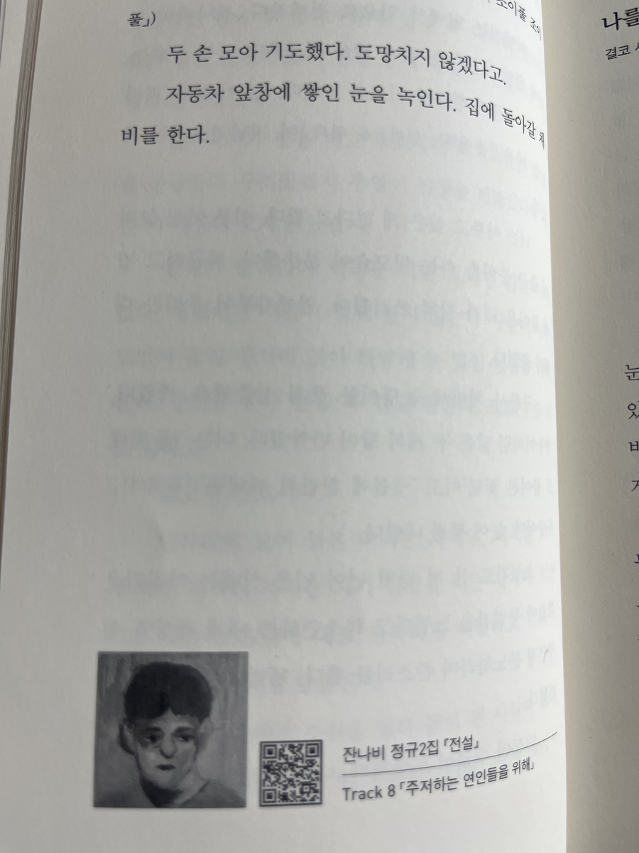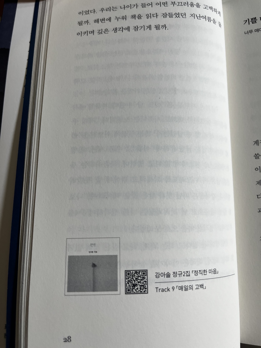 사실 이 책을 읽기 전 '최지인'이라는 작가에 대해서는 잘 몰랐습니다. 저자 소개를 읽으며 이 작가가 나랑 동년배(90년생)임을, 그리고 꽤 여러 편의 시집을 낸 시인이라는 것을 알게 되었지만 유독 '시'라는 장르에는 문외한인 터라, 읽어본 시집이 하나도 없더라고요. 이 책 『일렁이는 음의 밤』 역시 시집이었다면 선뜻 고르지 못했을 겁니다. 시인 최지인의 첫 산문집으로, 음악을 매개로 자기 내면과 삶을 돌아보는 기록이 담겨 있어요. 총 35개의 곡과 에피소드가 수록돼 있으며, 각 장마다 음악에 얽힌 사연을 중심으로 이야기가 펼쳐집니다. 양희은, 강아솔, 잔나비, 권나무 등 다양한 아티스트들의 곡이 등장하며, (제가 아는 아티스트 위주로 적었습니다) 이들과 작가의 삶이 교차하고 있어요. 꼭지글마다 끝에 QR 코드가 삽입돼 있어, 해당 음악을 바로 들을 수 있도록 구성되어 있는 점이 특징입니다.