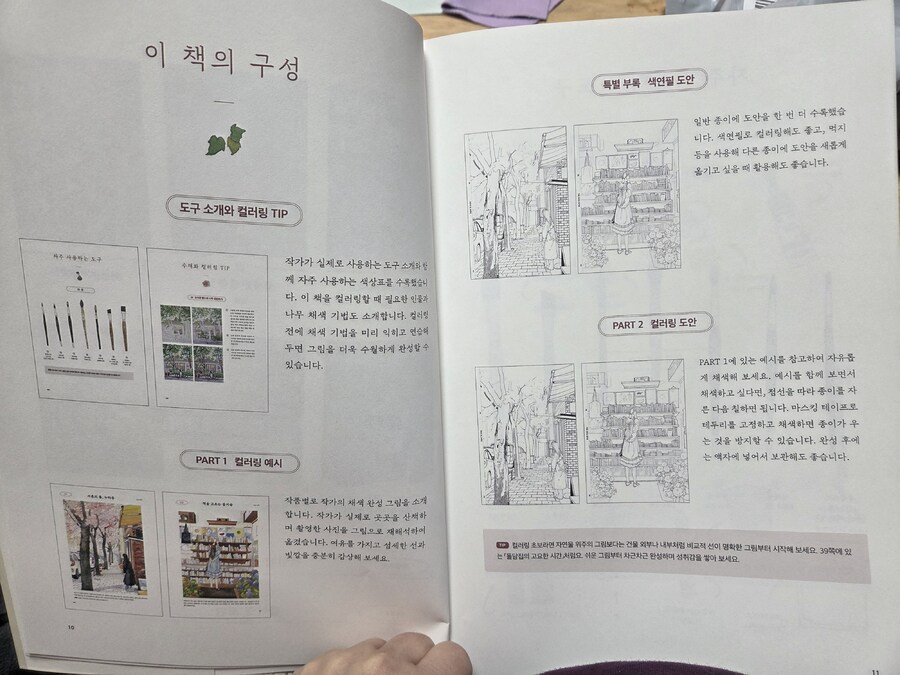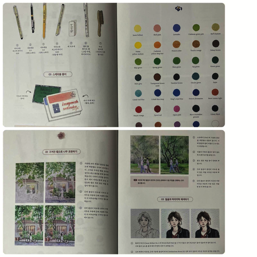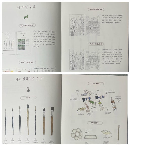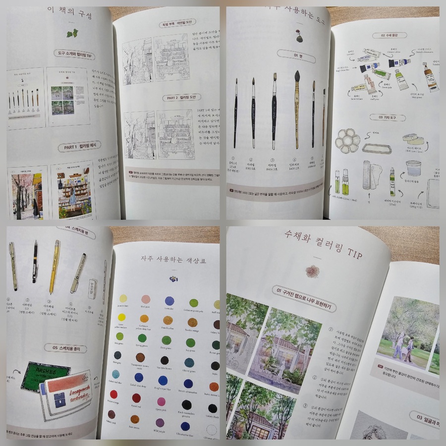 인물과 함께있는 어반 스케치와 컬러링북은 처음인지라 서평을 신청하게 되었고 무엇보다 최고급 수채화 용지를 사용한 컬러링북은 늘 구매하고 싶은 마음이 생기는 것 같습니다. 김진희 작가님을 이 컬북으로 알게 되었는데 도시 속에 스쳐 지나가는 빛과 공기까지 시선에 담아 일상에 머무는 아름다움을 포착하셨다는 말이 너무 힐링되는 문구였어요. 보통 컬러링북 하면서 작가님은 어떤 물감, 어떤 도구를 쓰는지 궁금한 데 알려주고 계시고, 색연필로 할 수 있는 도안과 수채로 할 수 있는 도안으로 나뉘어져 있습니다. 그림도안은 너무 마음에 드는데 수채로는 자신 없지만 매끄럽고 보슬보슬한 색연필로 칠하고 싶은 분들을 위해서도 좋고, 수채를 하다가 색연필로도 같은 그림을 칠해볼 수 있으니 재미있겠고, 많은 분들을 염두해보고 하신 구성 같습니다.