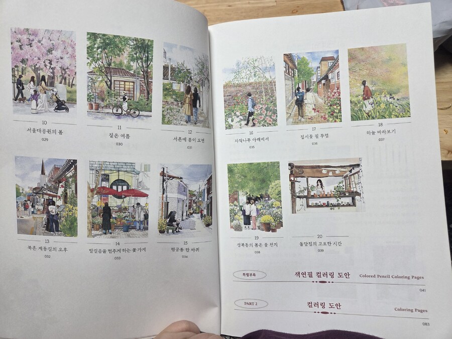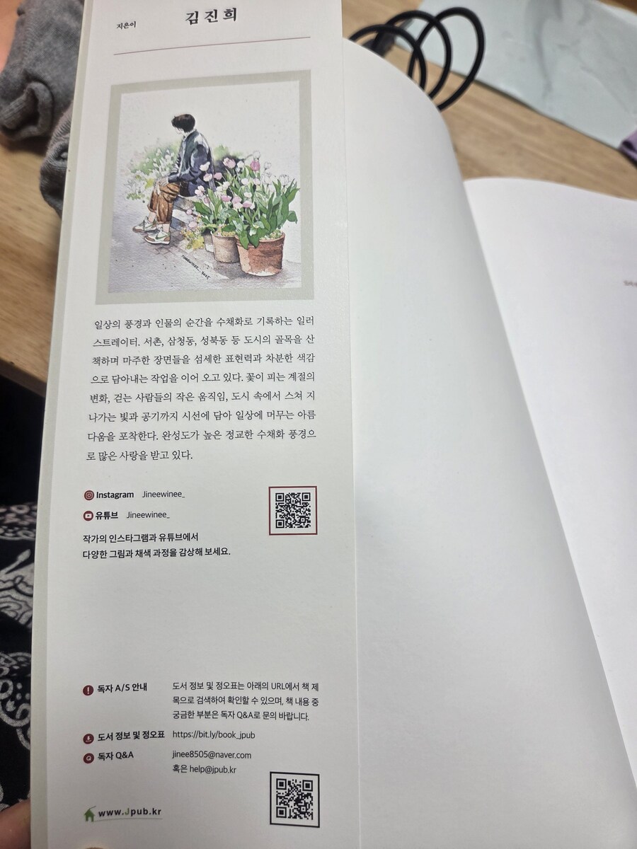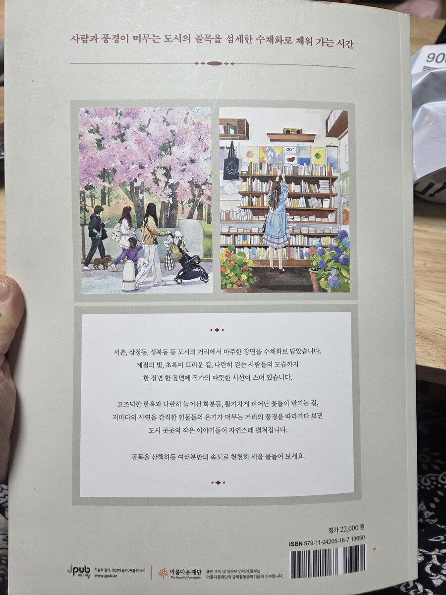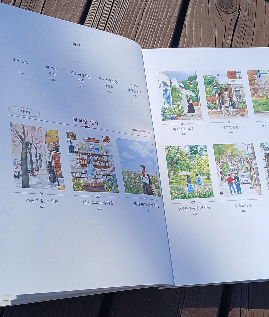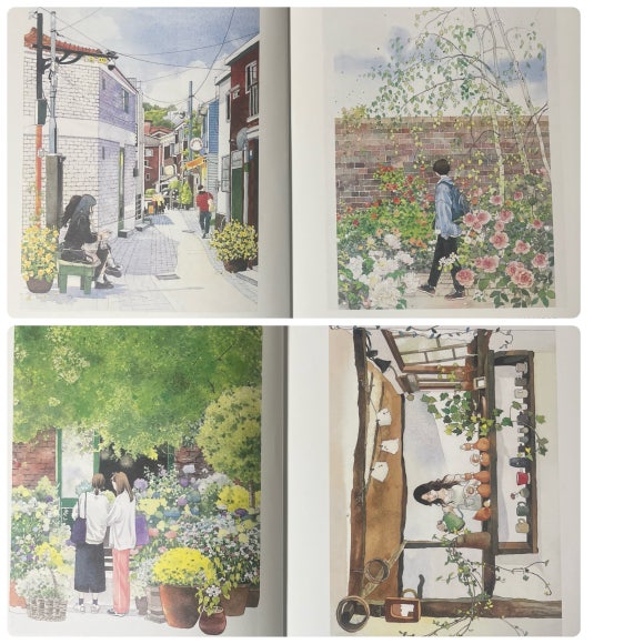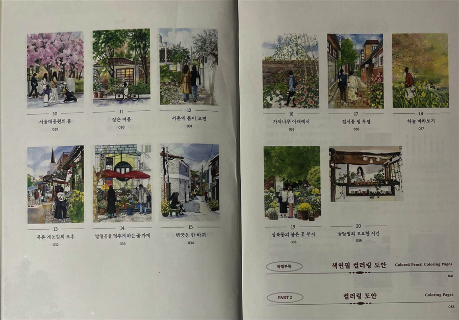 (❤️이 서평은 힐링컬러링카페와 제이펍의 서평단에 선정되어 직접체험하고 작성한 솔직후기입니다.❤️) 안녕하세요~~🩷 김진희 작가님의 첫 컬러링북 '도시 산책 수채화 컬러링북 '이 출간되었답니다!👏👏👏 수채화 일러스트레이터인 작가님의 컬러링북이니 당연히 수채화 컬러링북이겠죠~ 수채컬북종이는 어디?제이펍이죠~!!! 질좋은 종이와 작가님의 예쁜그림이 여러분들을 기다리고 있으니 한껏 기대하셔도 좋아요! 그럼 지금부터 책소개와 저의 체험후기를 들려드릴게요. Go go~ 이책은 A4용지와 같은 사이즈로 되어있어요. 종이도 도톰한 수채용지에 180도 쫙쫙 펼쳐지는 특수제본으로 되어있어요. 그리고 책표지를 넘기면 작가님소개와 밑에 QR코드가 있어요. 작가님의 유튜브 QR코드인데요. 들어가보면 작가님의 채색 영상들이 있으니 감상&참고하셔도 좋을듯합니다. 책장을 넘기면 차례가 나와요. 그리고 이책의 구성, 작가님 사용하시는 도구, 색상표, 작가님의 Tip이 나와요. 작가님의 Tip은 채색할때 정말 유용하게 쓰일것같습니다. 그리고 컬러링 예시(작가님채색본)가 나와요. 몇개만 보여드릴게요. 다음은 제이펍 수채컬북의 선물같은 존재죠! 특별부록인 색연필 컬러링용 도안이예요. 20개의 전 도안이 다 있답니다. 그다음은 채색할 수채도안들이 나와요. 지금부터 도안구경 가시죠~ 그림이 너무 예쁘죠~ 코스모스향기를 따라 그림그릴곳을 모색하는 소녀! 북촌 계동길의 커플옷을 맞춰입고 걸어가는 커플. 창덕궁 후원을 거니는 두 친구! 서촌 골목에 아이와 엄마가 함께 나들이를 나온모습! 너무나 정겹고 어릴적이 떠오르네요. 라일락이 피는시기에 서촌 골목길. 북촌계동길의 어느 가게앞에서 메뉴를 고민하는 두사람! 세번째도안은 책의 표지도안이죠~ 안양평촌의 작은팝업 꽃가게앞에서 꽃구경하는 사람들. 진짜 주변을 둘러보면 볼수있는 풍경들의 그림들이 너무나 따스합니다. 여기까지 몇몇 도안을 보여드렸어요. 그럼 지금부터는 저의 채색 체험후기를 들려드릴게요~ 저의 완성작이구요. 채색 진행샷이예요. 저는 대부분 신한SWC, 화이트나이츠 물감을 사용하였어요. 작가님 예시작보면서 열심히 채색했답니다. 수채 채색할때 대부분 마스킹테이프로 테두리를 고정하고 진행하죠. 그 배려로 사이드가 조금씩 띄워져있어요.👍 도안은 책 그대로 채색하셔도되고 한장씩 뜯어 채색하셔도 되고요. 저는 종이가 물을 얼마나 버텨주고 얼마나 우는지 제대로 보고싶어서 테두리에 마스킹테이프를 붙이지 않고 그냥 진행하였답니다. 물을 많이 써도 거뜬히 버텨주는 제이펍의 종이는 역시나 기대를 저버리지 않았어요.👍👍👍 수채를 사랑하시는분들! 수채를 해보지않아 망설이시는 분들 모두 즐길마음만 있으시다면 당장 시도해보시는걸 추천드려요. 작가님의 예쁜그림들과 질좋은 수채종이가 기다리고 있답니다~ 긴글 읽어주셔서 너무 감사합니다~❤️ 서평 기회를 주신 힐링컬러링카페와 제이펍에 감사인사를 드립니다~❤️ |