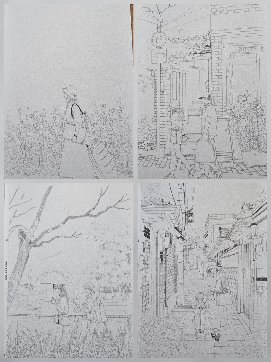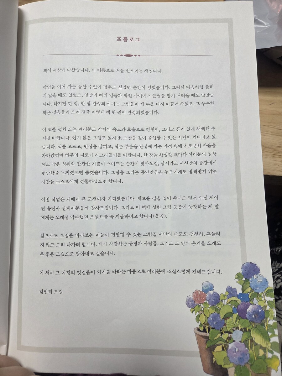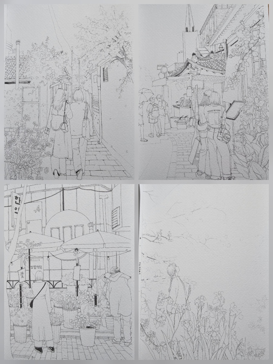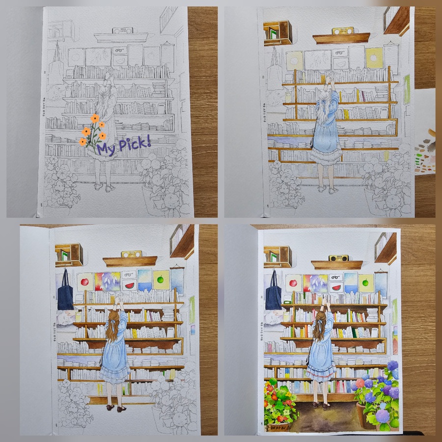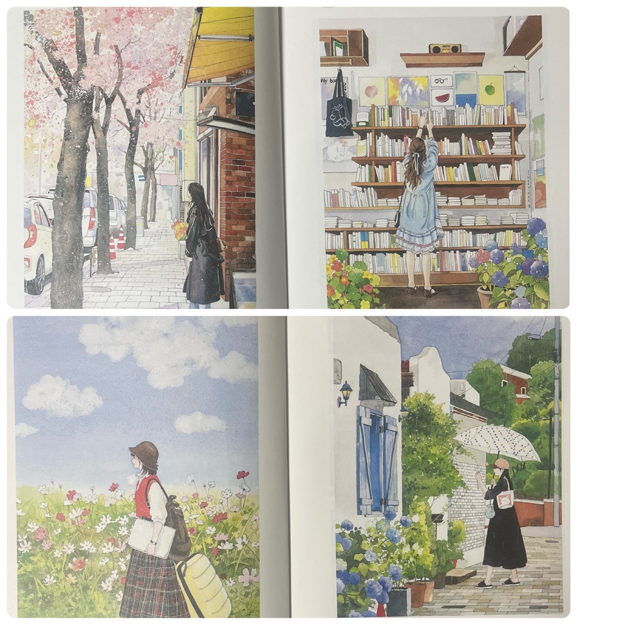(❤️이 서평은 힐링컬러링카페와 제이펍의 서평단에 선정되어 직접체험하고 작성한 솔직후기입니다.❤️) 안녕하세요~~🩷 김진희 작가님의 첫 컬러링북 '도시 산책 수채화 컬러링북 '이 출간되었답니다!👏👏👏 수채화 일러스트레이터인 작가님의 컬러링북이니 당연히 수채화 컬러링북이겠죠~ 수채컬북종이는 어디?제이펍이죠~!!! 질좋은 종이와 작가님의 예쁜그림이 여러분들을 기다리고 있으니 한껏 기대하셔도 좋아요! 그럼 지금부터 책소개와 저의 체험후기를 들려드릴게요. Go go~ 이책은 A4용지와 같은 사이즈로 되어있어요. 종이도 도톰한 수채용지에 180도 쫙쫙 펼쳐지는 특수제본으로 되어있어요. 그리고 책표지를 넘기면 작가님소개와 밑에 QR코드가 있어요. 작가님의 유튜브 QR코드인데요. 들어가보면 작가님의 채색 영상들이 있으니 감상&참고하셔도 좋을듯합니다. 책장을 넘기면 차례가 나와요. 그리고 이책의 구성, 작가님 사용하시는 도구, 색상표, 작가님의 Tip이 나와요. 작가님의 Tip은 채색할때 정말 유용하게 쓰일것같습니다. 그리고 컬러링 예시(작가님채색본)가 나와요. 몇개만 보여드릴게요. 다음은 제이펍 수채컬북의 선물같은 존재죠! 특별부록인 색연필 컬러링용 도안이예요. 20개의 전 도안이 다 있답니다. 그다음은 채색할 수채도안들이 나와요. 지금부터 도안구경 가시죠~ 그림이 너무 예쁘죠~ 코스모스향기를 따라 그림그릴곳을 모색하는 소녀! 북촌 계동길의 커플옷을 맞춰입고 걸어가는 커플. 창덕궁 후원을 거니는 두 친구! 서촌 골목에 아이와 엄마가 함께 나들이를 나온모습! 너무나 정겹고 어릴적이 떠오르네요. 라일락이 피는시기에 서촌 골목길. 북촌계동길의 어느 가게앞에서 메뉴를 고민하는 두사람! 세번째도안은 책의 표지도안이죠~ 안양평촌의 작은팝업 꽃가게앞에서 꽃구경하는 사람들. 진짜 주변을 둘러보면 볼수있는 풍경들의 그림들이 너무나 따스합니다. 여기까지 몇몇 도안을 보여드렸어요. 그럼 지금부터는 저의 채색 체험후기를 들려드릴게요~ 저의 완성작이구요. 채색 진행샷이예요. 저는 대부분 신한SWC, 화이트나이츠 물감을 사용하였어요. 작가님 예시작보면서 열심히 채색했답니다. 수채 채색할때 대부분 마스킹테이프로 테두리를 고정하고 진행하죠. 그 배려로 사이드가 조금씩 띄워져있어요.👍 도안은 책 그대로 채색하셔도되고 한장씩 뜯어 채색하셔도 되고요. 저는 종이가 물을 얼마나 버텨주고 얼마나 우는지 제대로 보고싶어서 테두리에 마스킹테이프를 붙이지 않고 그냥 진행하였답니다. 물을 많이 써도 거뜬히 버텨주는 제이펍의 종이는 역시나 기대를 저버리지 않았어요.👍👍👍 수채를 사랑하시는분들! 수채를 해보지않아 망설이시는 분들 모두 즐길마음만 있으시다면 당장 시도해보시는걸 추천드려요. 작가님의 예쁜그림들과 질좋은 수채종이가 기다리고 있답니다~ 긴글 읽어주셔서 너무 감사합니다~❤️ 서평 기회를 주신 힐링컬러링카페와 제이펍에 감사인사를 드립니다~❤️ |