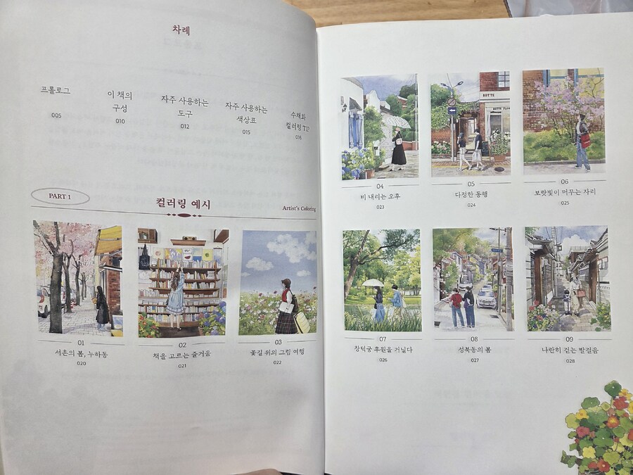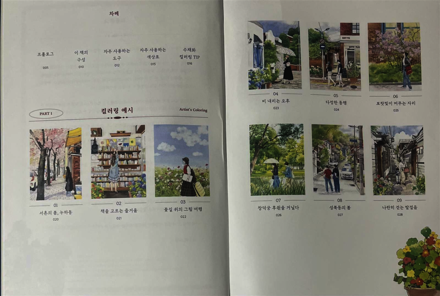 도시의 골목과 거리에서 마주치는 장면을 섬세하게 표현한 '김진희'작가님의 첫 수채 컬러링북 입니다. 책크기는 A4 210x297cm) dlau, 124페이지로 구성되어 있어요 컬러링북은 180도 펼쳐지는 PUR 제본으로 컬러링하기 좋으며, 수채용지는 절단선이 있어서 예시작을 보면서 컬러링 할 수 있게 되어있어요. 차례 part 1 - 컬러링 예시 20점이 수록되어 있고 <특별부록-색연필 컬러링 도안> part 2 - 컬러링도안(수채 용지) 색연필과 수채 자유롭게 컬러링 할 수 있어요. 서촌,삼청동,성북동,등 작가가 직접 걷고 관찰하면서 담아낸 도시의 풍경속에서 인물과 공간이 자유스럽럽게 어우려져 있습니다. -누하동 서촌의 봄, 책을 고르는 즐거움, 꽃길 위의 그림 여행. 비내리는 여행, 다정한 동행, 보랏빛이 머무는 자리, 창덕궁 후원을 거닐다. 성북동의 봄, 나란히 걷는 발걸음, 나란히 걷는 살람들의 뒷모습, 꽃이 피는 골목길, 해살이 스치는 거리의 순간들 작가님 특유의 차분한 선과 색감이 펼쳐져 있네요. -서울대 공원의 봄, 짙은 여름, 서촌에 봄이 오면, 북촌 계동길의 오후, 발걸음을 멈추게 하는 꽃가게, 행궁동 한 바퀴, 자작나무 아래에서, 접시꽃 필 무렵, 하늘 바라보기, 성북동의 봄은 꽃 천지, 돌담집의 고요한 시간. 이 책의 구성 : 도구 소개와 컬러링TIP - 작가가 실제 사용하는 도구소개와 컬러링 예시작과 색연필 도안 수채 컬러링도안,자주사용하는 붓 종류, 수채물감, 기다도구 팔레트, 소형 스프레이, 랩, 등 스케치용 팬, 스케치용 종이, 자주 사용하는 색상표, <수채화 컬러링 TIP> 구겨진 랩으로 나무 표현하기, 스프레이로 나무 표현하기, 얼굴과 머리카락 채색하기가 자세히 설명되어 있네요. 컬러링 예시작으로 서촌의 봄-길고 긴 겨울이 끝나고, 법꽃이 진 어느날 서촌골목길외 행방촌의 작고 낡은 책방에서 고민하면서 손을 뻗던 딸의 뜃모습 예시자과 수채화와 색연필로 두 번 즐기는 컬러링 도안이 있습니다. 작가님이 <<TIP>> 컬러링 초보라면 자연을 위주 보다는 건물 외부나 내부처럼 비교적 선이 선명한 그림 부터 하면 차근차근 완성하면 성취감 더 있다고 하셔서초보인 저는 <돌담집의 고요한 시간> 부여 현암리 돌담집을 고쳐 만든 카페 찻잔과 예쁜 컬러링분들이 있는 평화로운 오후을 ... 컬러링을 체험 해 봅니다. 물조절이 어렵네요 그래도 완성하고 보니 만족합니다. 작가님의 자세한 도구와 여려가지 도구를 써서 채색하는 방법을 설명하여 주셔서 초보도 쉽게 따라 할 수 있어 초보자도 수채 컬러링 할 수 있을 것 같습니다. 사진속 그림 처럼 도안 들이 일상생활에서 볼 수 있어 즐겁게 체험 할 수 있어 좋았습니다. 좋은 경험을 할 수 있게 기회를 주신 제이펍, 힐링 컬러링 감사드립니다. |