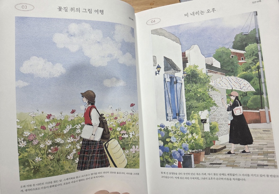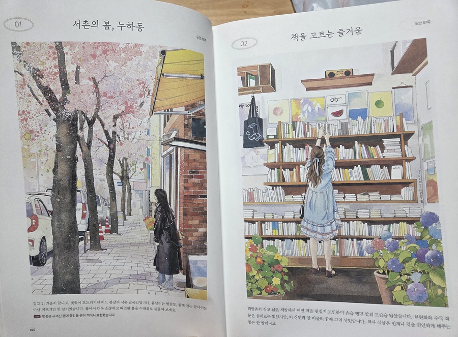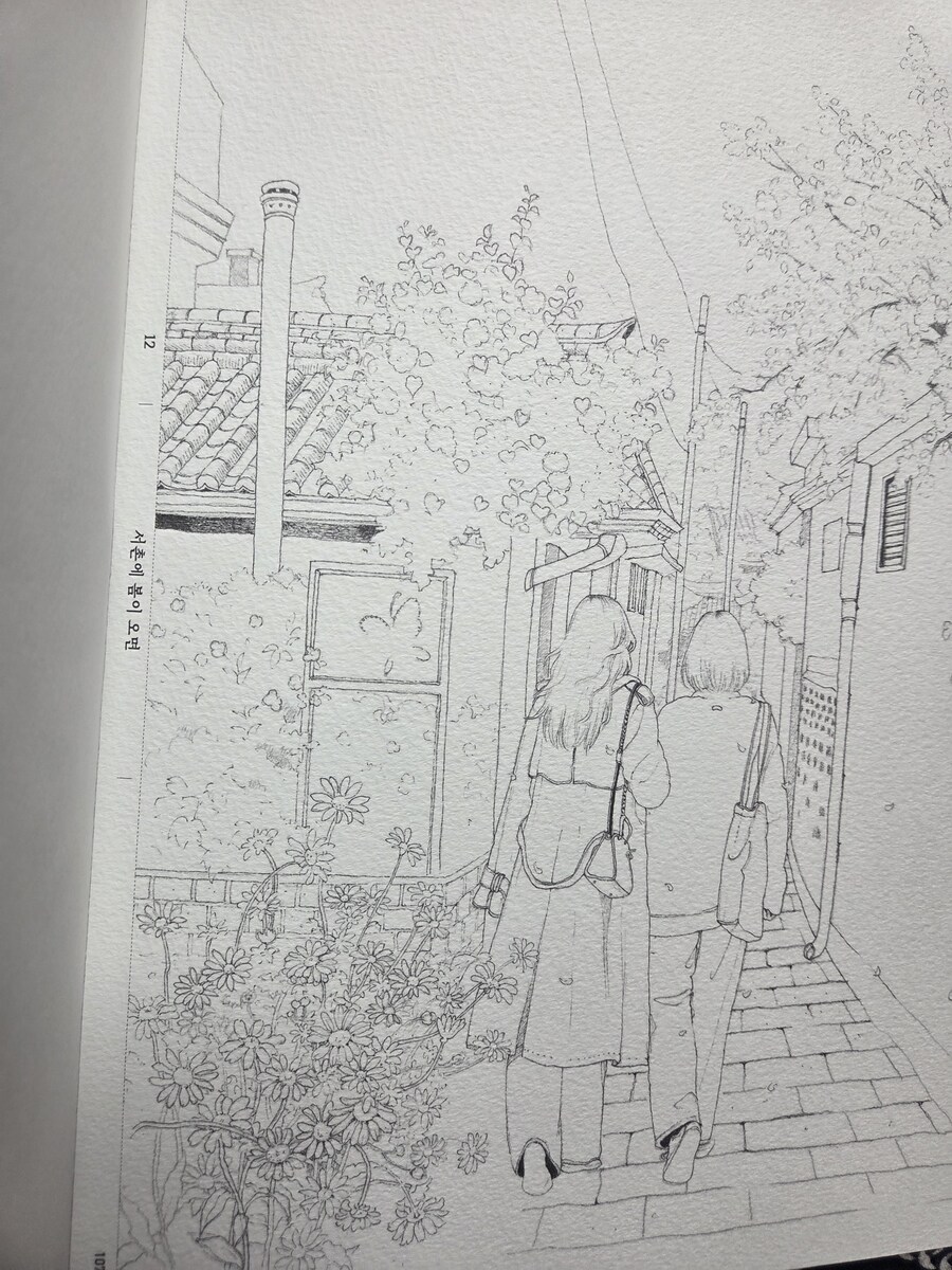 < 이 도서는 출판사로부터 제공받아 작성한 후기입니다.> 힐링이 필요할 때 그림을 내가 온전히 다 그리기는 힘들고 컬러링이 완성되었을때 기쁨을 누리고 싶어 '제이펍'에 "도시 산책 수채화 컬러링 북"을 선택하게 되었다. 오랜만에 수채화로 꾸며진 표지가 학생시절 모으던 만화 화보 일러스트 느낌이라 너무 좋아서 책을 선택하게 되었다. 수채화를 그릴려고 하니 물감이랑 마땅치 않아 내가 좋아하는 색연필이랑 마카를 준비해서 그림에 생기를 불어넣은 느낌이 리프레시한 느낌을 주었다. 매일 핸드폰, 컴퓨터는 손을 놓을수 없는데 이런 아날로그적인 재료를 사용하니 한결 나도 편안해진 느낌이 들었다. 잠깐이라도 색연필의 컬러를 선택하면서 컬러의 조합도 생각해보고 좋은 예시의 작가님의 그림도 있었지만 내 나름대로 자유롭게 표현하는 방법을 선택했다. 잠시 휴식같은 책을 통해 내 나름대로 머리를 식히는 느낌이라서 마음대로 색칠해보자 라는 생각이 들었다. 너무 오랜만이어서인지 색연필의 필감이나 컬러가 막 마음에 들지는 않았지만 완성해가면서 인물에 입체감을 주는 색을 넣어보니 색연필 느낌도 나름 나쁘지 않은 선택이었다. 이 책을 소개하면 김진희 작가님이 일러스트레이터로 작업을 하셨고 이책에서 좋은 포인트였는데 책의 펼쳐서 보면 수채화 물감을 물을 사용하다보니 종이가 얇으면 책이 훼손될 부분까지 생각해서인지 종이의 두께가 꽤 두꺼워 수채화 물감을 사용할수 있는 캔트지 느낌의 소재로 되어 있었다. 첫 구성에 도구에 대한 소개와 수채화를 다루지 않아 본 사람도 적용할수 있는 색상표와 재료에 대한 부분이 있어서 좋은 점이었다. 일러스트레이터로 활동하시는 분이어서인지 이런 포인트도 예쁘게 그림으로 설명되어 이해하기 쉽고 좋았다. 특별히 이 책의 주제는 어반스케치인데 서울에 있는 서촌, 삼청동, 성북동 등 내가 사진 찍기 좋아했던 장소들이 그림으로 나오니 더 반갑기도 하고 컬러링 할때 더 예쁜 느낌이 들었다. 소소한 풍경에 여자들이 좋아할만한 그림체로 편안하게 그려져 있어 작가님의 그림들에 대한 궁금함도 생기기기도 했다. 다른 어반스케치와 차별점이라면 다른 어반스케치는 주로 유럽, 건축, 정물화 등 여행기 같은 느낌의 분위기라면 이 책은 스토리가 있는 건 아닌데 한편의 에세이를 보는 듯한 느낌을 주었다. 일러스트 느낌이 개인적으로 나의 취향이라 통해서인지 일러스트 같은 선이나 느낌이 잘 살려져 있어서 작가가 된듯한 느낌도 대리 만족이 느껴지는 컬러링 북이었다. 도시를 둘러보다 예쁜 장소를 사진으로 남겨서 사진첩에 모아두게 되는데 그런 장소들이 일러스트로 된 컬러링 북으로 만나니 너무 예쁜 책이라는 생각이 든다. 컬러링을 좋아하는 분들이라면 너무 좋아할 만한 책이다. 특히 예쁜 일러스트를 좋아하는 매니아라면 더욱더 매력을 느끼게 될거 같다. 나의 경우도 그림 너무 좋아서 아끼는 책 중에 한권이 될거 같다. 오랜만에 그림으로 보기만 해도 편안해지고 하루 쯤은 이런 아날로그적인 재료로 사용해서 머리도 식히고 힐링 해보시길 권한다. #제이펍 #컬러링북 #어반스케치 #김진희작가 #도시산책수채화컬러링북 #서울풍경 #그림 #미술 #드로잉 #일러스트 #색연필 #풍경화 #인물화 #손그림 #스케치 #펜드로잉 #힐링북 # |