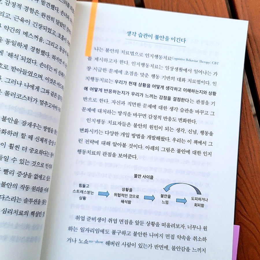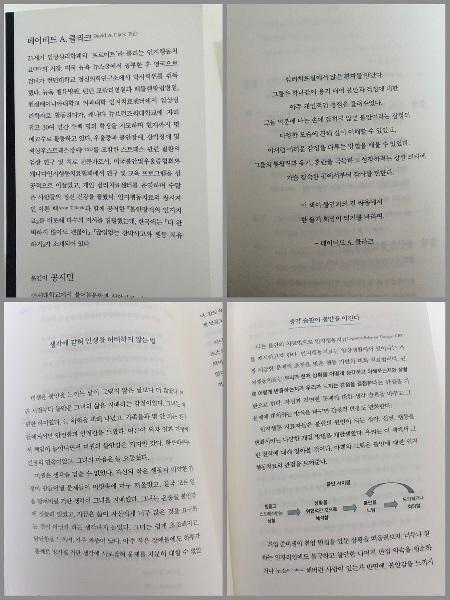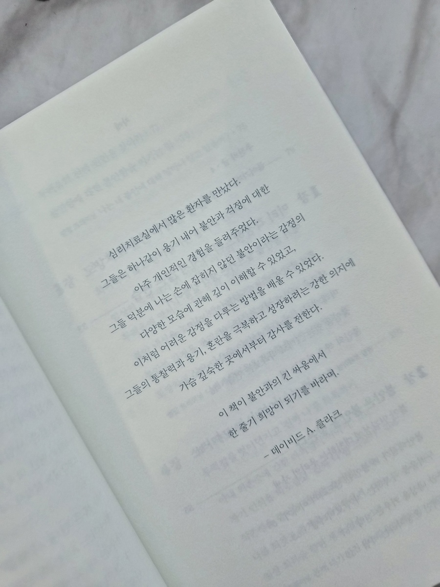 쉽게 불안해하고 예민한 성격이라는 걸 제 스스로가 너무 잘 알고 있기에, 불안에 관한 책은 늘 관심을 가지고 읽는 편이에요. 책의 저자인 데이비드 A.클라크가 21세기의 '프로이트'로 불린다고 해서 더 흥미가 생기기도 했어요. 사실 이런 종류의 책은 전문 용어가 많아서 절반은 흘려 버리면서 읽는 경우도 많았거든요. 그런데 이 책은 전문용어라고 할만한 건 거의 없어서 누가 읽어도 완전히 본인의 것으로 만들 수 있을 것 같아요. '불안'은 '불안 장애'라는 이름으로도 불리고, 어찌 보면 없애야만 하는 것으로 인식되기 쉬운데요. 저자는 불안을 없애야 하는 대상이 아닌, 함께 지내며 다스려야 할 대상으로 스스로 관리할 수 있게 안내해 줍니다. 책은 불안을 12가지의 유형으로 나누어 분석하고, 각 유형마다 실제 사례를 바탕으로 한 스토리도 함께 들려줍니다. 그중에는 '와 이거 완전 난데?' 하고 공감했던 유형도 몇 가지가 있었어요.