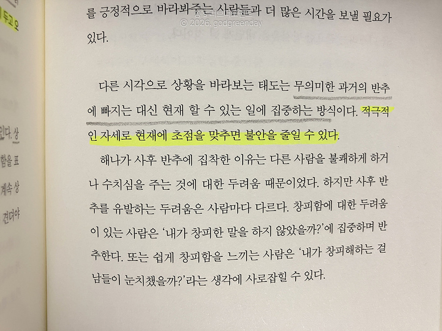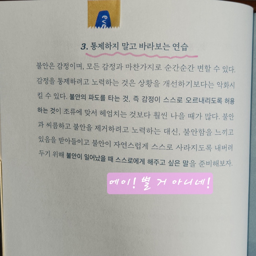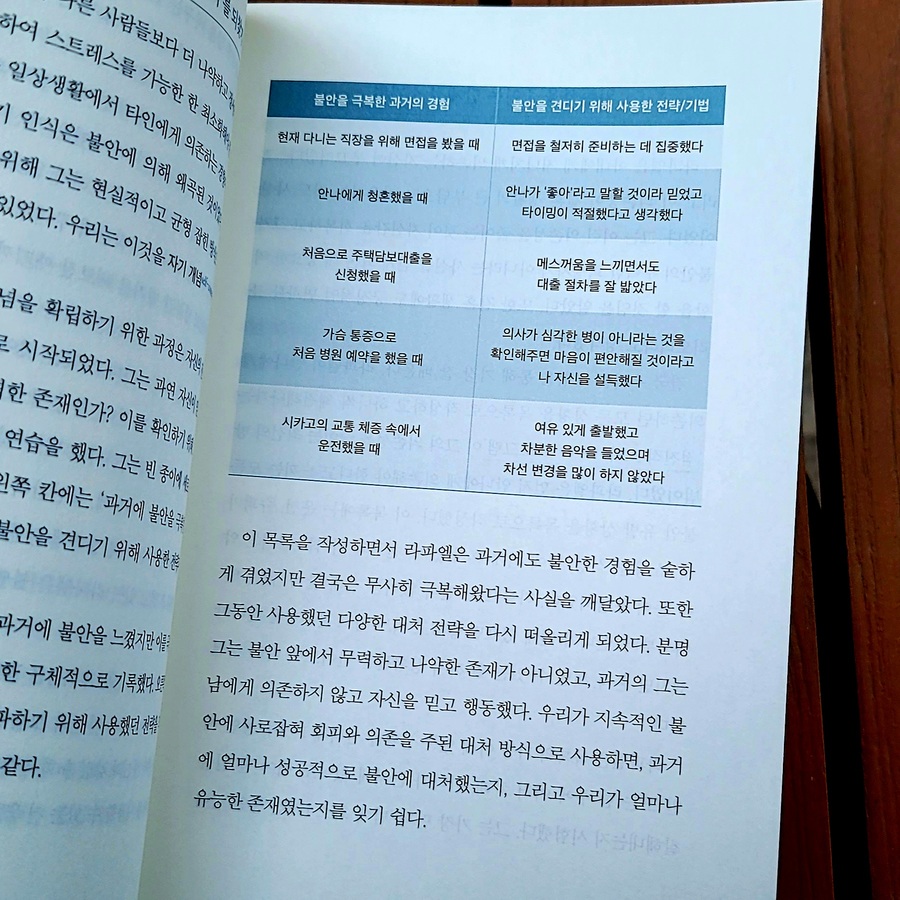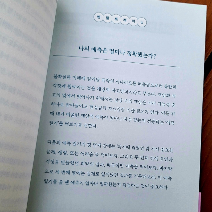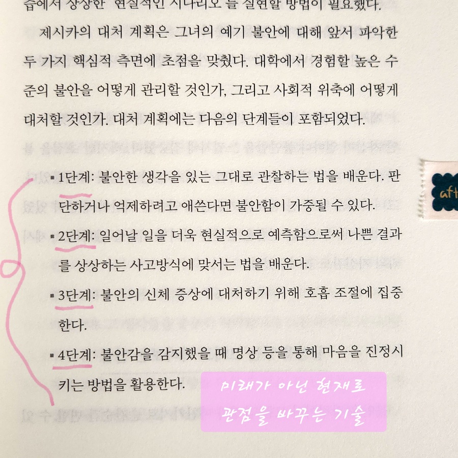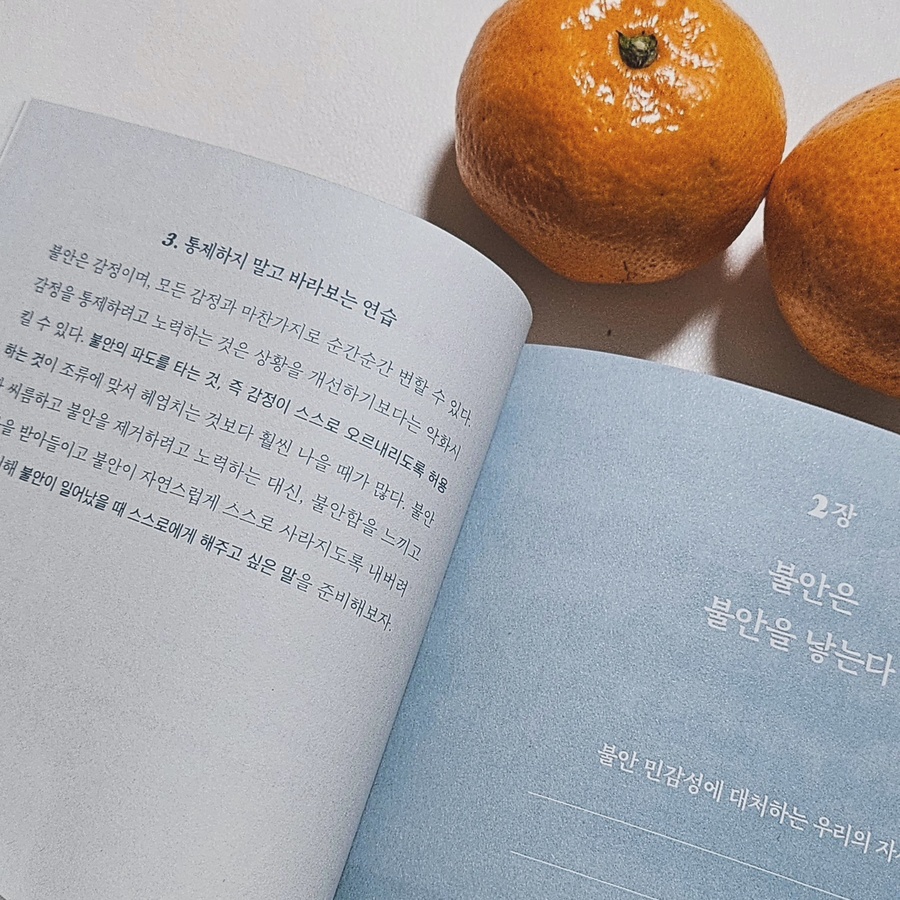 (불안 민감성) 한두 번 공황을 겪고 나니, 조금만 숨이 차거나 긴장하는 순간이 와도 '어? 나 또 공황 오는 거 아니야?' 하는 불안이 올라오더라구요. 불안해서 또 불안해진다는 말이 무엇인지 알 거 같아요. (과도한 재확인 추구) 별거 아니겠지? 나 지금 괜찮은 거지? 주변 사람들에게 계속 확인하는 것이에요. 하지만 누구에게 어떤 말을 듣더라도 불안과 걱정은 사라지지 않죠. (사후처리)내가 한 행동을 반복적으로 곱씹고 떠올리며 후회할 만한 행동을 하지 않았는가 확인하는 것. 제가 참 많이 하는 겁니다. 일명 밤마다 이불킥! 저처럼 자신에게 해당되는 유형을 찾았다면 각 챕터 끝에 있는 <멘탈 트레이닝>을 통해, 이제 어떻게 이걸 해결할지 구체적으로 연습해 볼 수 있어요. 예를 들어 '불안 민감성'유형의 경우, 매시간 불안 점수를 0에서 10까지의 척도로 기록해 보면, 실제로 높은 수준의 불안은 많지 않았다는 것, 불안이 있어도 즐거운 시간을 보낼 수 있었다는 것을 깨닫게 됩니다. 이렇게 스스로 상태를 점검하고, 개선하는 방법을 구체적으로 잘 제시한다는 점이 이 책의 가장 큰 장점이에요. 지금 불안하신 분, 그래서 스스로 그 상태를 개선해 보고자 하시는 분이 있다면 추천해 드리고 싶네요.