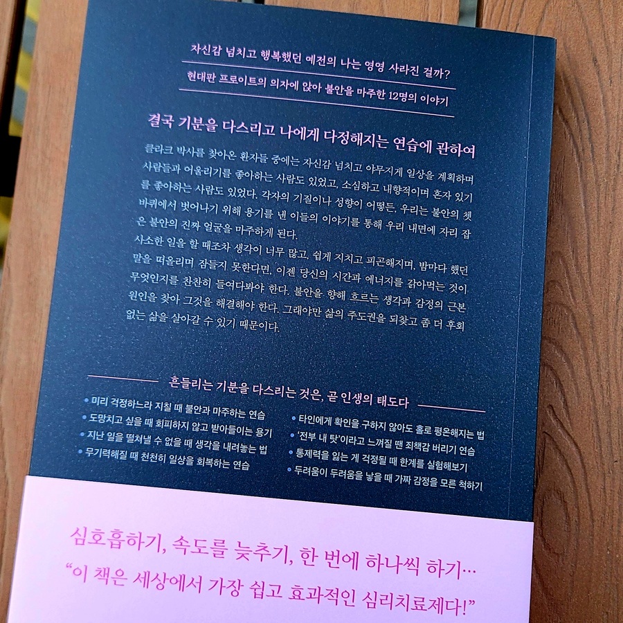 이 책은 인지행동치료의 관점에서 다양한 유형의 불안과 걱정으로 괴로워하는 사람들을 위한 책입니다. 불안을 잠재우는데 많은 시간과 에너지를 쓰는 사람들에게 이 책에서 제시하는 불안 치료의 방법이 도움이 될 것입니다. 어지럽고 복잡한 세상을 살아가는 사람들에게 흔들리는 기분과 감정을 잘 추스르는 일이 곧 올바른 인생의 태도라고 생각됩니다. 현대판 프로이트의 의자에 앉아 불안을 마주한 12명의 이야기를 통해 자신을 돌아보게 하는 좋은 책이었습니다.