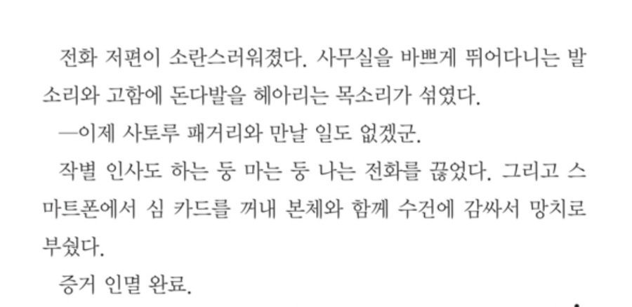 엉망진창인 퍼즐 조각이 아닌 정교하게 잘라내어 이어붙였을 때 비로소 완벽한 하나가 되는 느낌을 받았습니다. 어린 아이임 오토하가 부모님의 죽음의 진상을 밝히기 위해 지극히 소녀의 입장에서 그들이 할 법한, 아쩌면 더 나아간 작은 시선에서 시작된 이야기인만큼 내가 마치 주인공이 된 것만 같은 느낌을 받으며 읽었습니다. 묘사도 굉장히 잘 해주시고 갈을 읽는 데에 막힘없이 술술 잘 읽히더라고요. 500페이지가 넘는 대장정을 읽으면서 피곤하고 힘들어서 중간에 덮을 법도 한데 끝까지 읽게 하는 능력이 있는, 그런 말의 힘이 있는 책입니다. 어른들의 시선이 아닌 아이의 시선으로, 이 작은 아이가 어떻게 자신의 부모의 죽음을 밝히고 이 죽음에 어떤 트릭이 있는지 궁금하시다면 읽어보시는 걸 추천드립니다. 보통 추리소설은 어른 시점이라서 저는 아이 시점인 이 책이 굉장히 귀하다고 생각합니다. 묘사도 그렇고, 꼼꼼한 트릭도 그렇고요. |